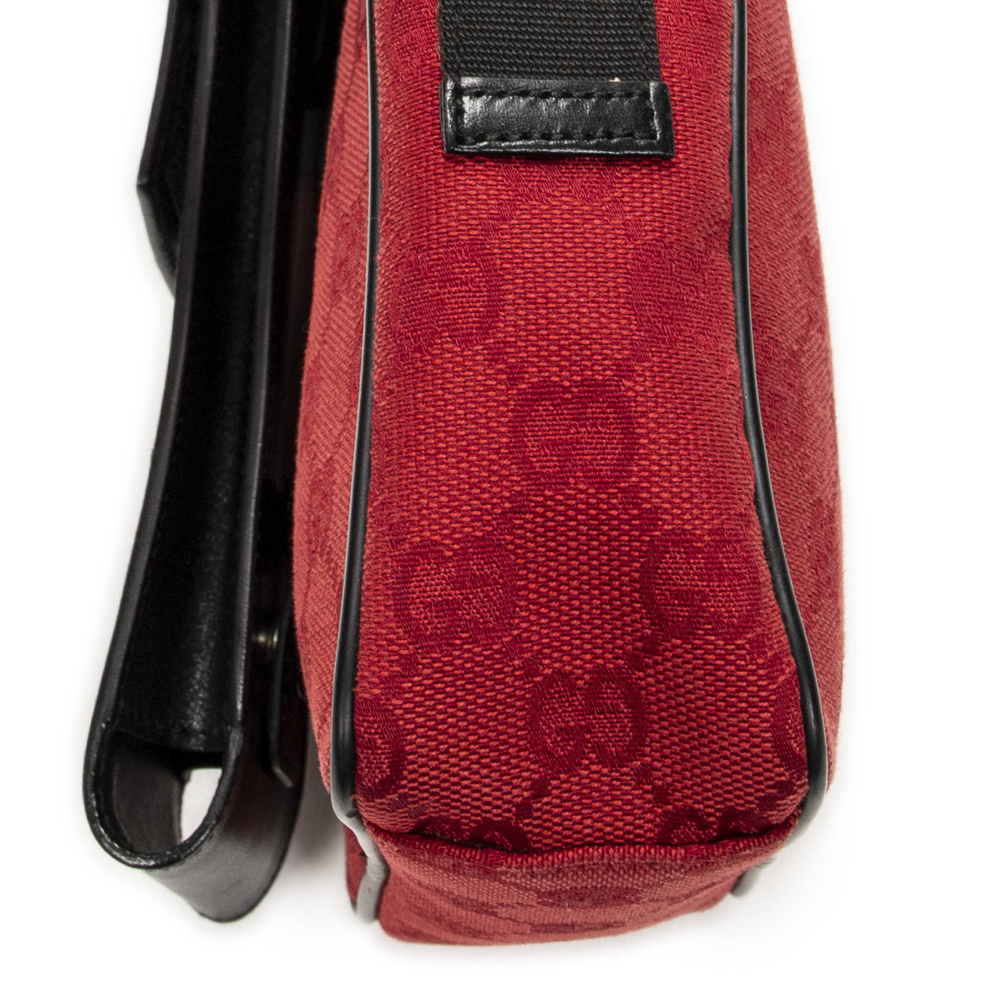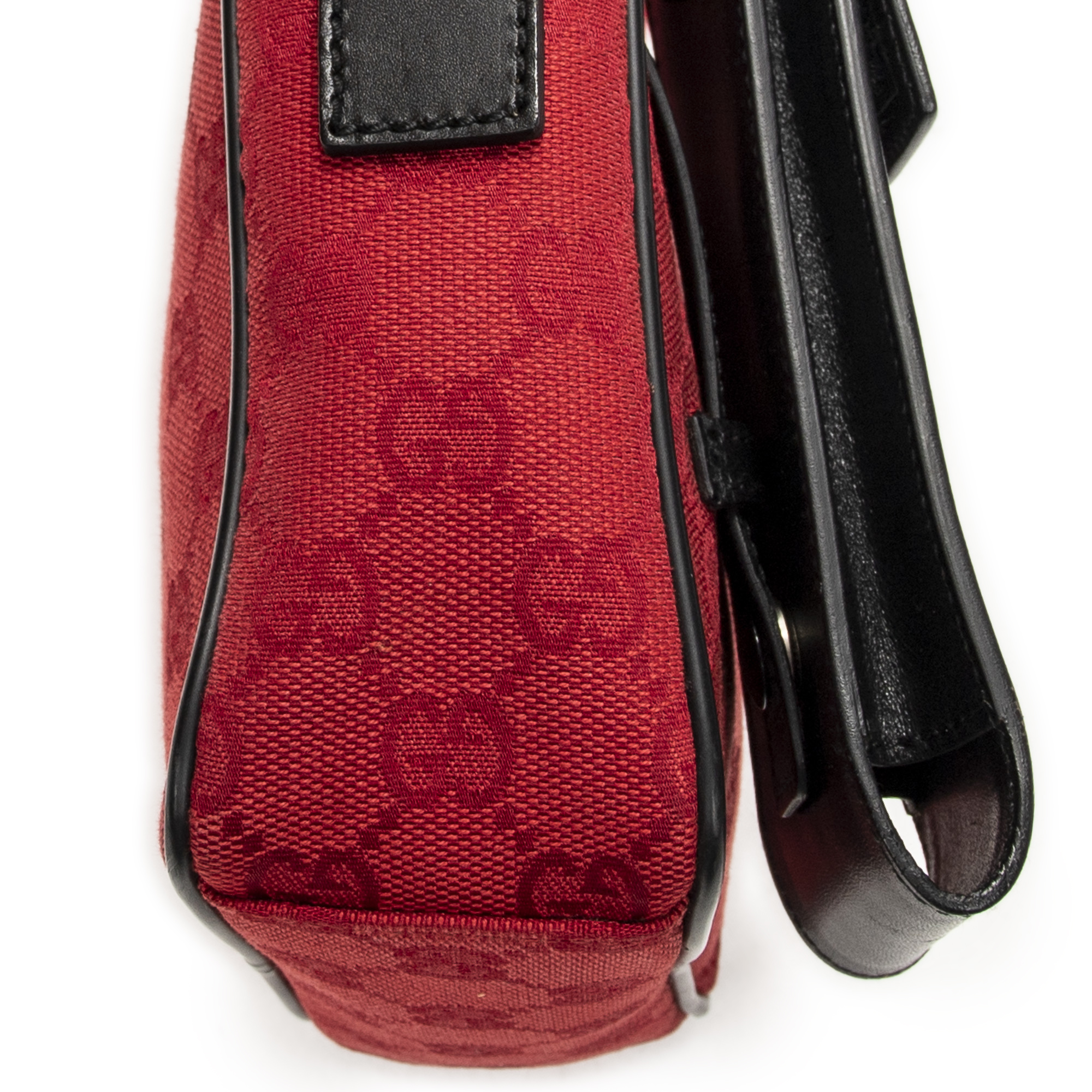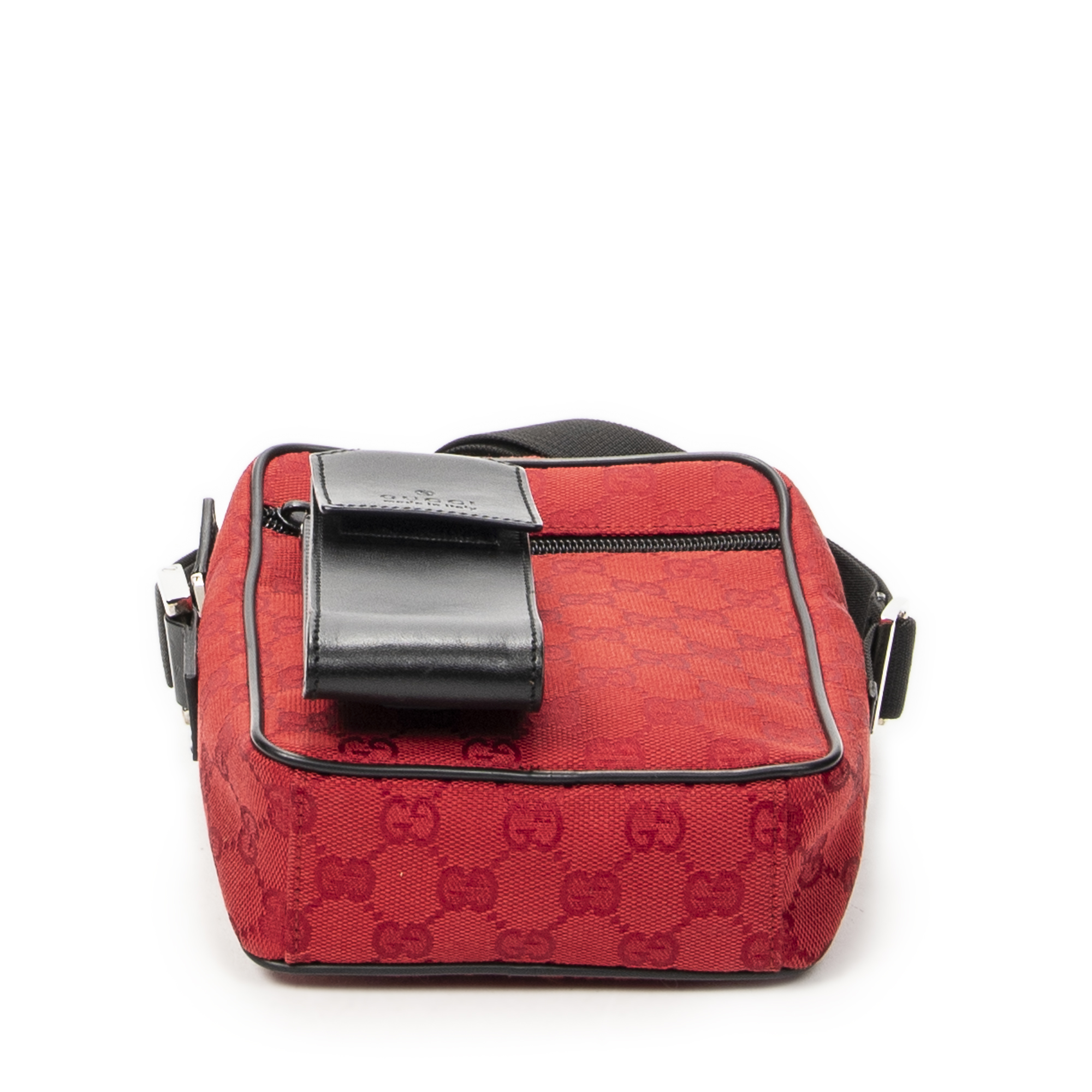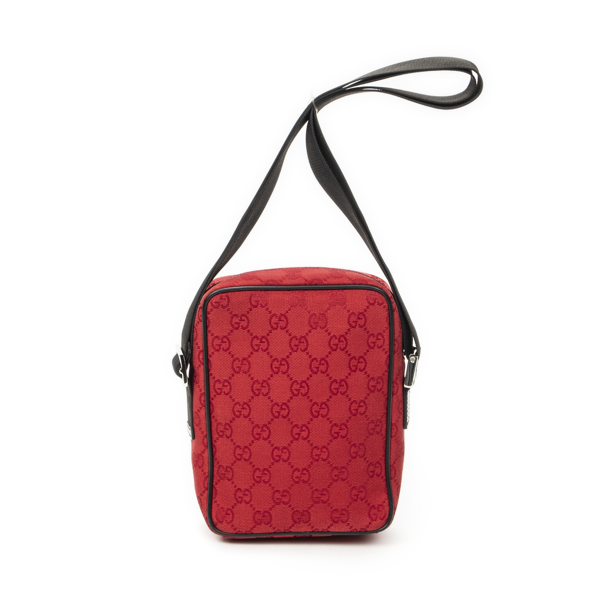 Gucci Shoulder Bag Square Pochette Crossbody in Red/Black Monogrammed Canvas and Silver hardware. The product is in Perfect Condition (AA).