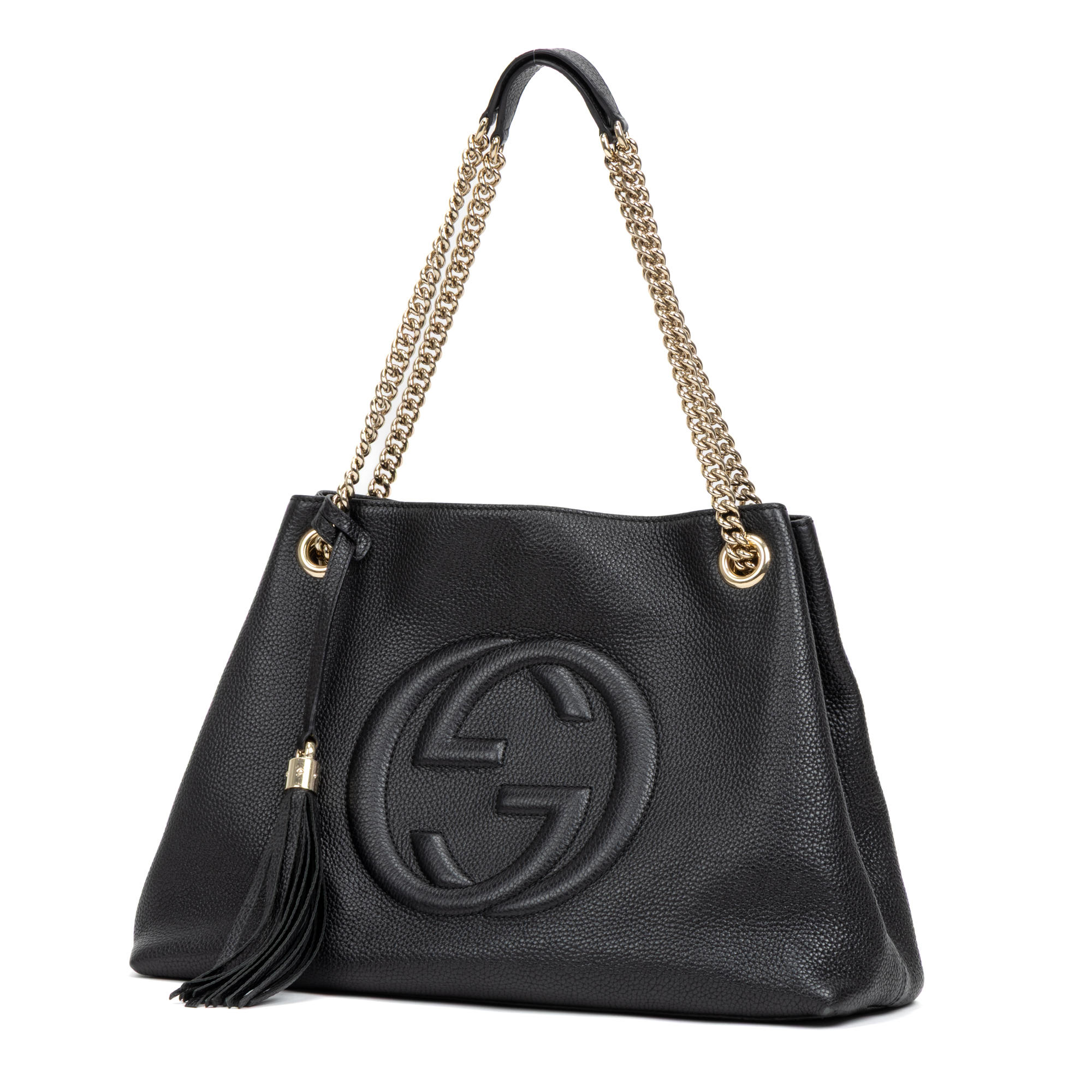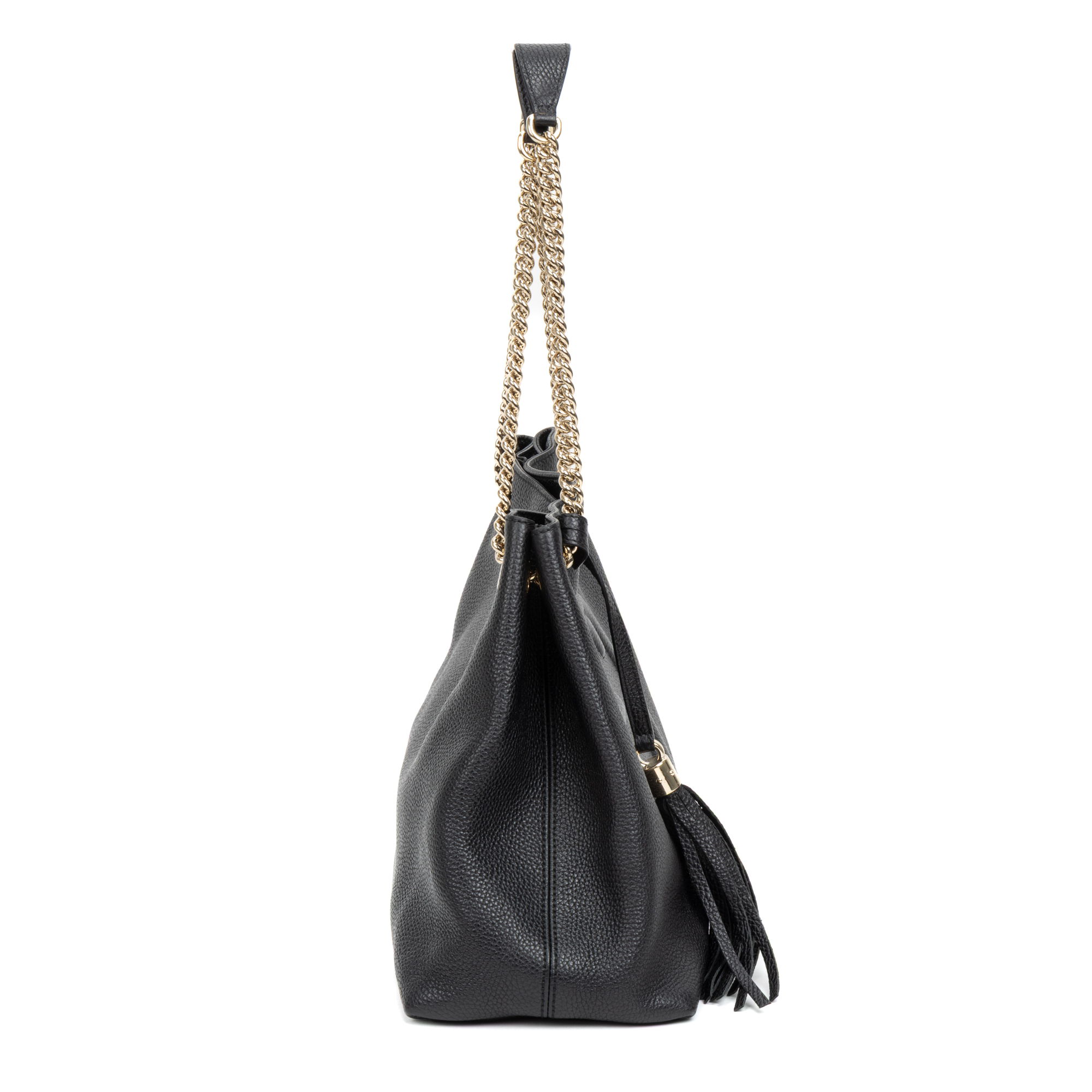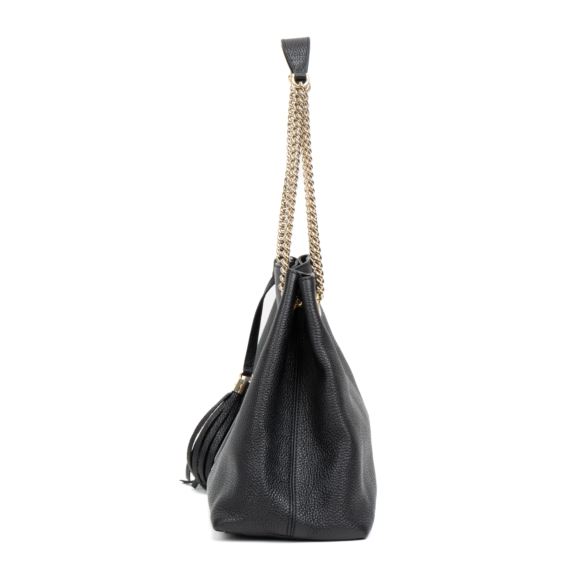 Gucci Shoulder Bag Tassel Soho Chain Shopping Tote Medium in Black Calfskin Leather and Gold hardware. The product is in Perfect Condition (AA).