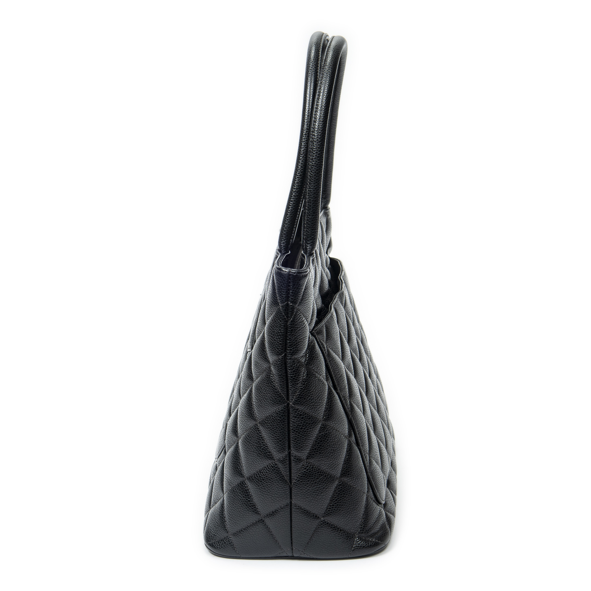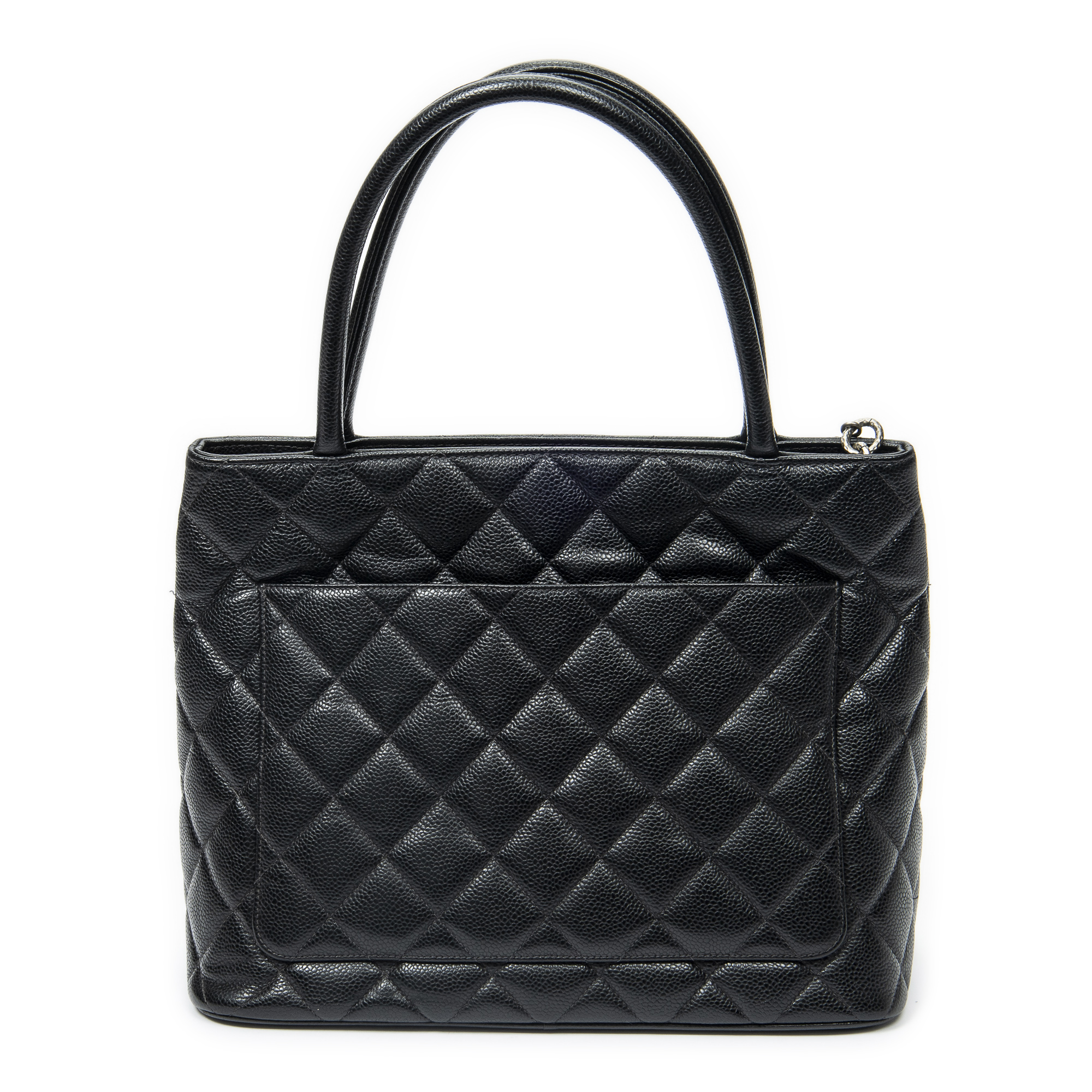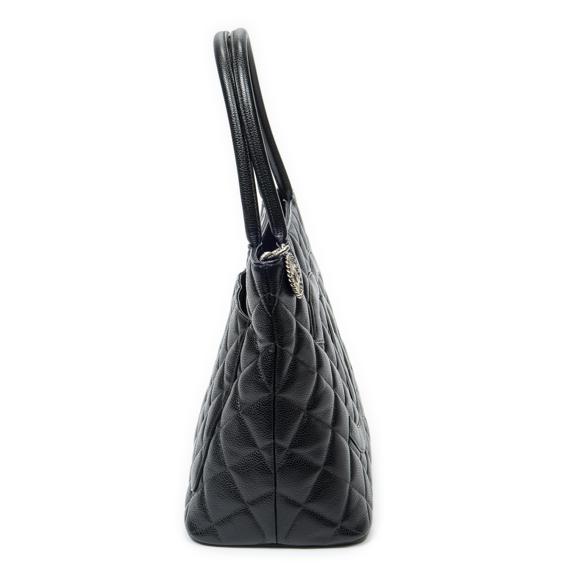 Chanel Shoulder Bag Timeless Medallion Tote in Black Quilted Caviar Leather and Silver hardware. The product is in Excellent Condition (A).