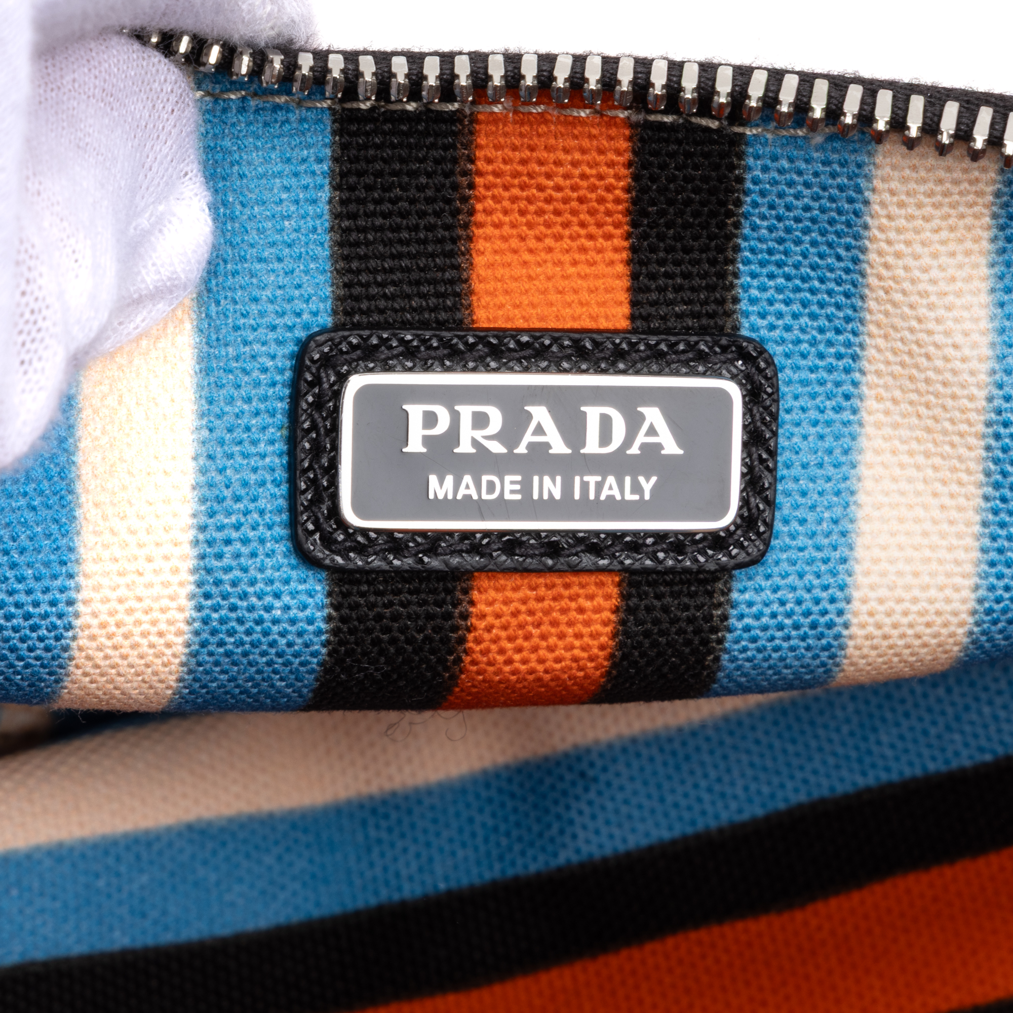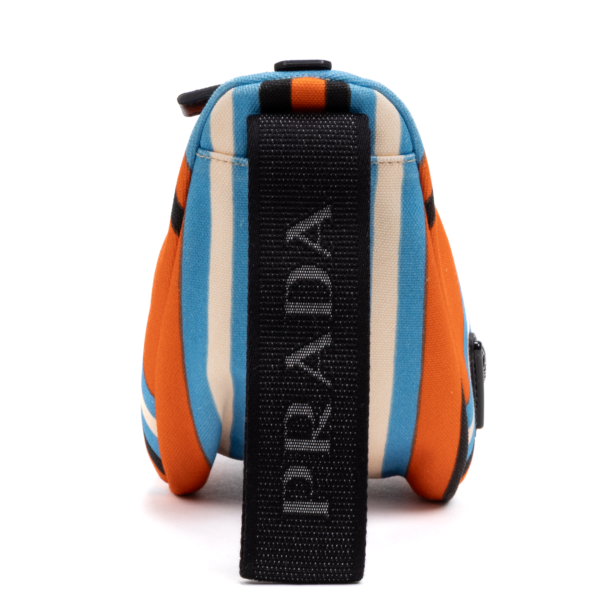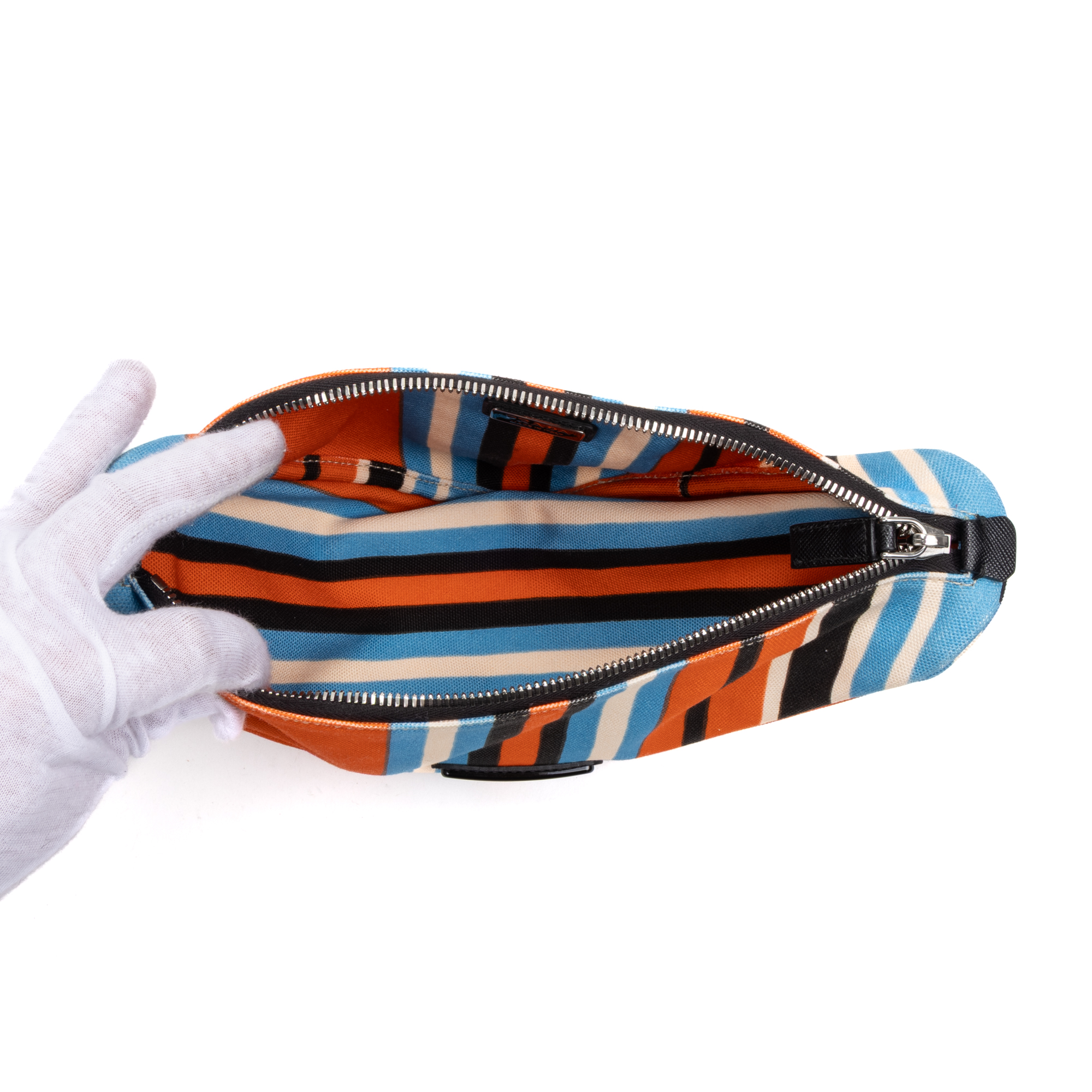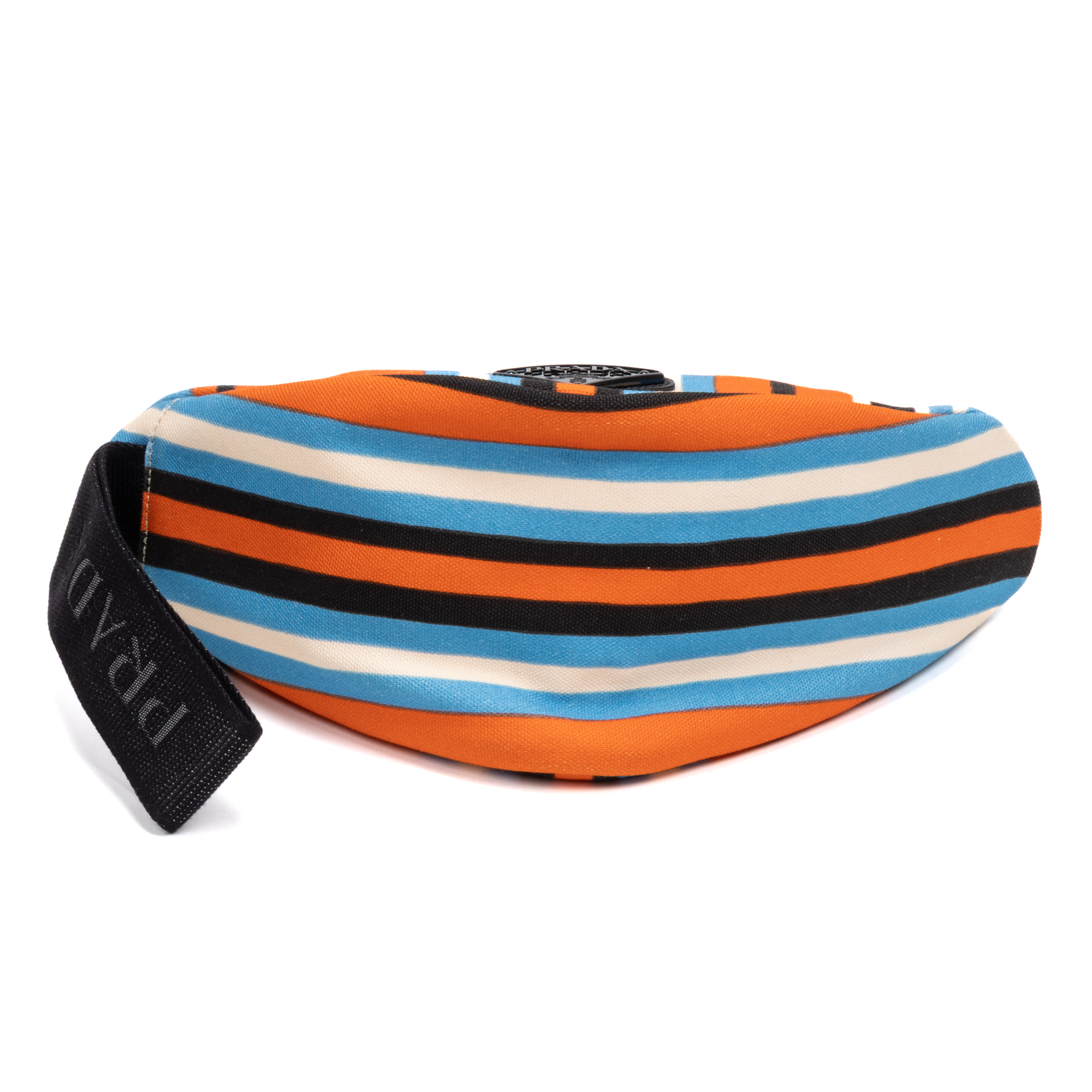 Prada Shoulder Bag Triangle Logo Zip Crossbody in Orange Printed Canvas and Silver hardware. The product is in Excellent Condition (A).