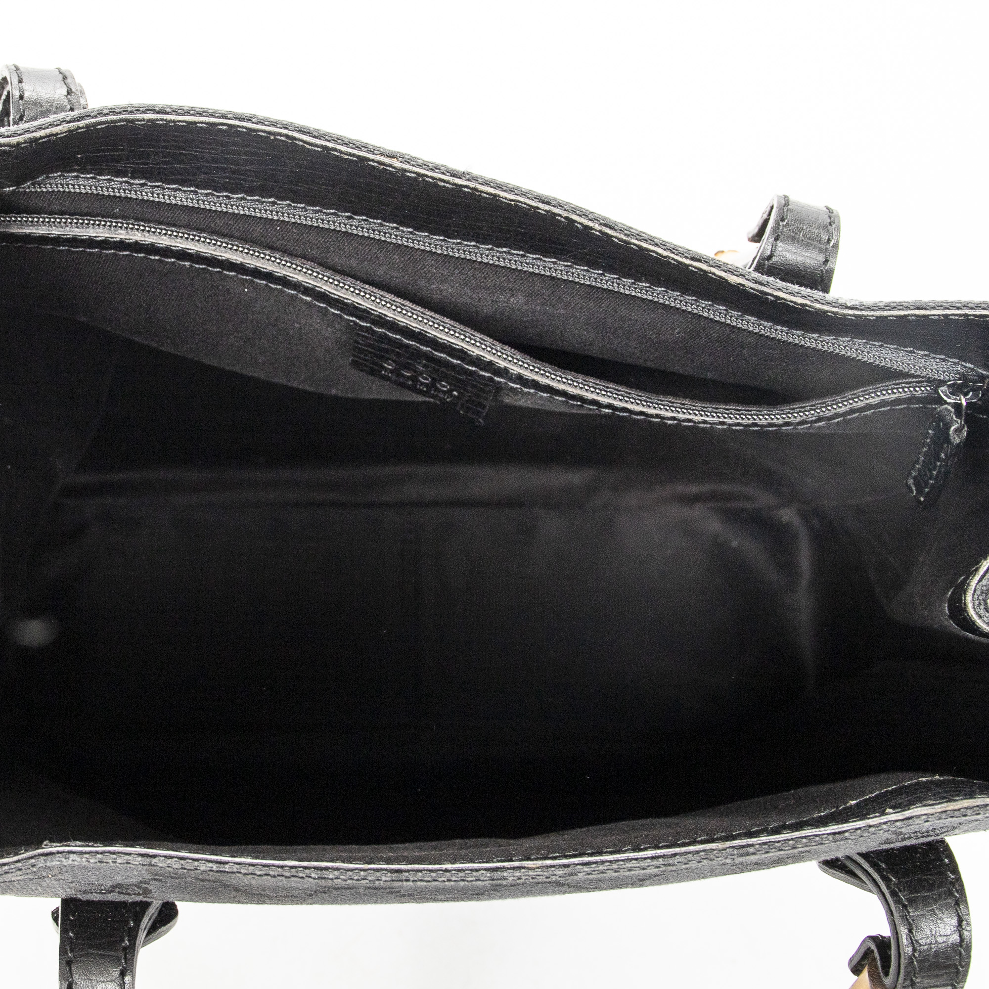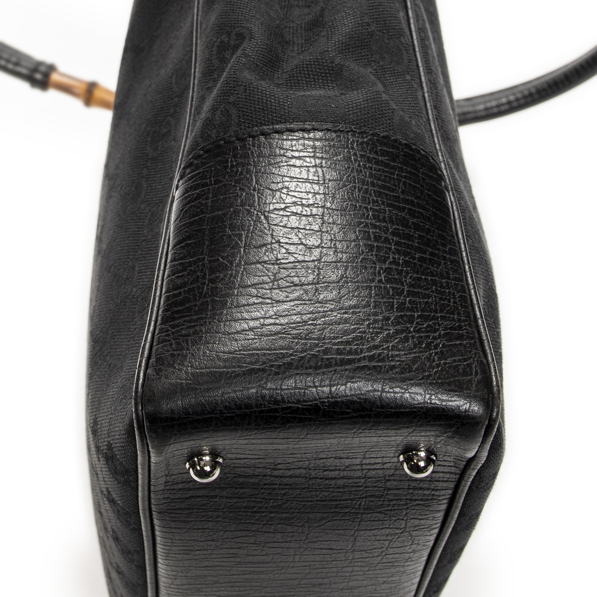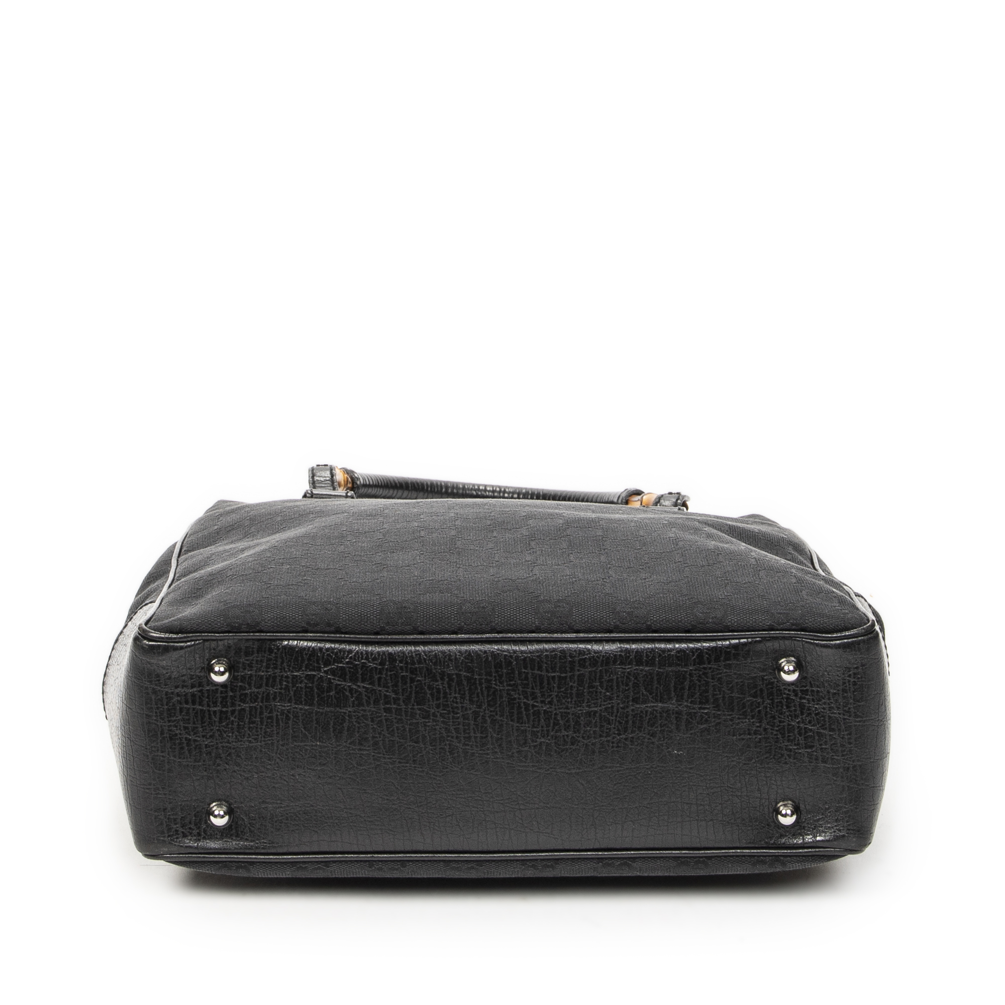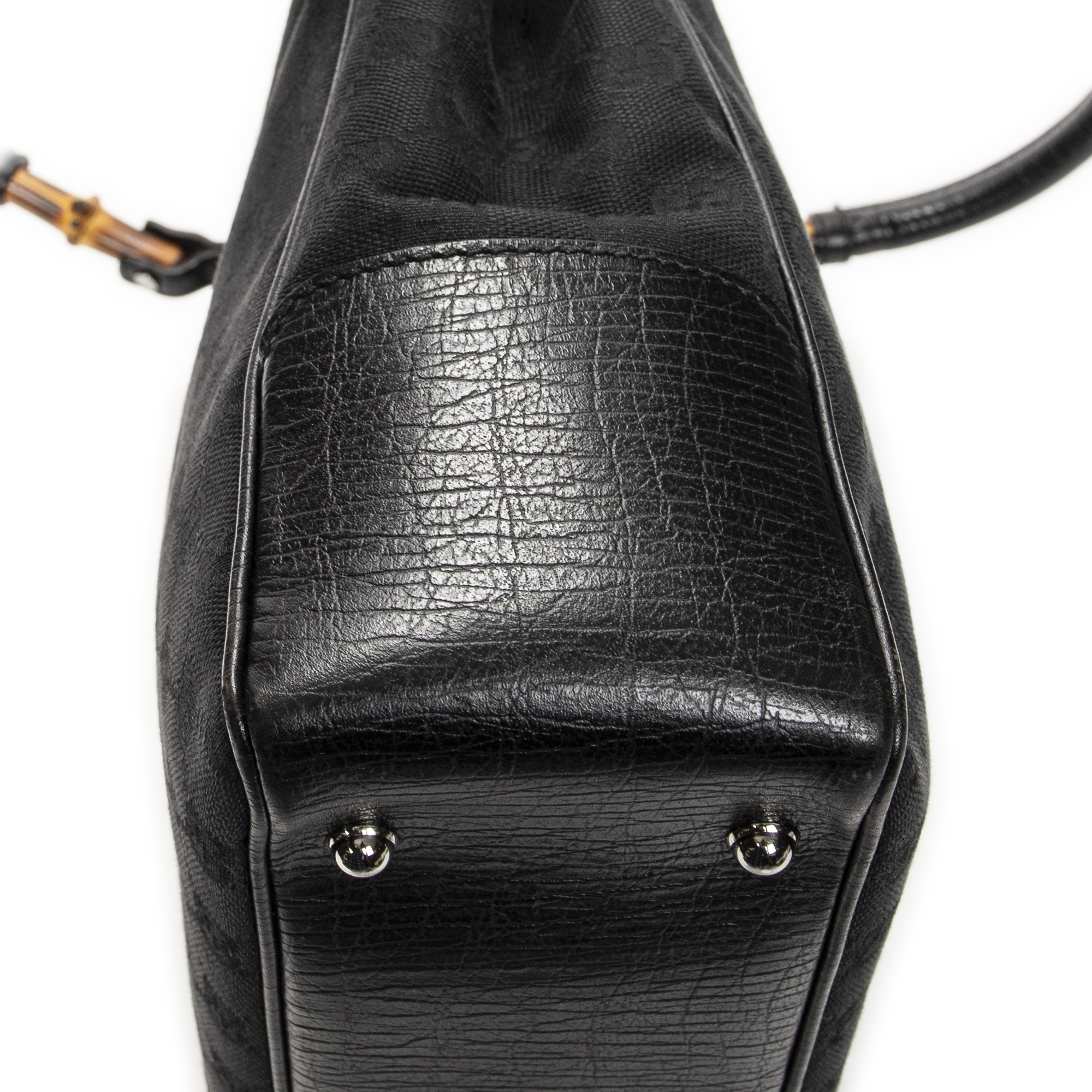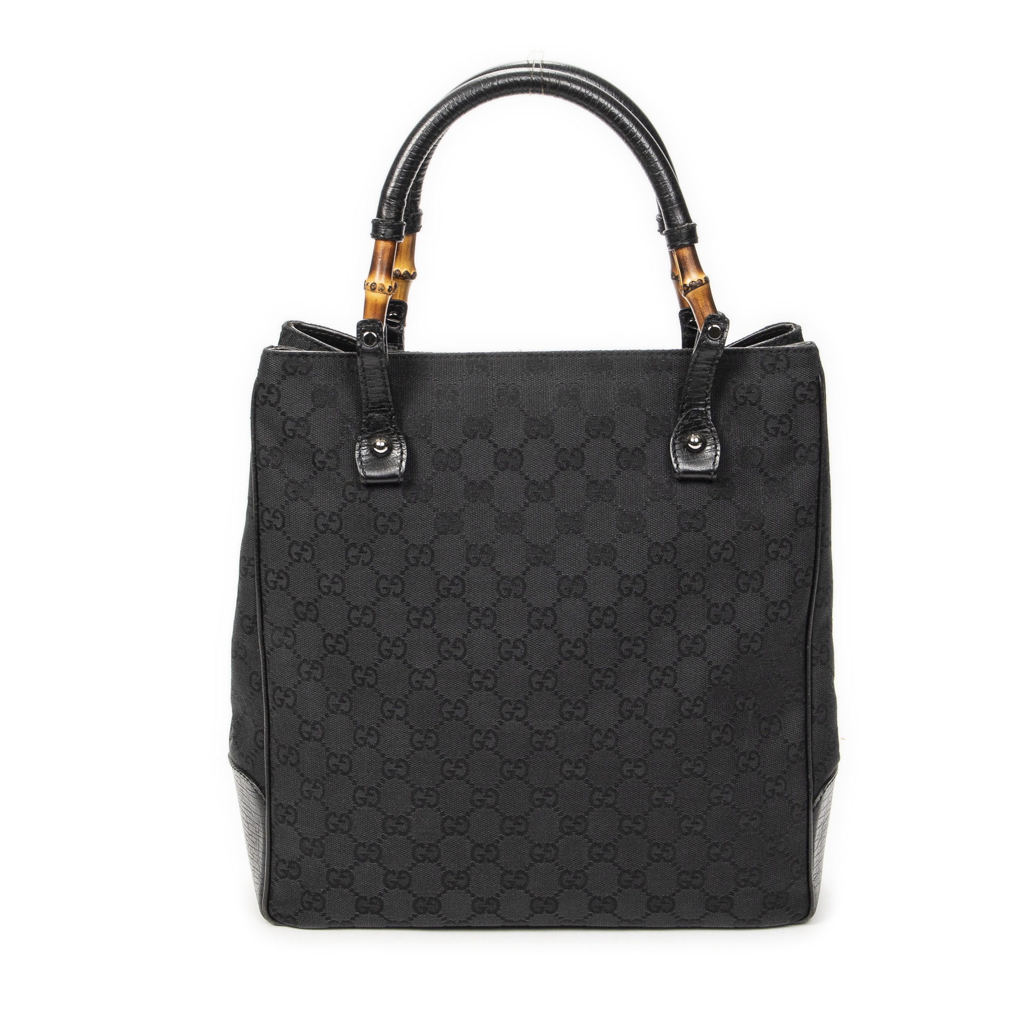 Gucci Shoulder Bag Vertical Bamboo Classic Tote in Black Monogrammed Canvas and Silver hardware. The product is in Excellent Condition (A).