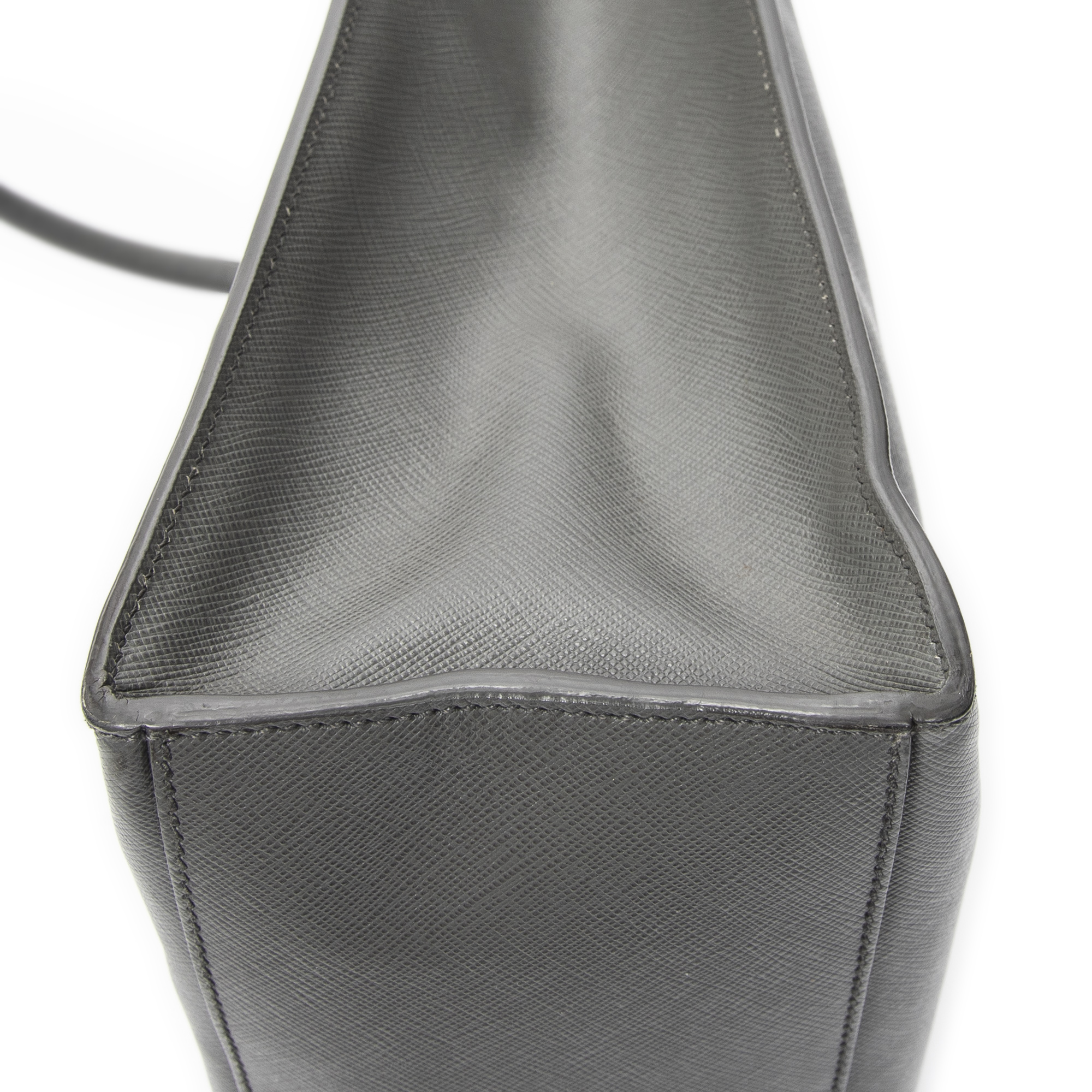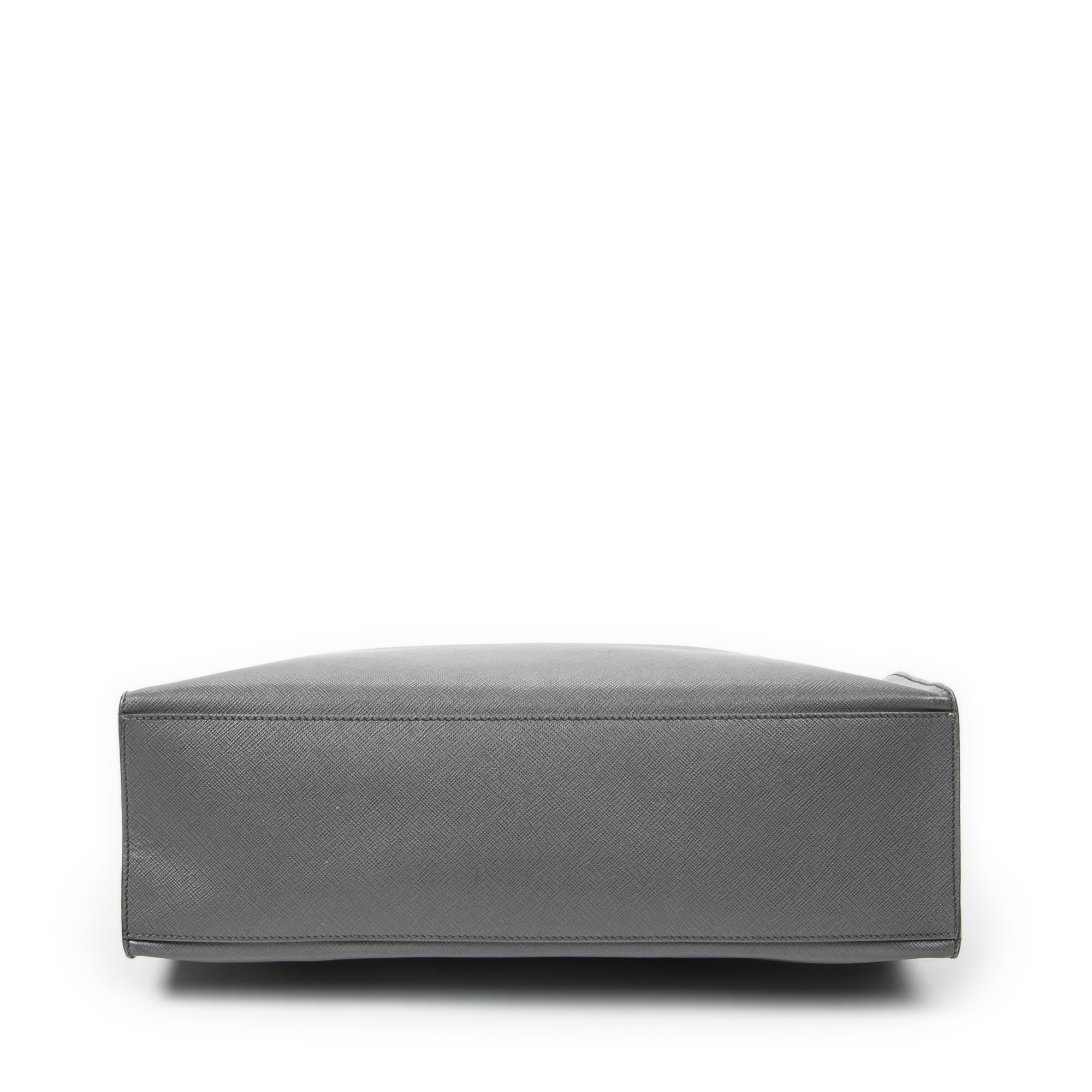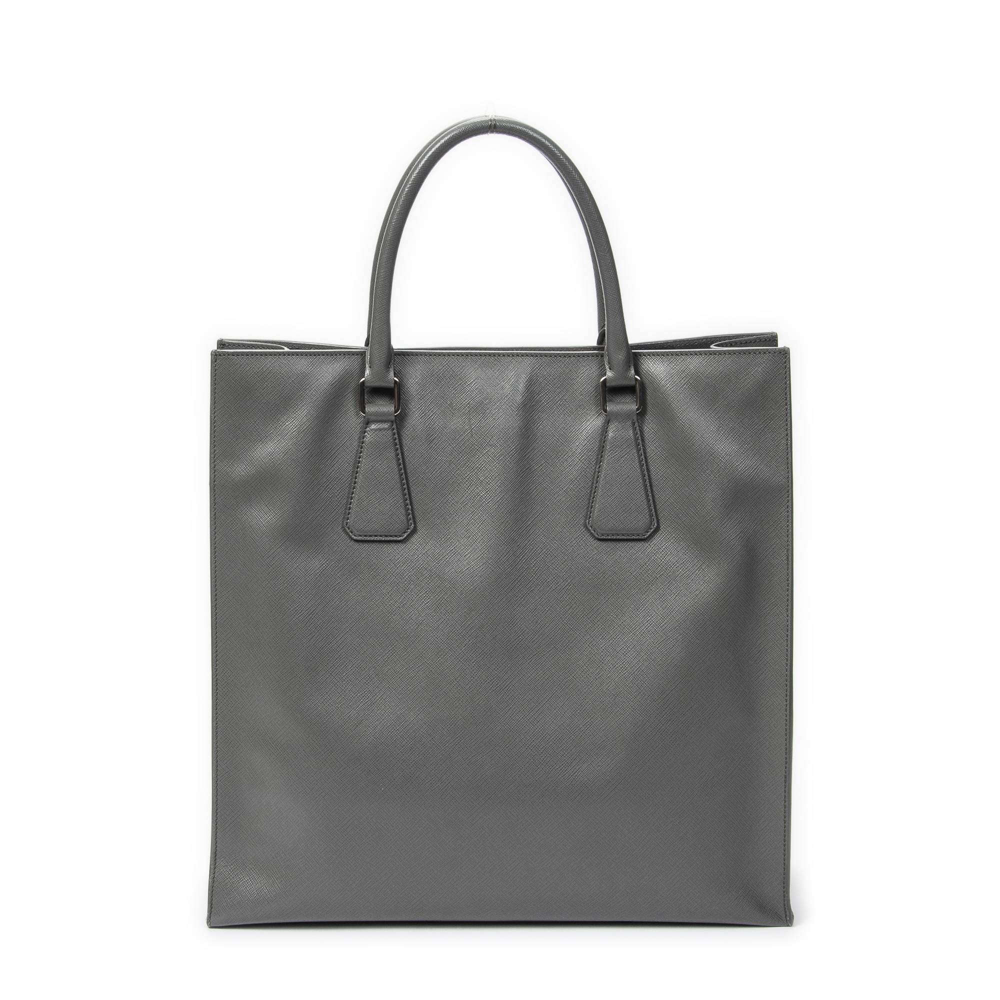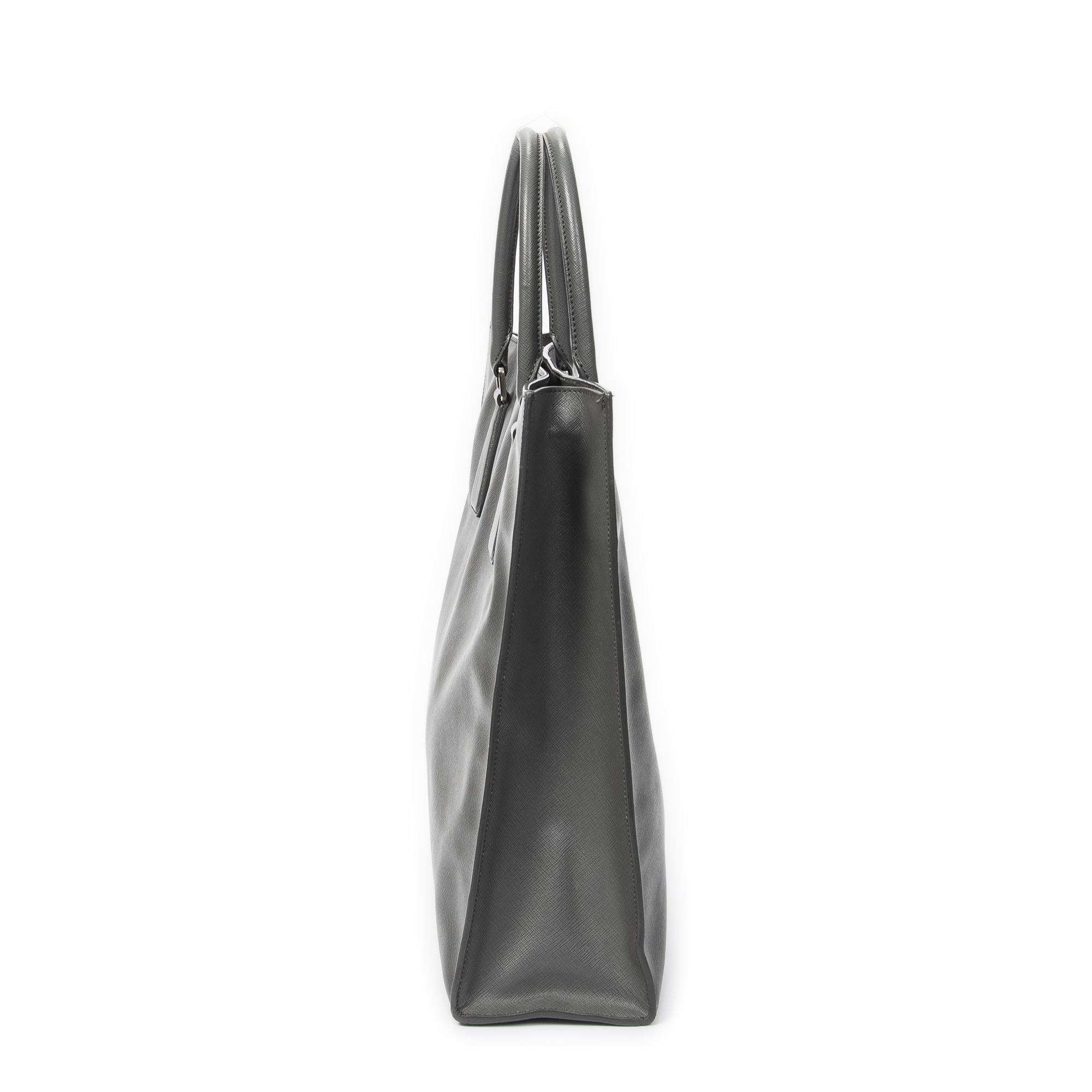Prada Shoulder Bag Vertical Business Tote in Grey Saffiano Leather and Silver hardware. The product is in Excellent Condition (A).