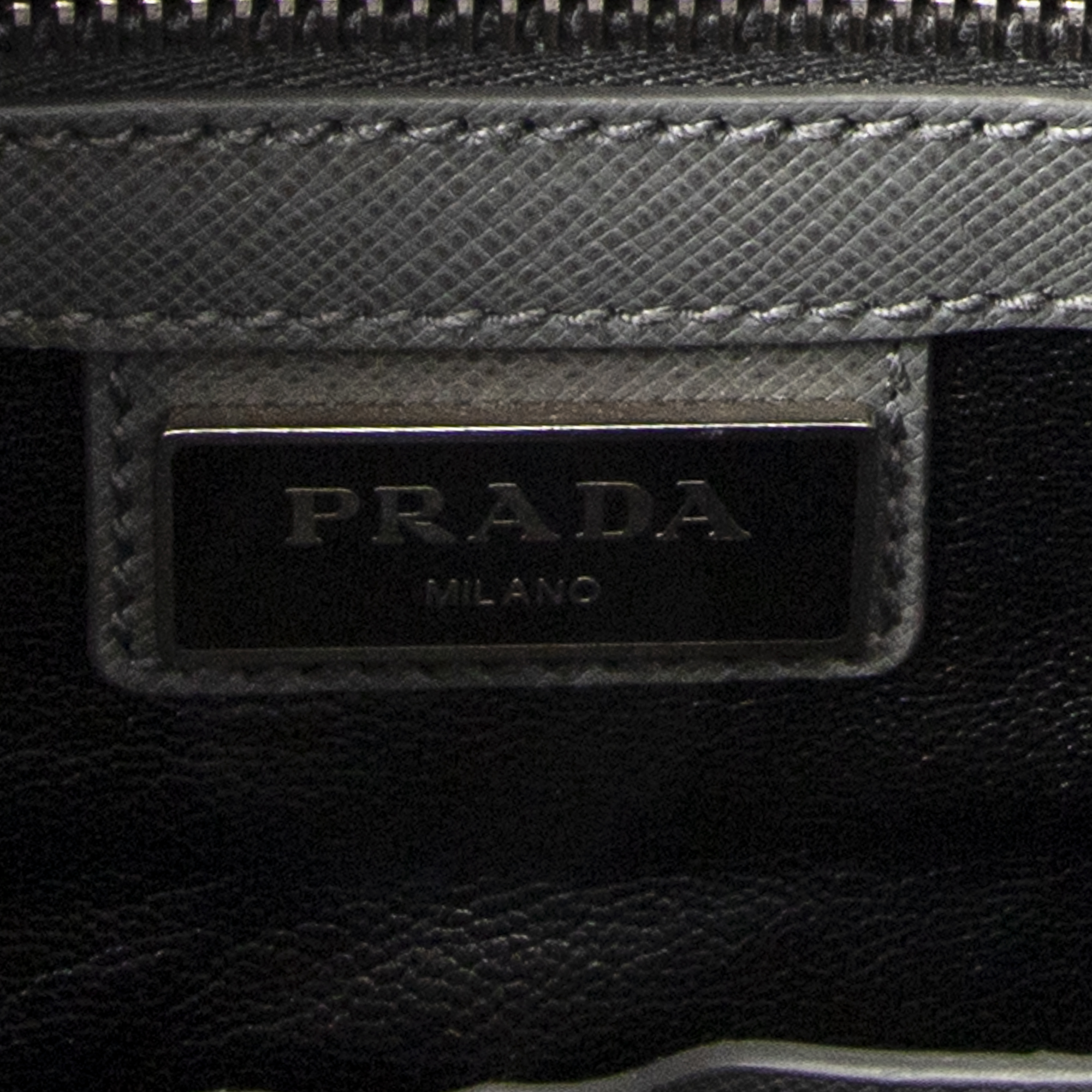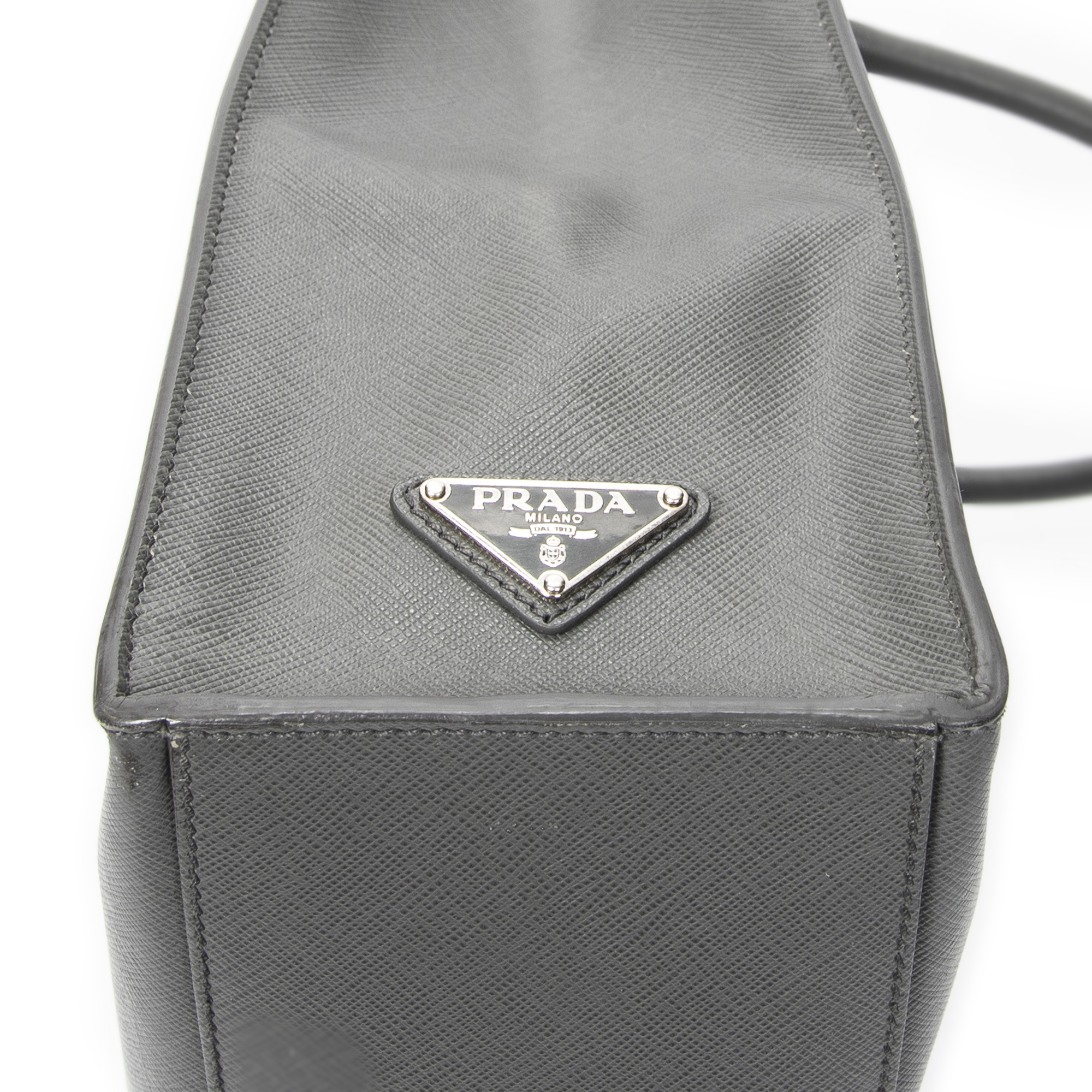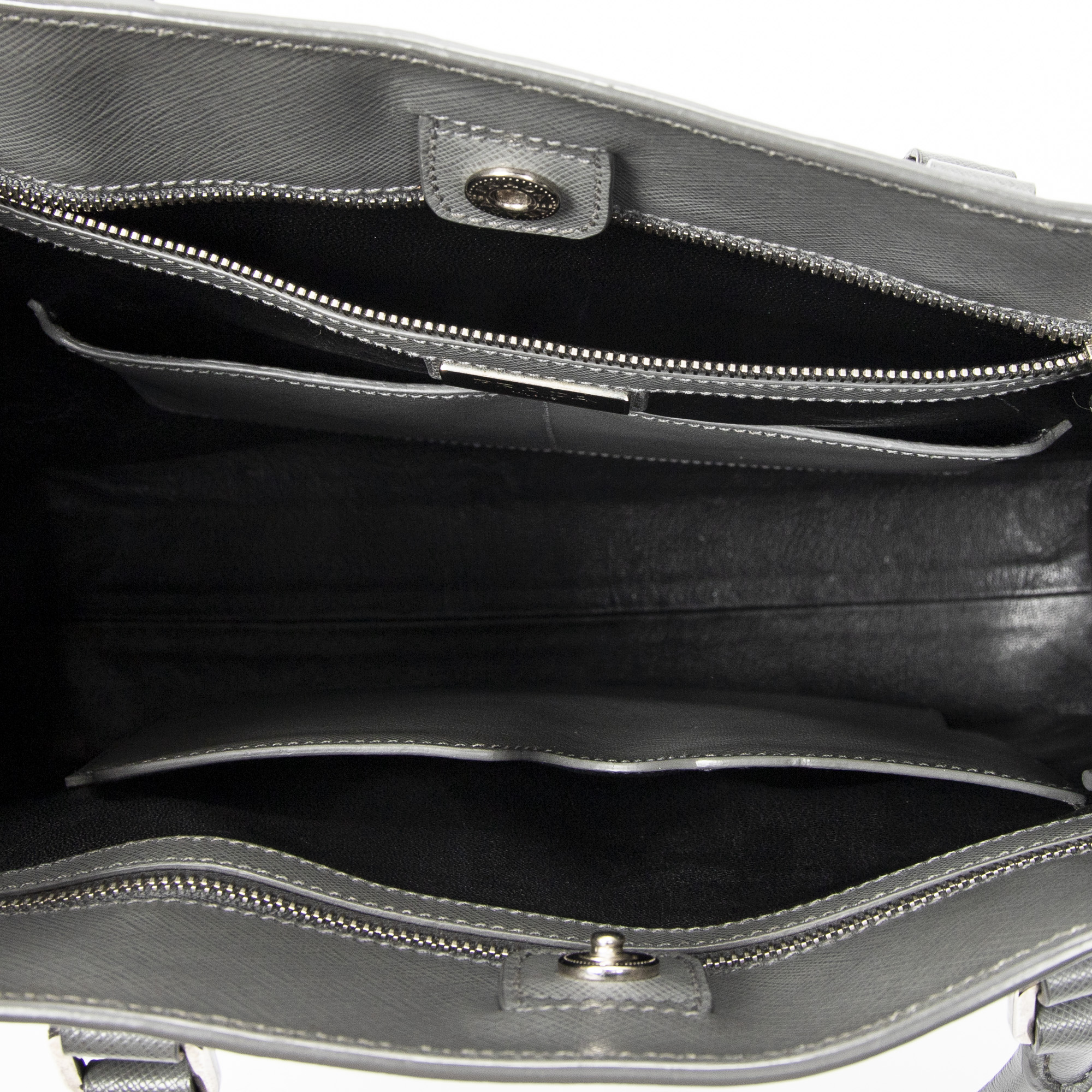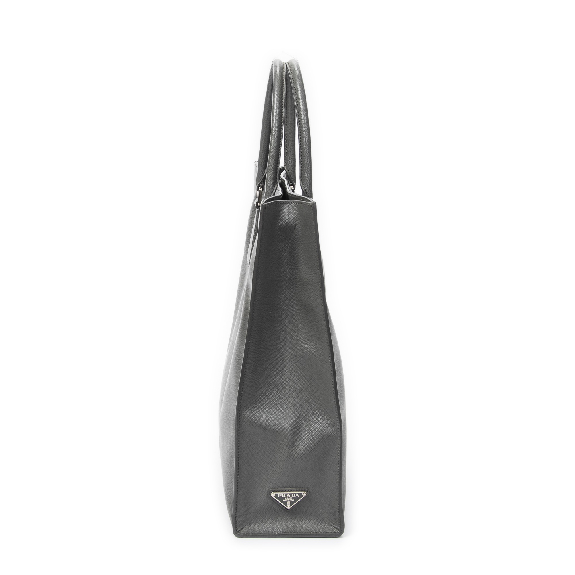 Prada Shoulder Bag Vertical Business Tote in Grey Saffiano Leather and Silver hardware. The product is in Excellent Condition (A).