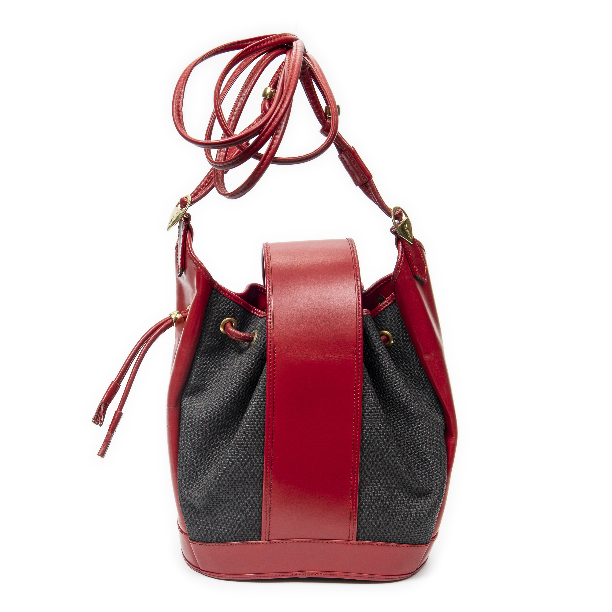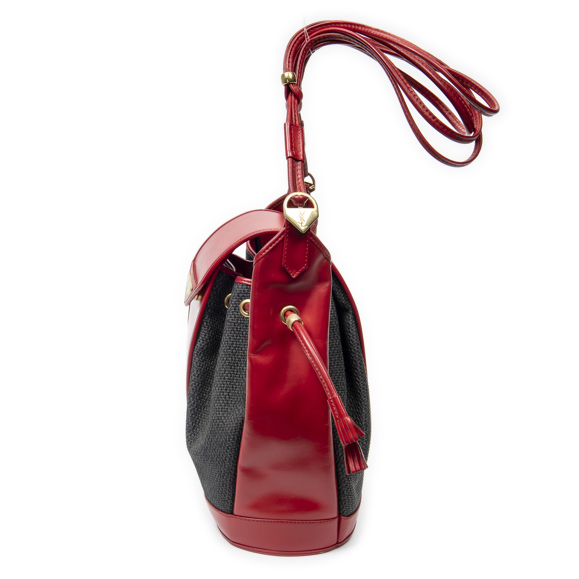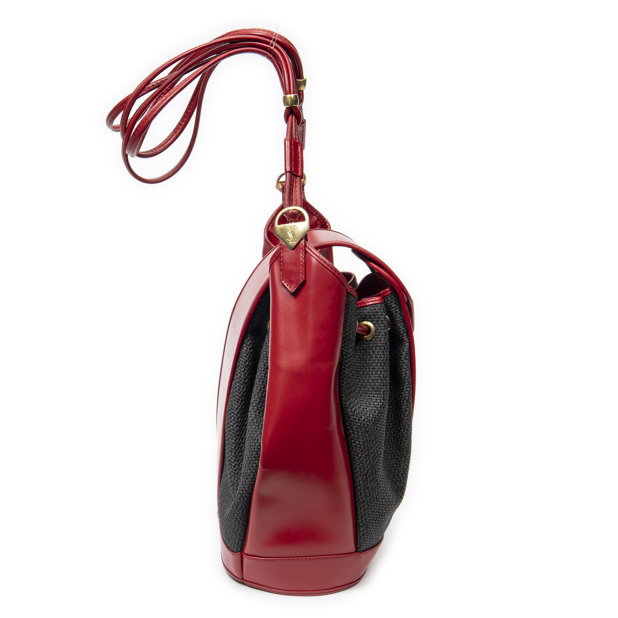 Yves Saint Laurent Shoulder Bag Vintage Drawstring Bucket in Red/Grey Woven Coated Canvas and Gold hardware. The product is in Very Good Condition (AB).