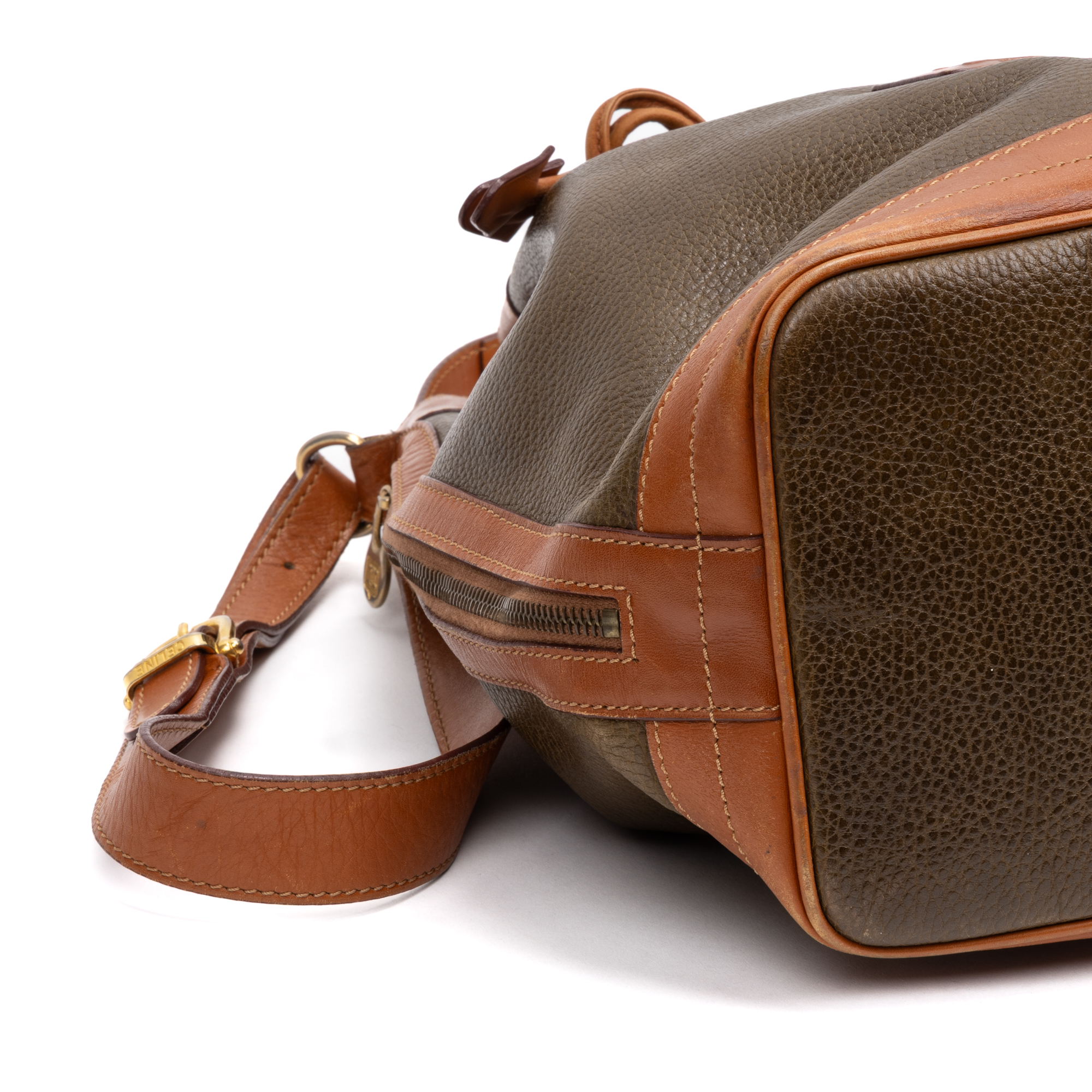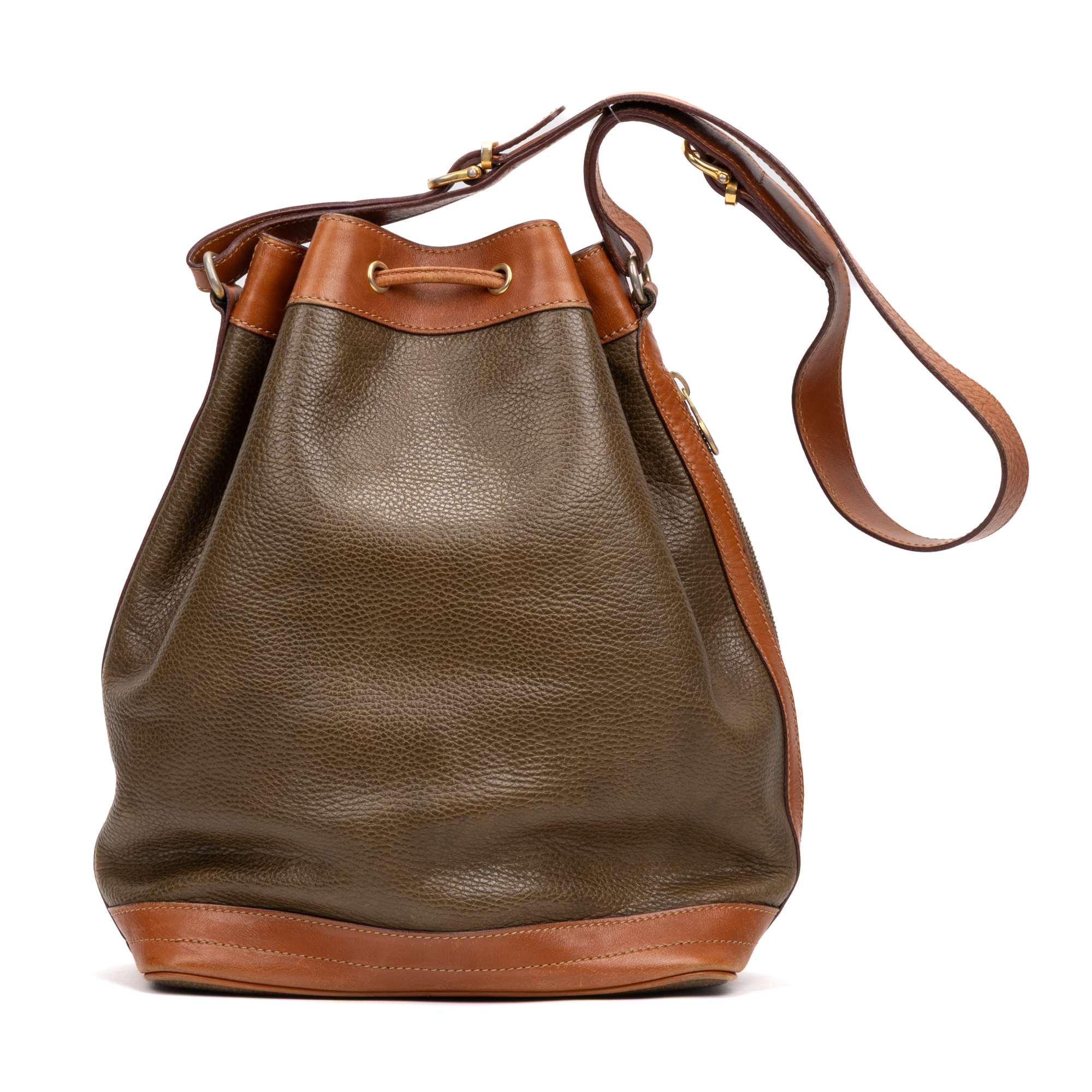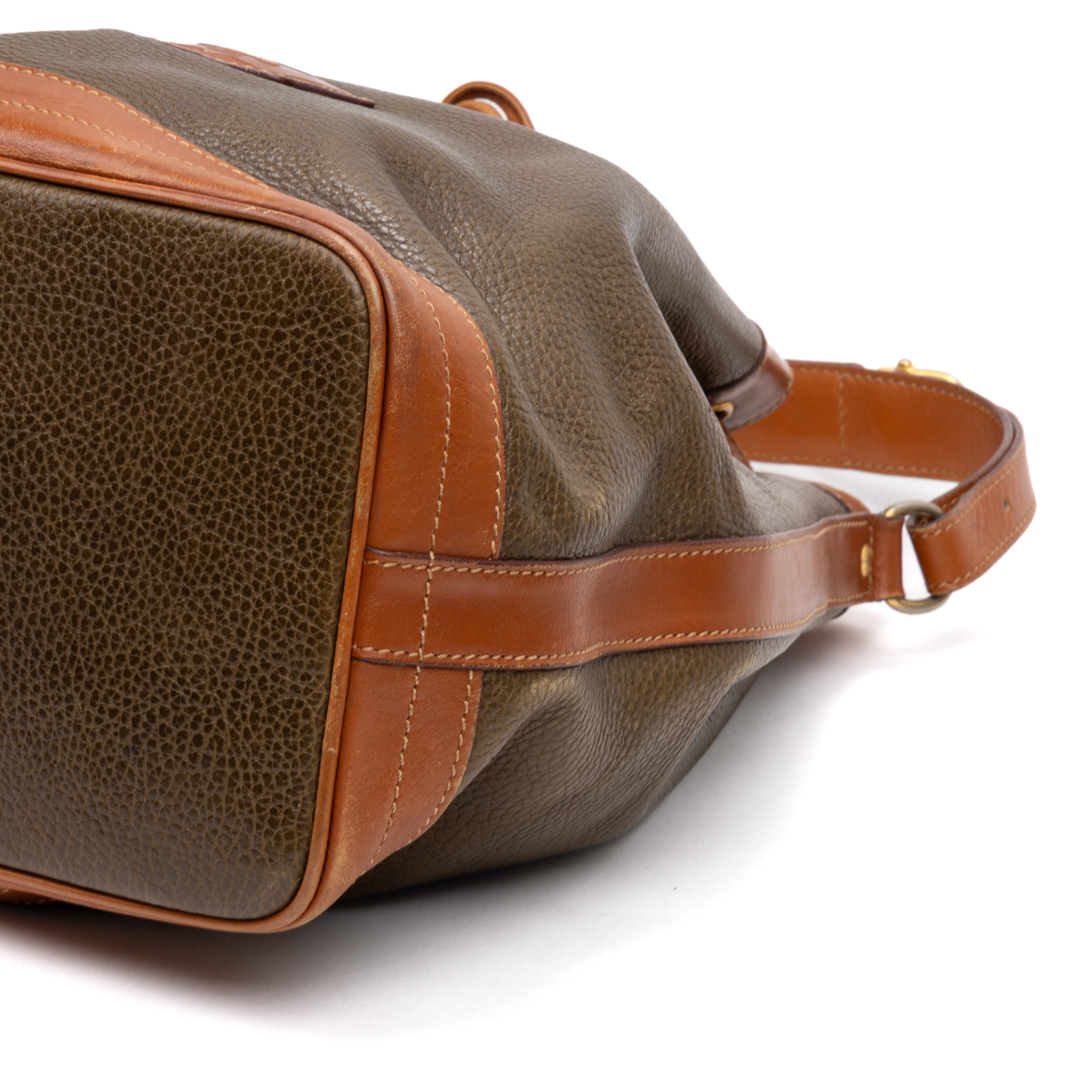 Celine Shoulder Bag Vintage Drawstring Bucket in Green Calfskin Leather and Gold hardware. The product is in Excellent Condition (A).