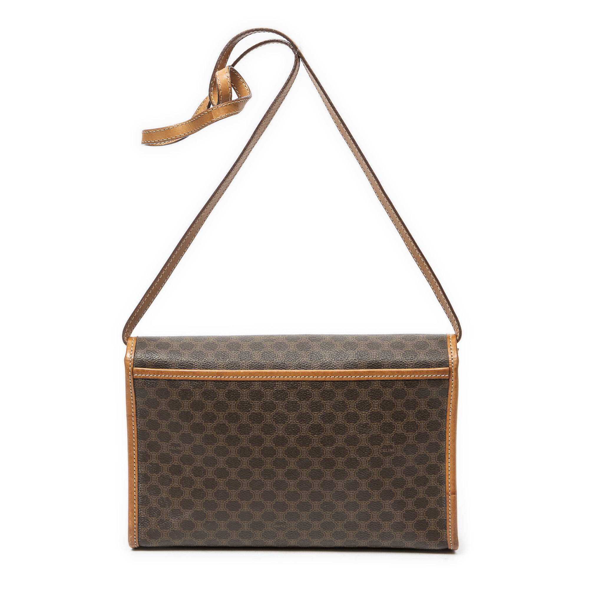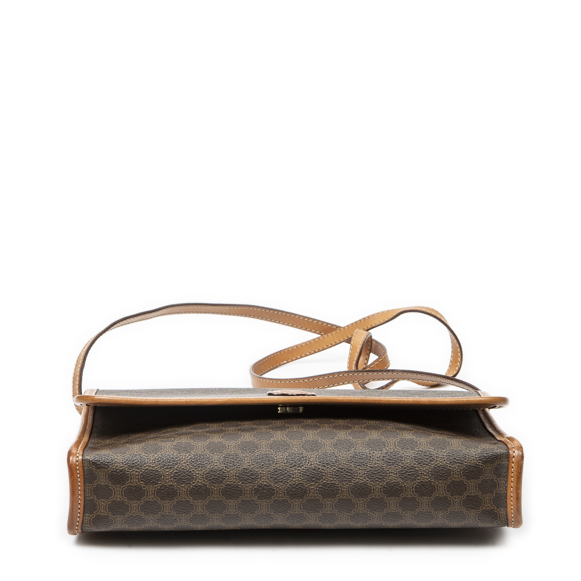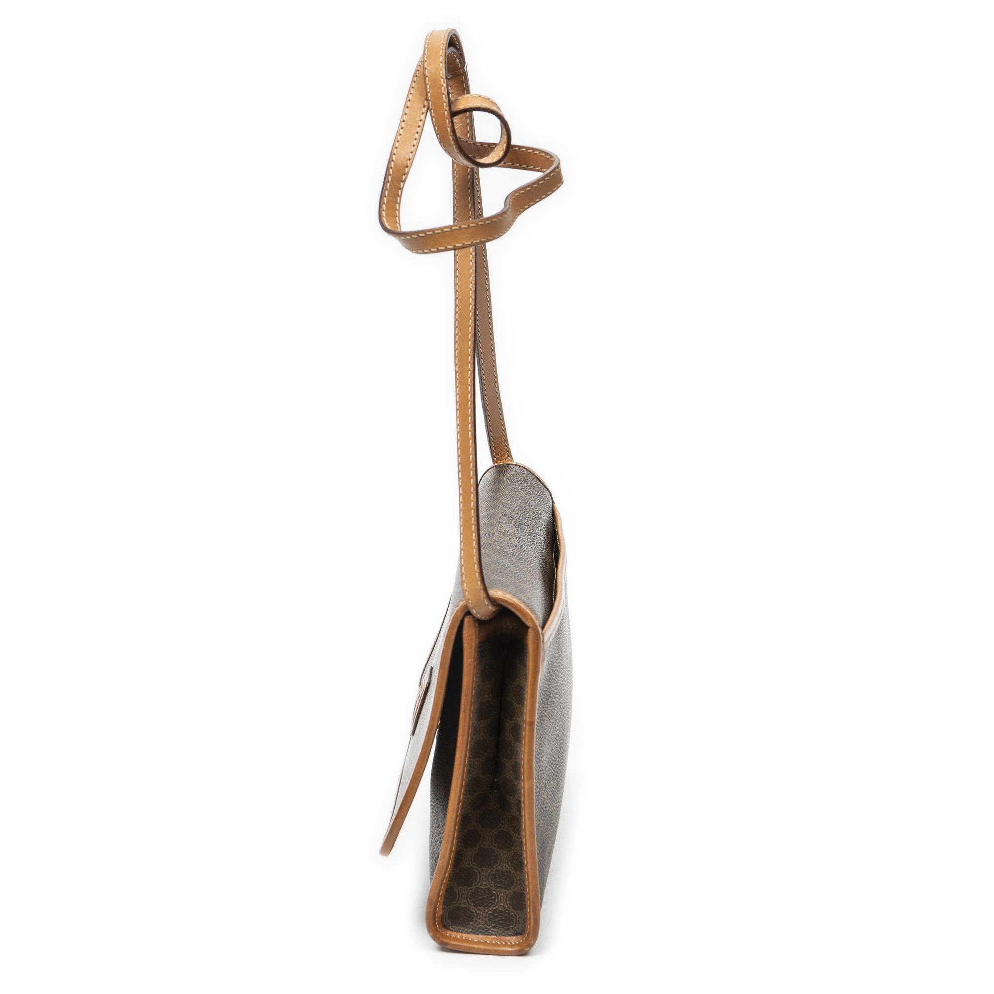 Celine Shoulder Bag Vintage Flap Crossbody in Brown Macadam Coated Canvas and Gold hardware. The product is in Excellent Condition (A).