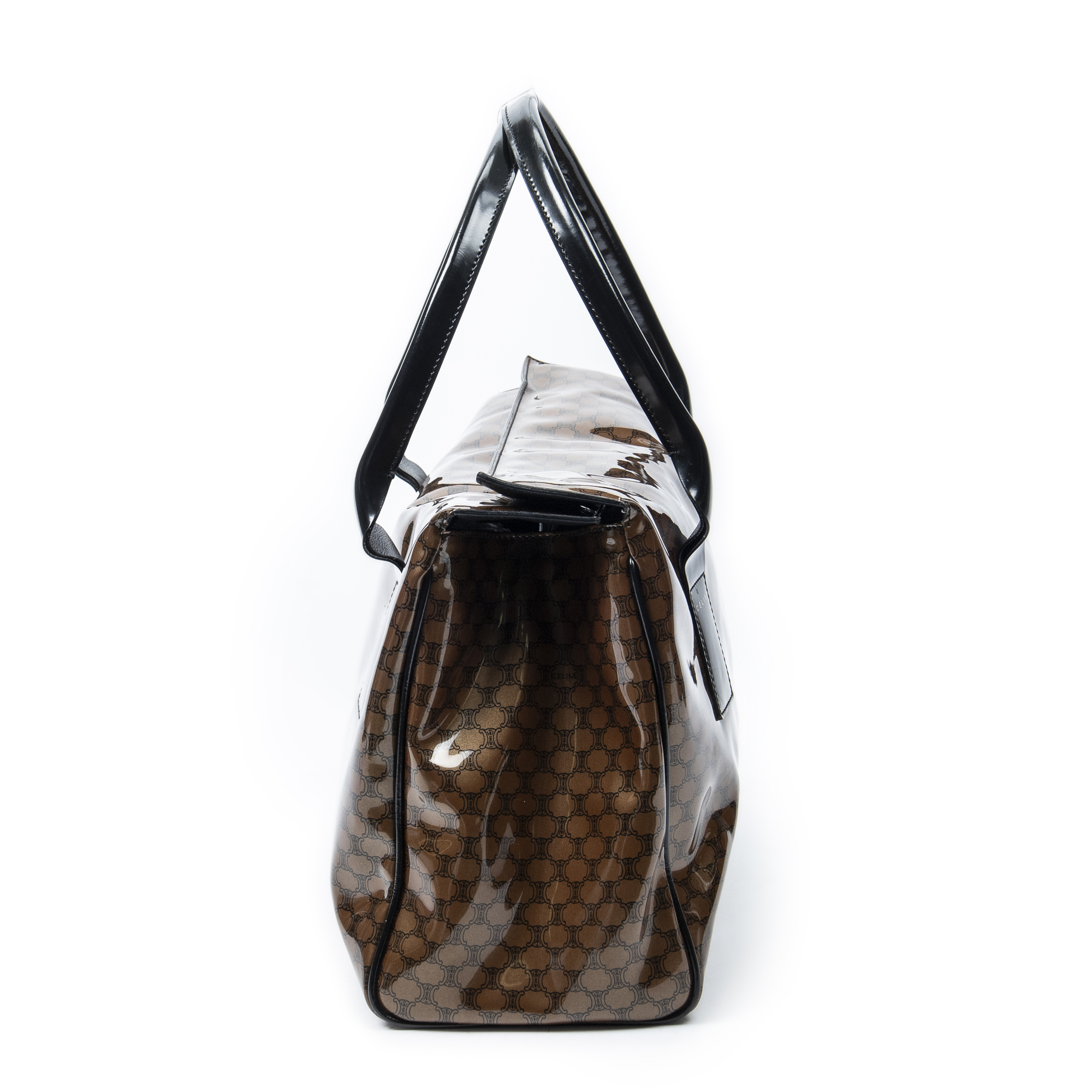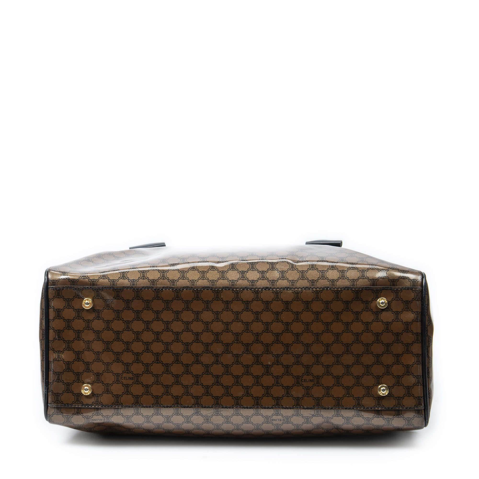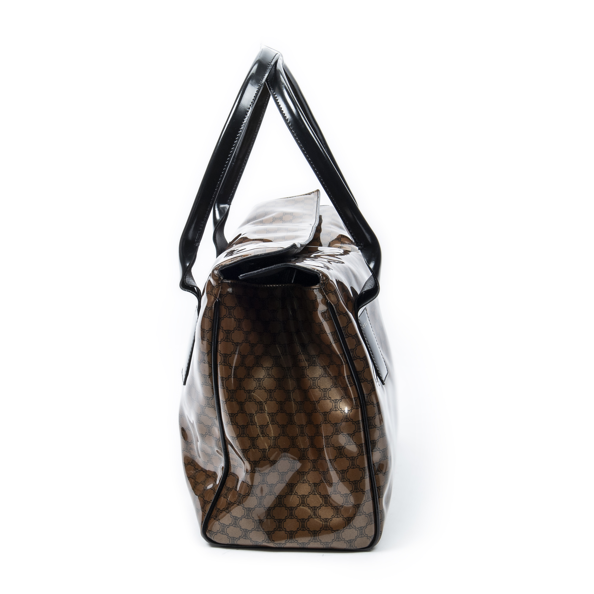 Celine Shoulder Bag Vintage Fold Over Top Tote in Brown/Black Macadam Patent Leather and Gold hardware. The product is in Excellent Condition (A).