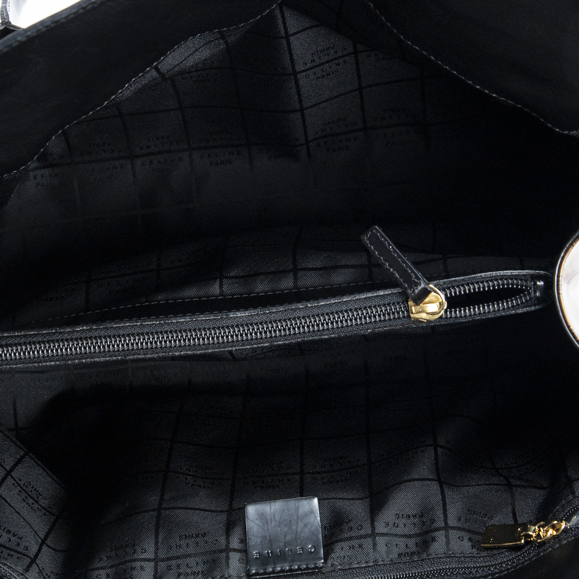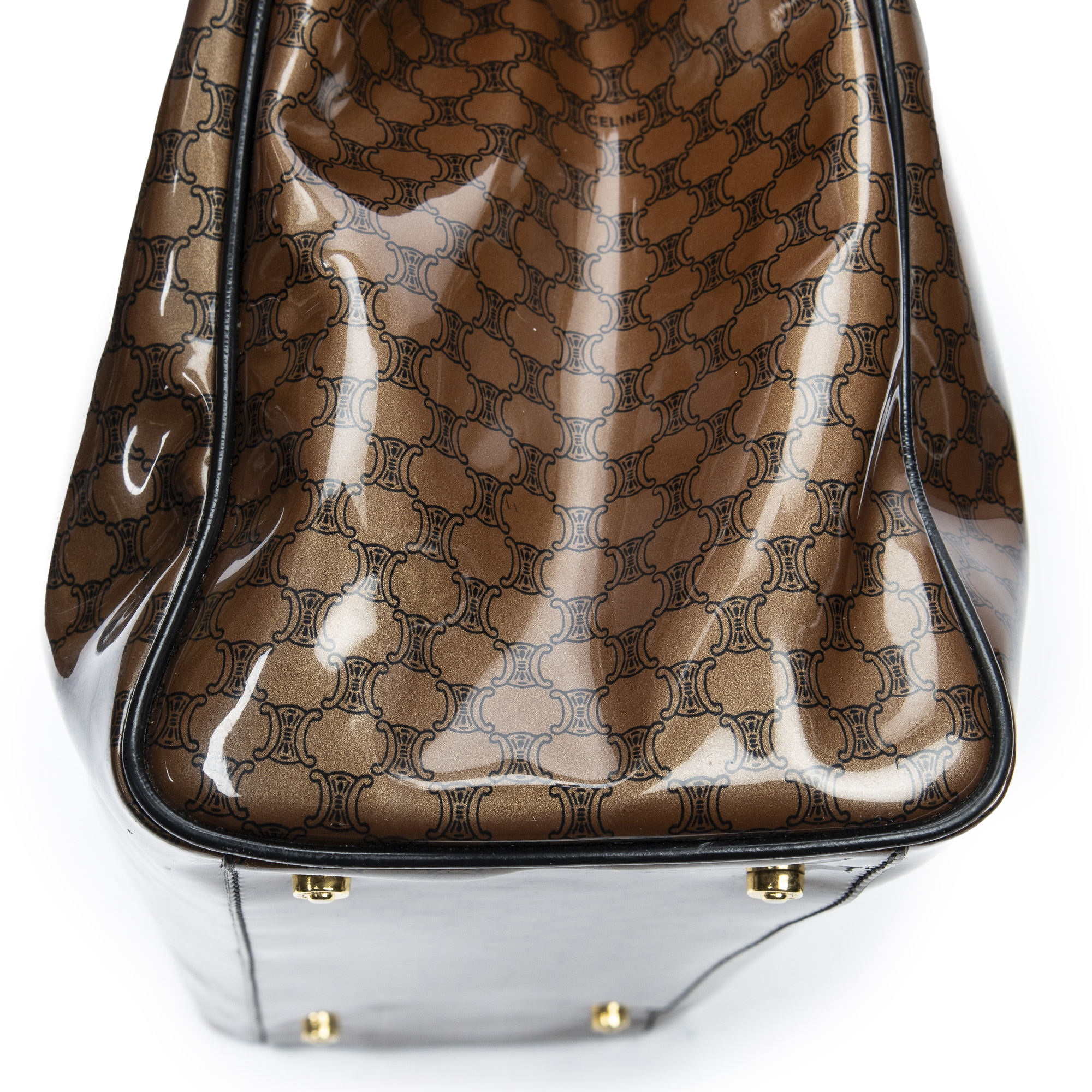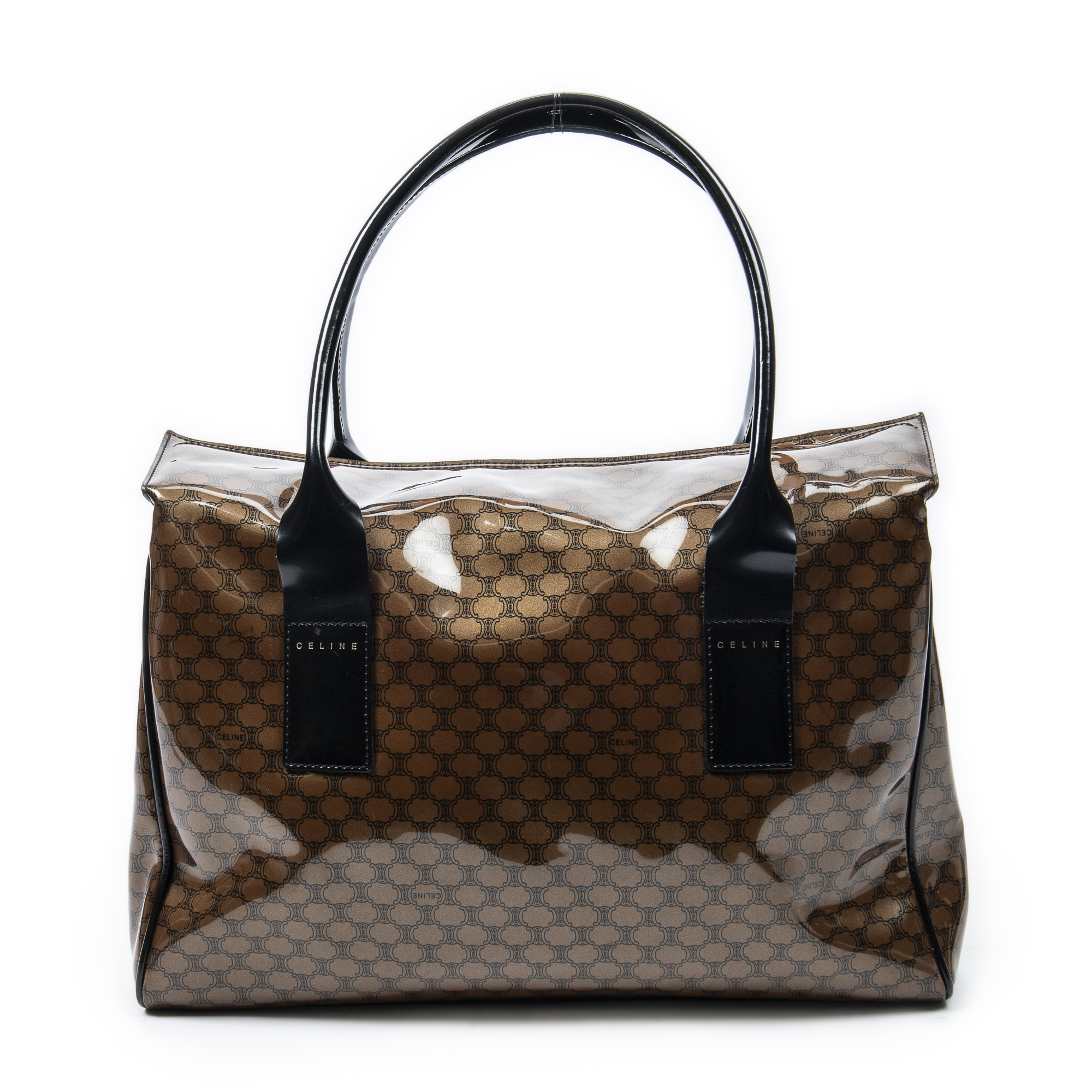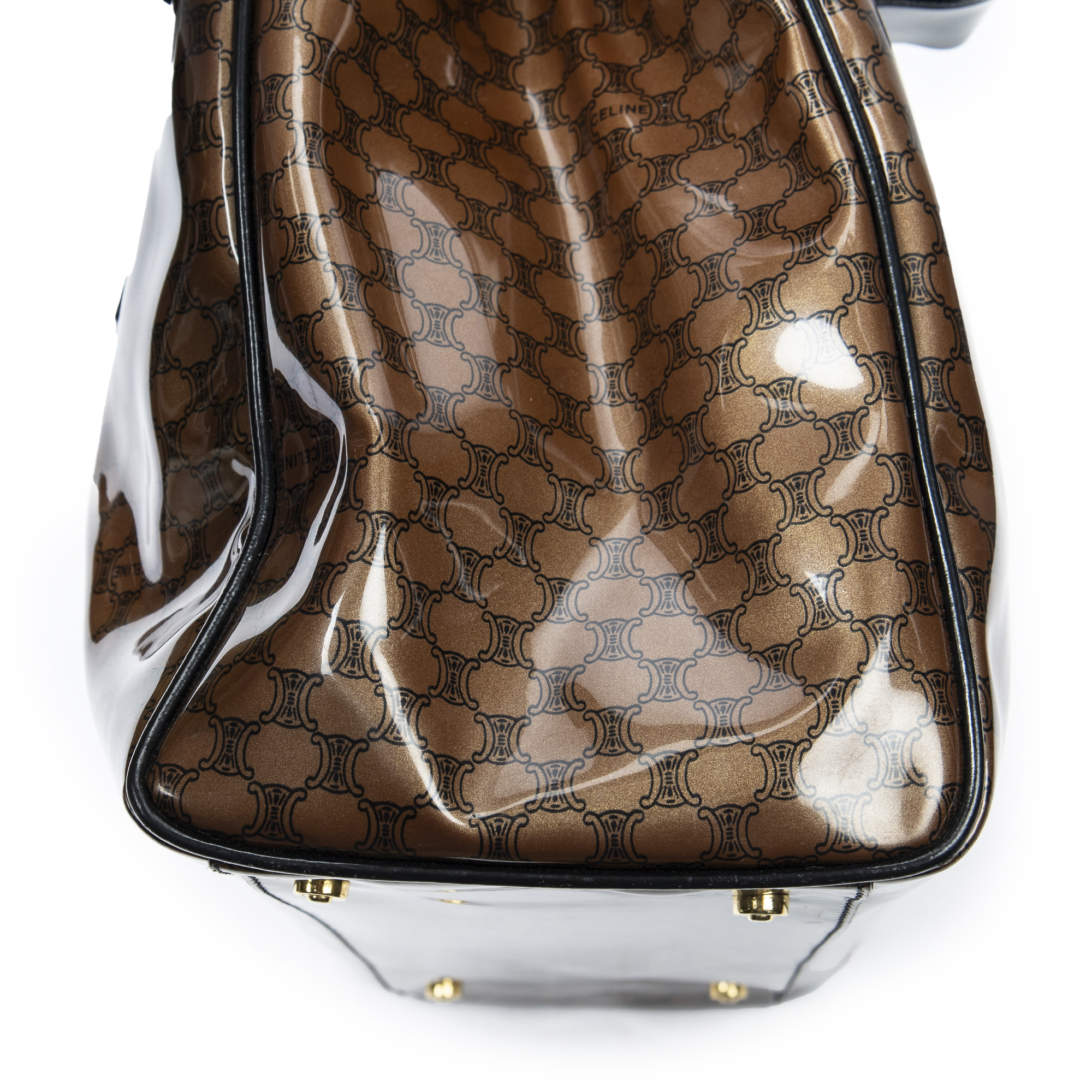 Celine Shoulder Bag Vintage Fold Over Top Tote in Brown/Black Macadam Patent Leather and Gold hardware. The product is in Excellent Condition (A).