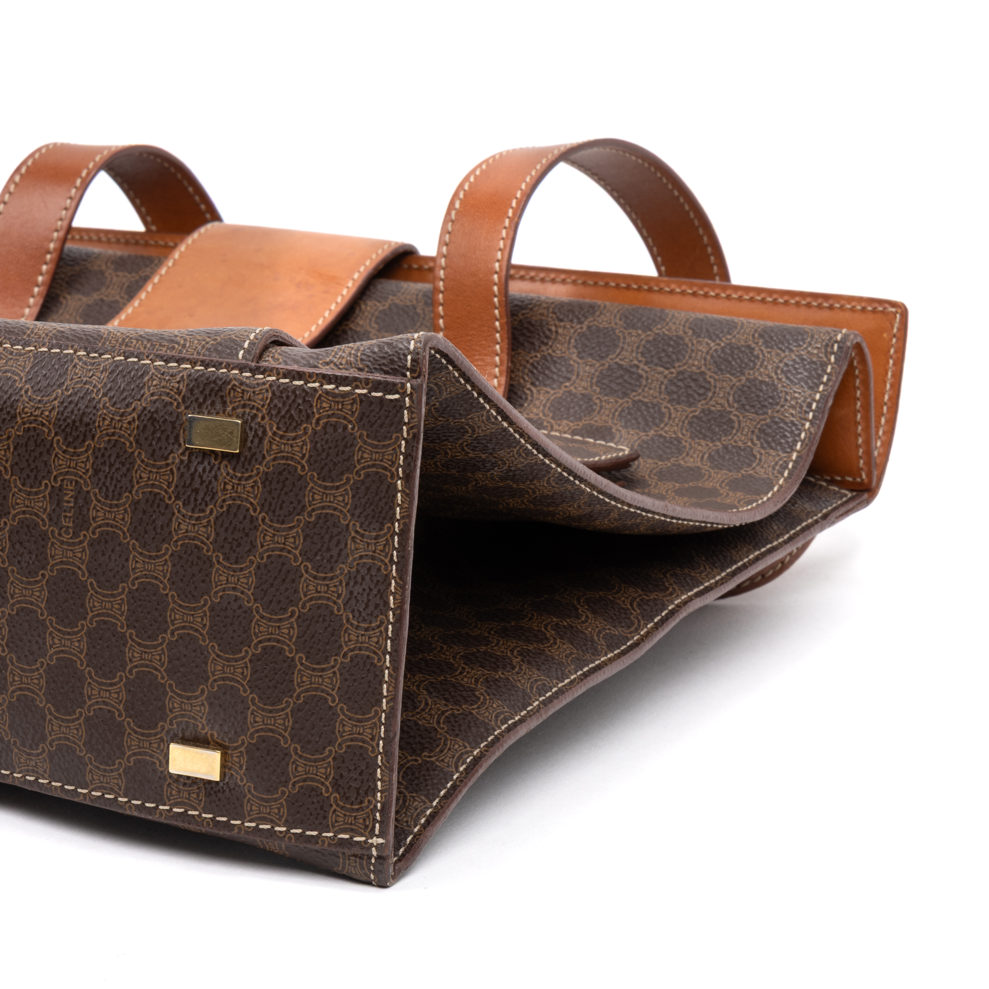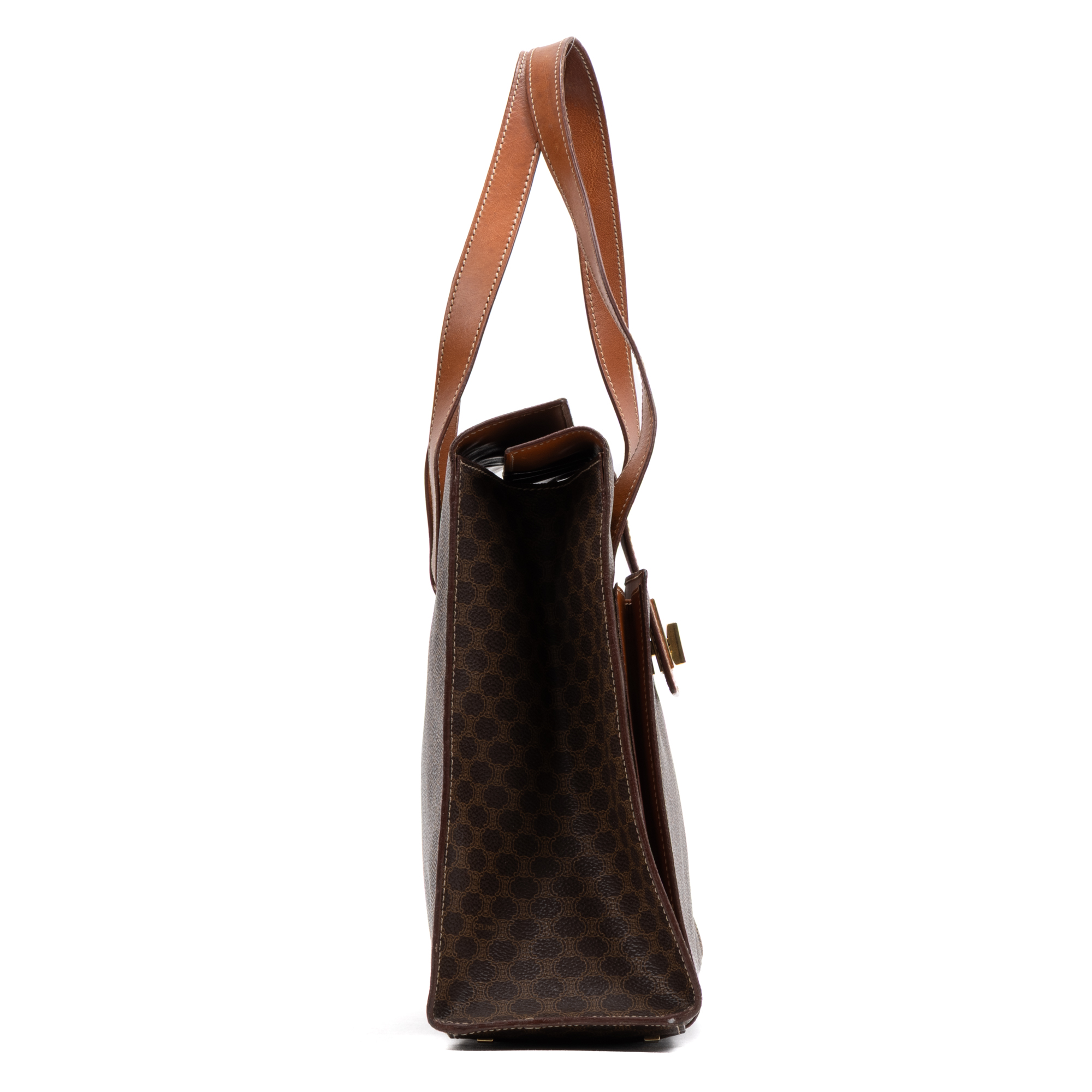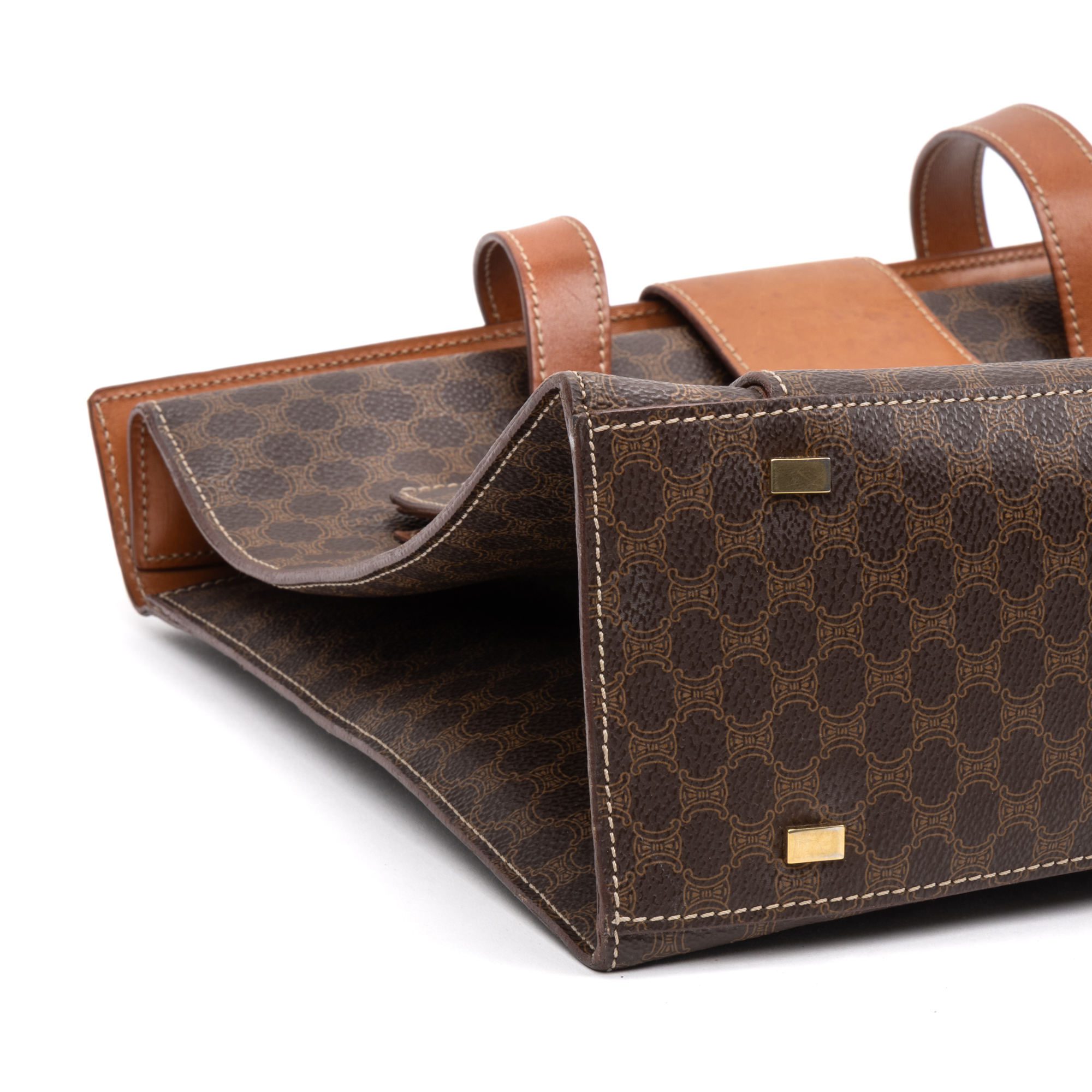 Celine Shoulder Bag Vintage Front Pocket Shopping Tote in Brown Macadam Coated Canvas and Gold hardware. The product is in Excellent Condition (A).