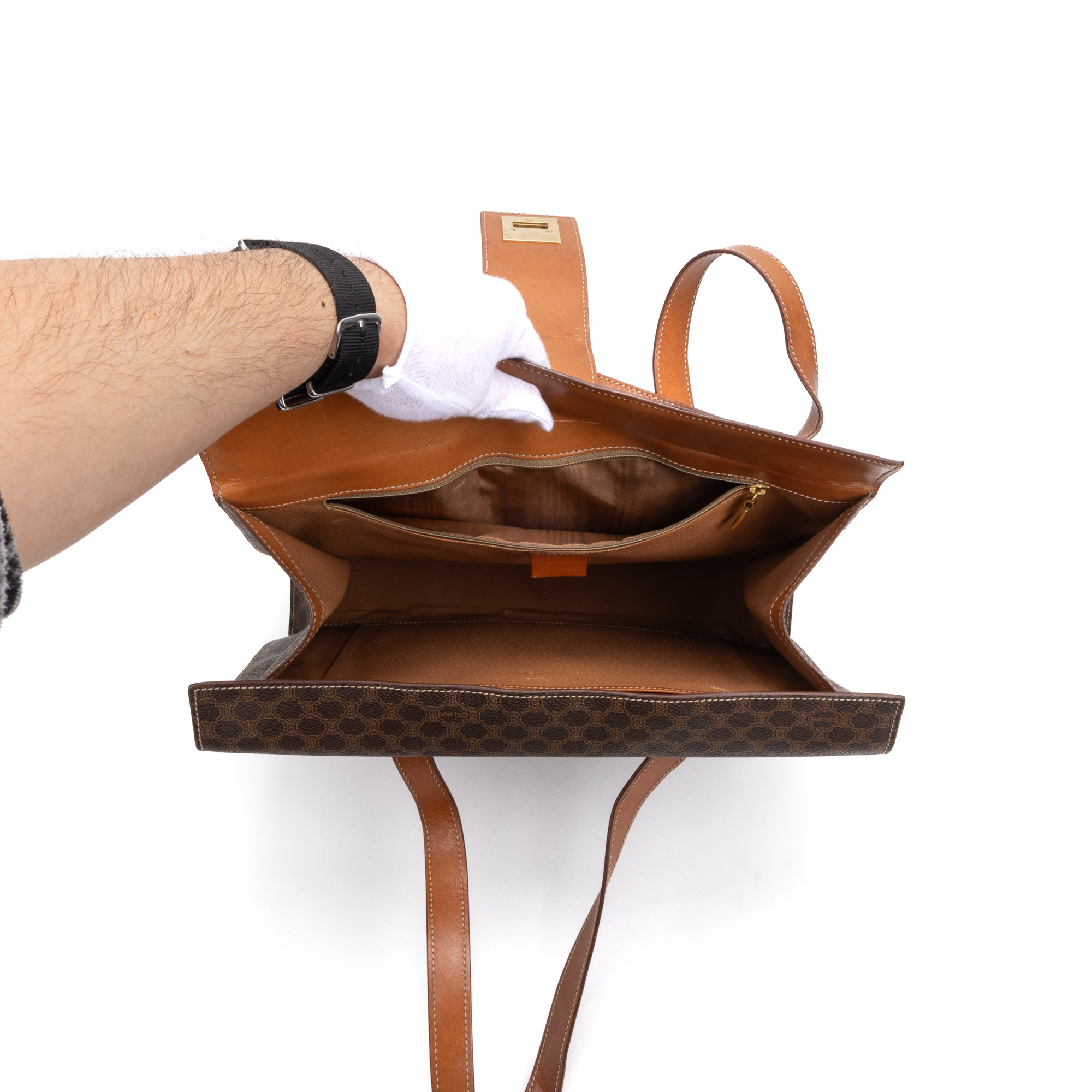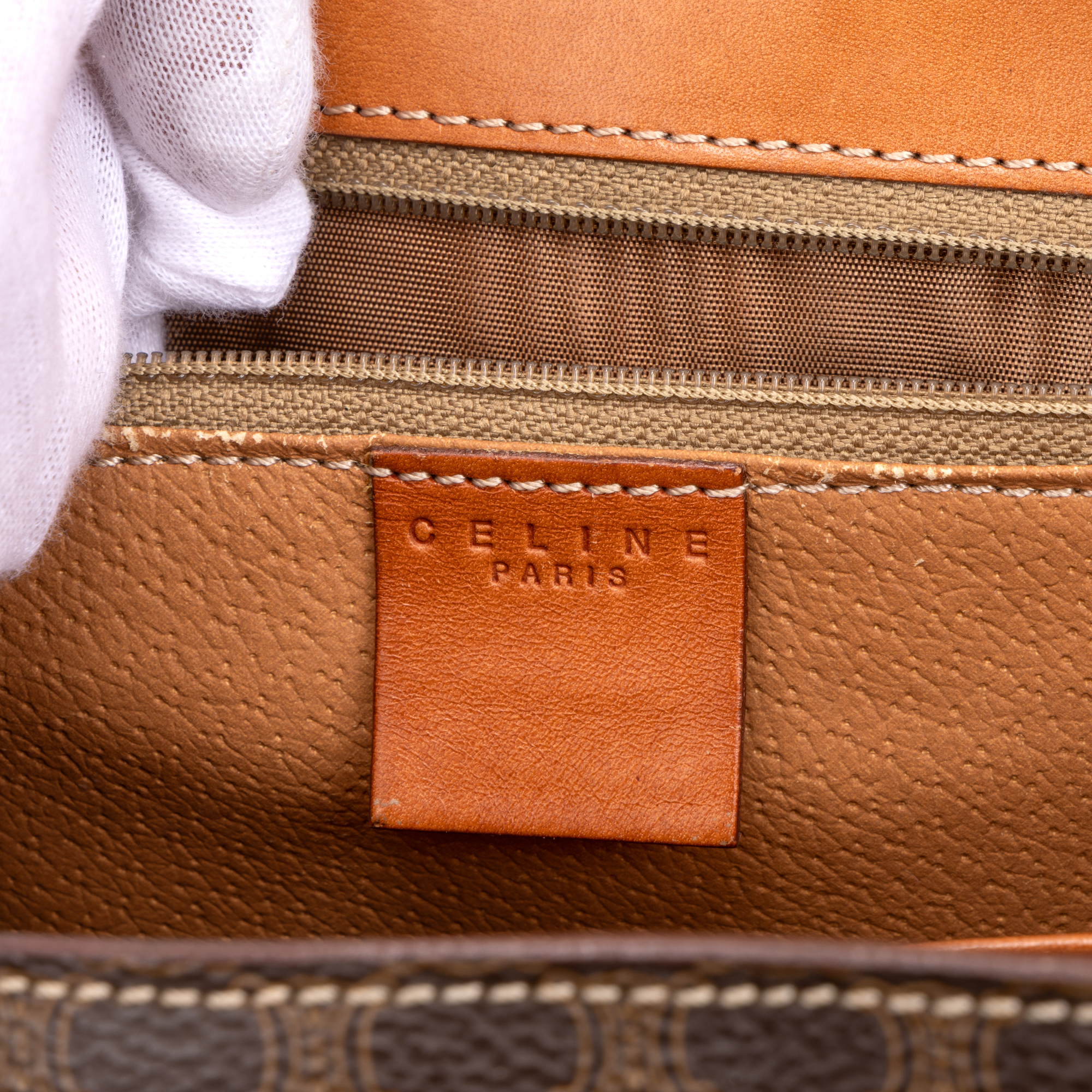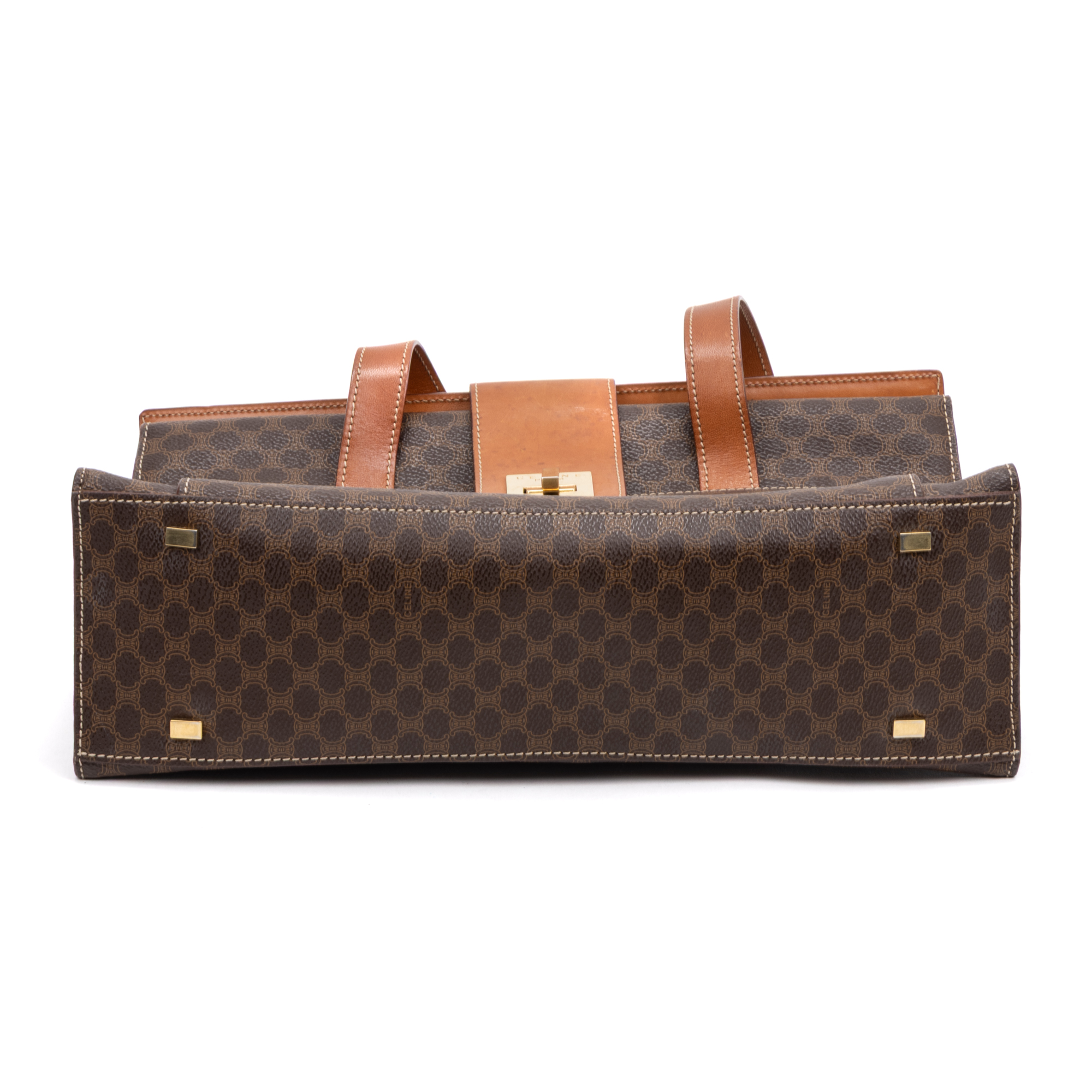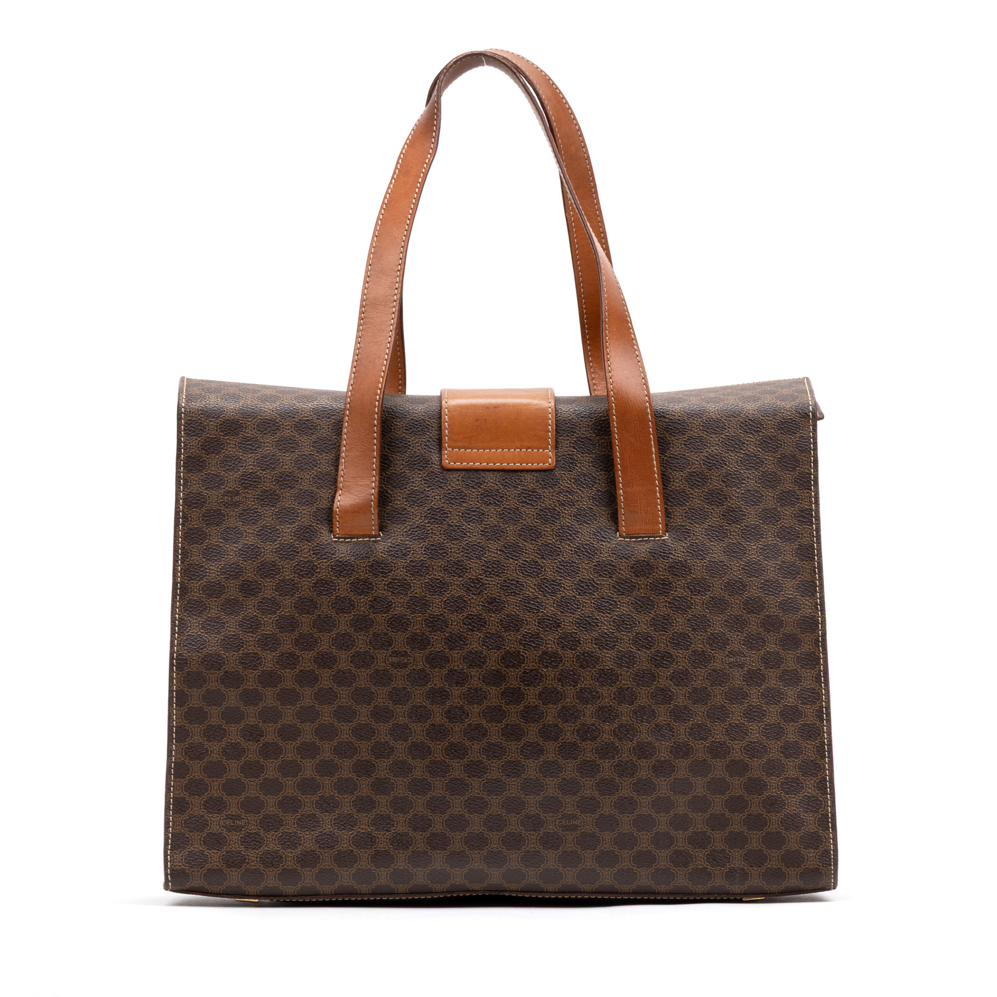 Celine Shoulder Bag Vintage Front Pocket Shopping Tote in Brown Macadam Coated Canvas and Gold hardware. The product is in Excellent Condition (A).