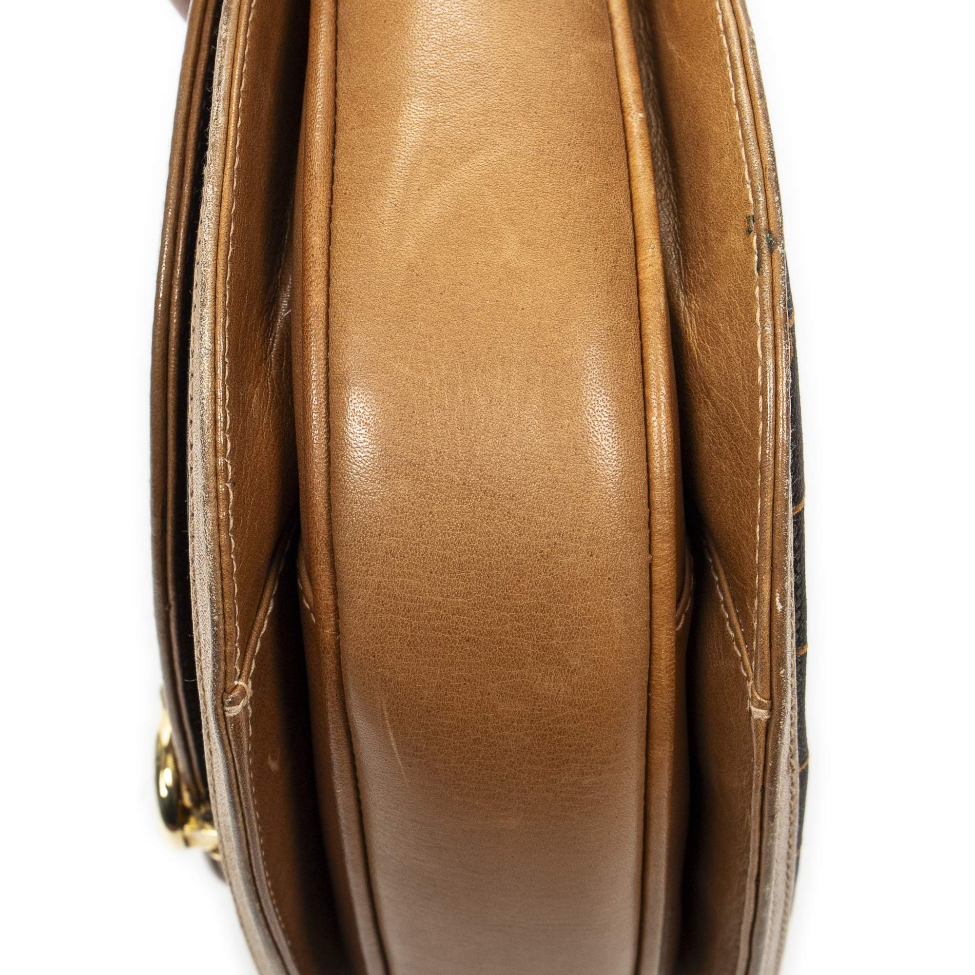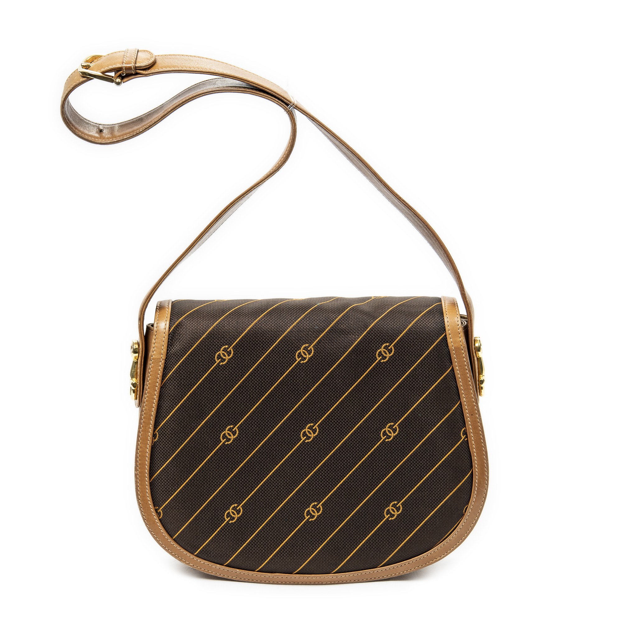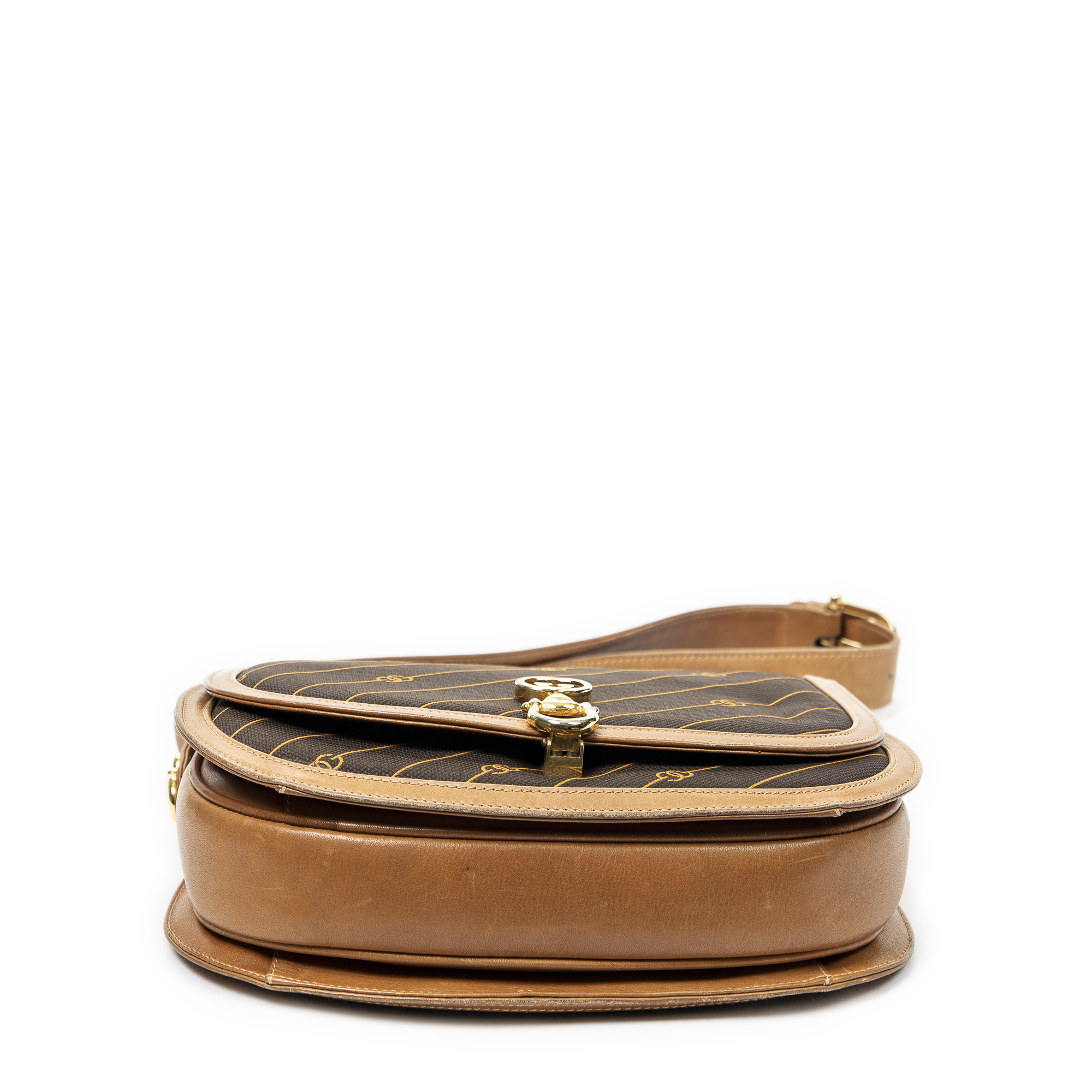 Gucci Shoulder Bag Vintage GG Lock Flap Crossbody in Tan/Brown Pinstripe Canvas and Gold hardware. The product is in Very Good Condition (AB).