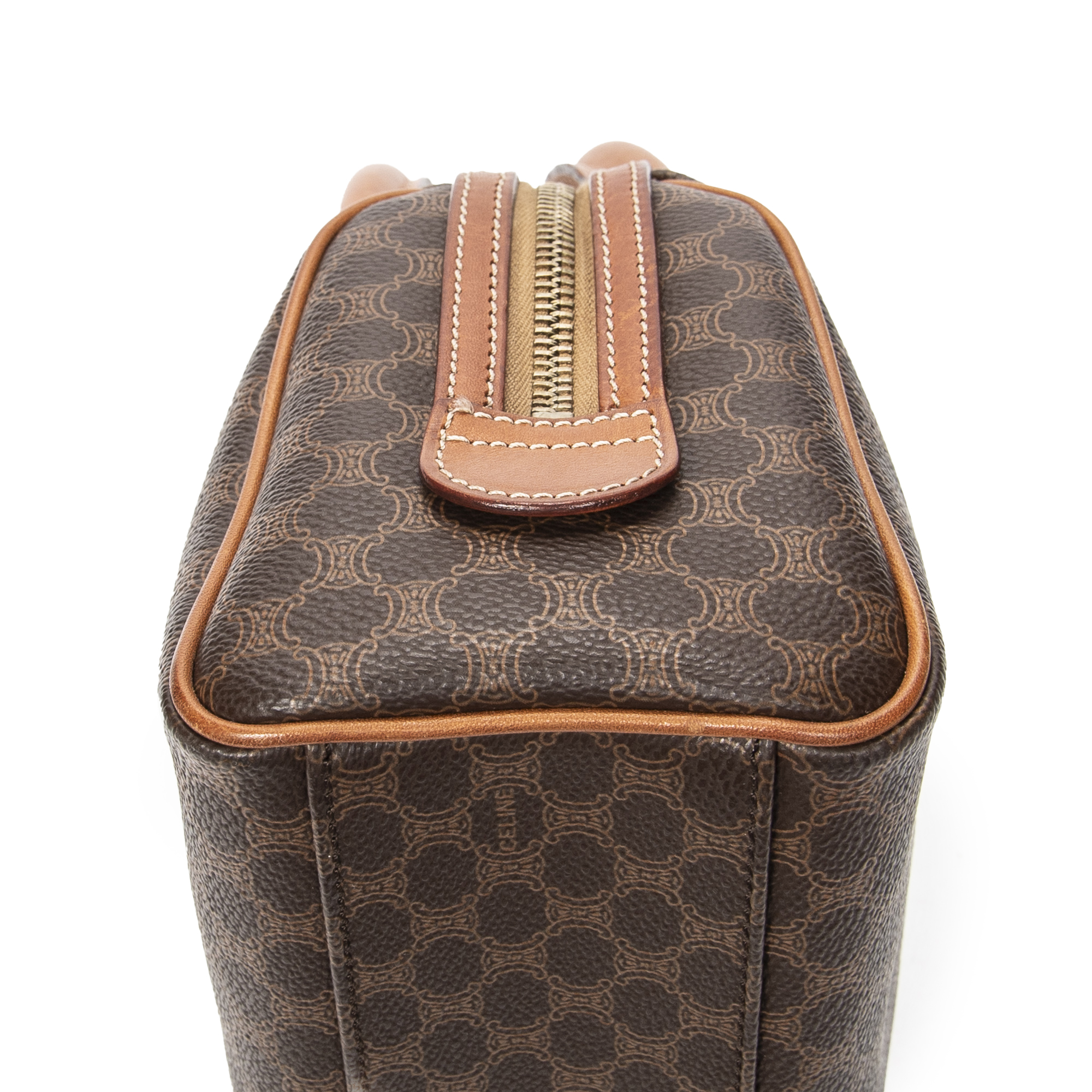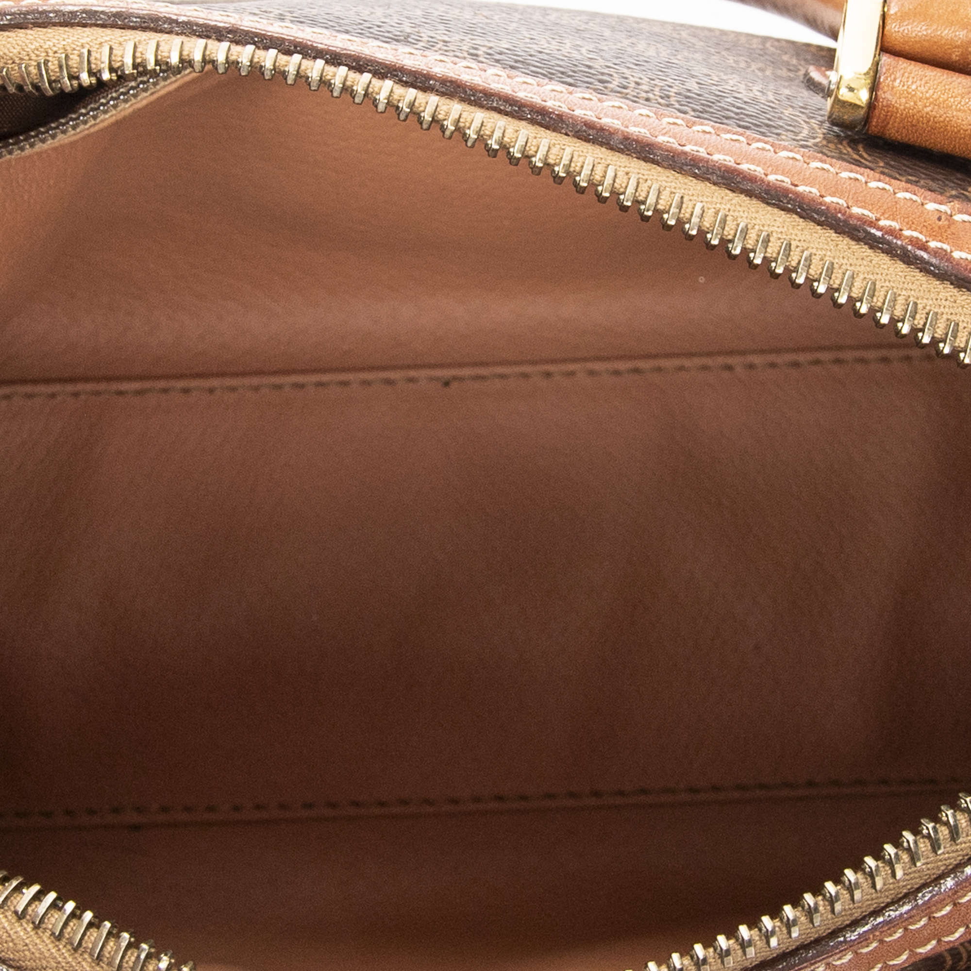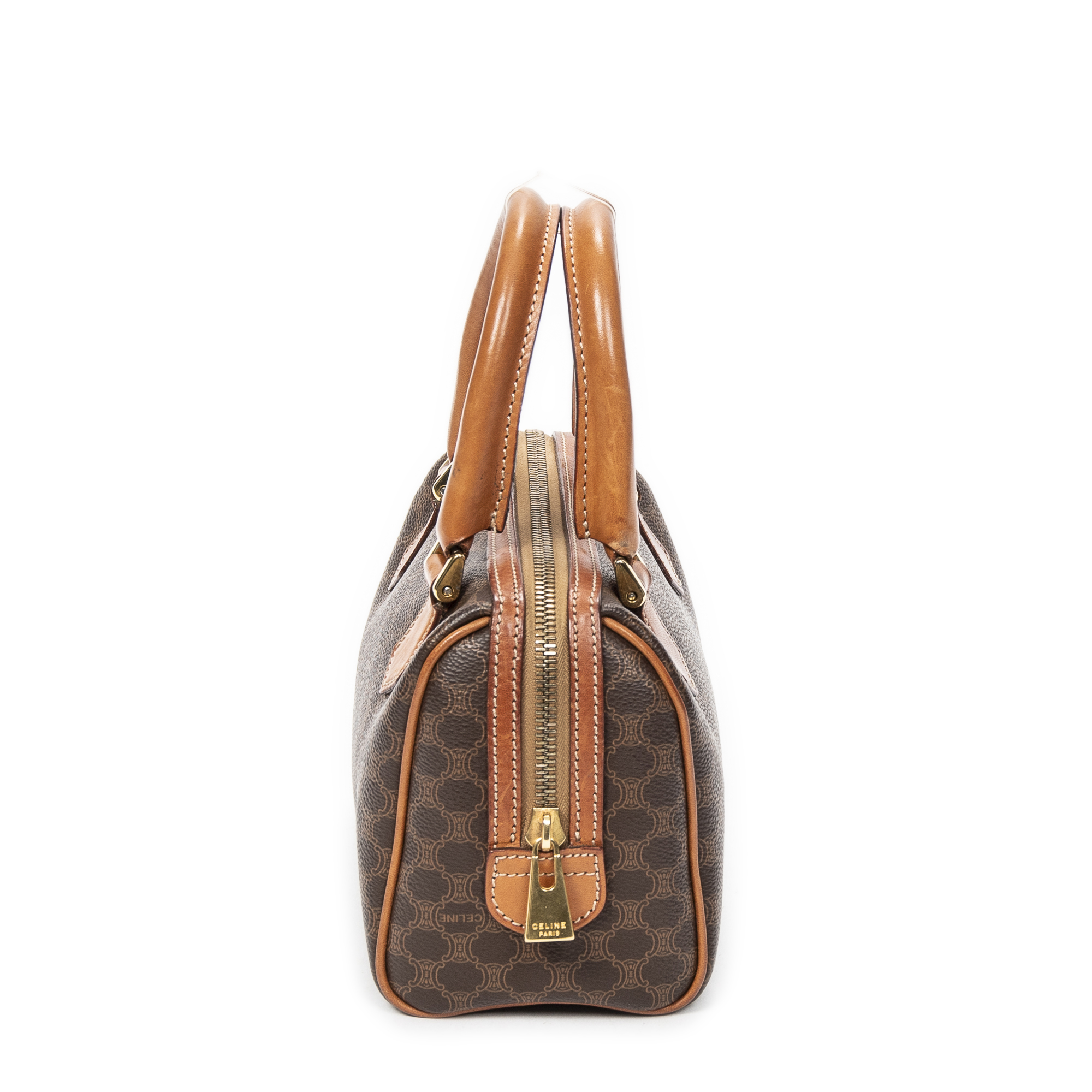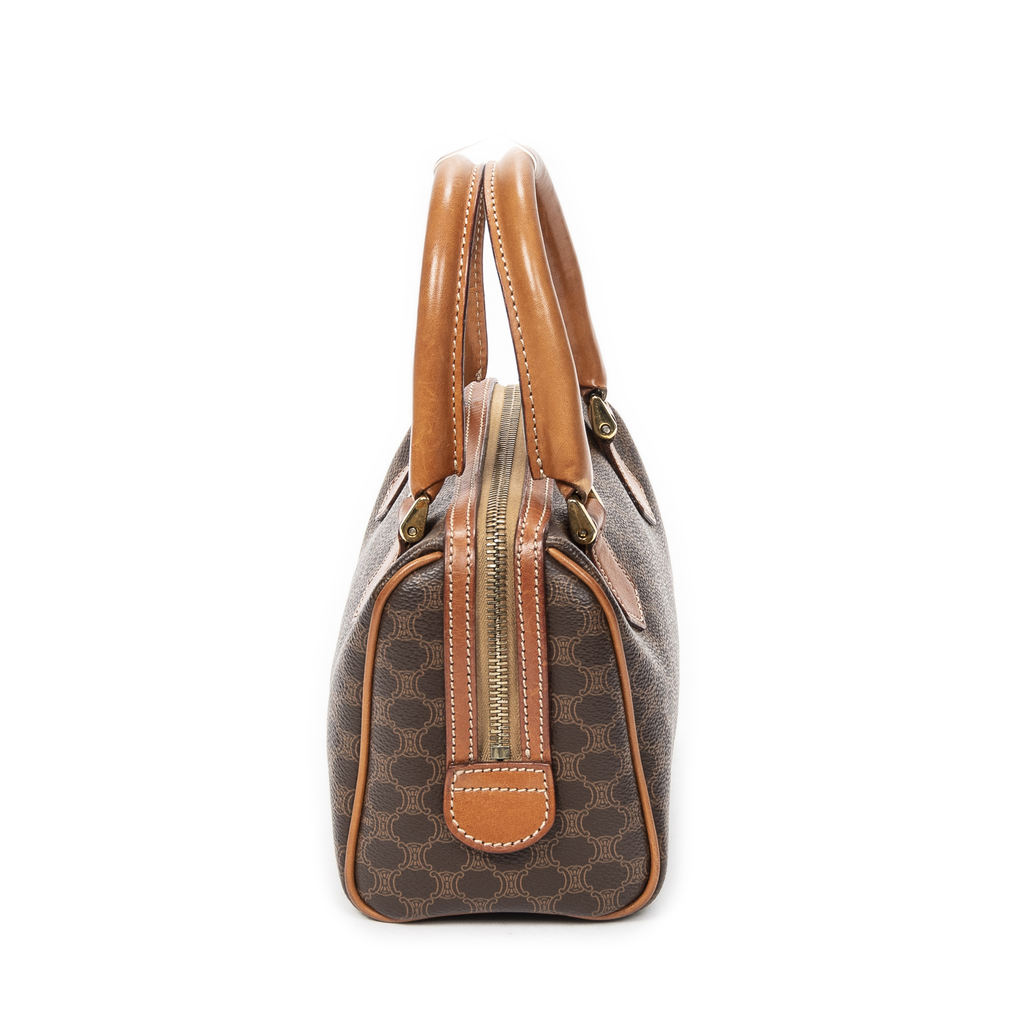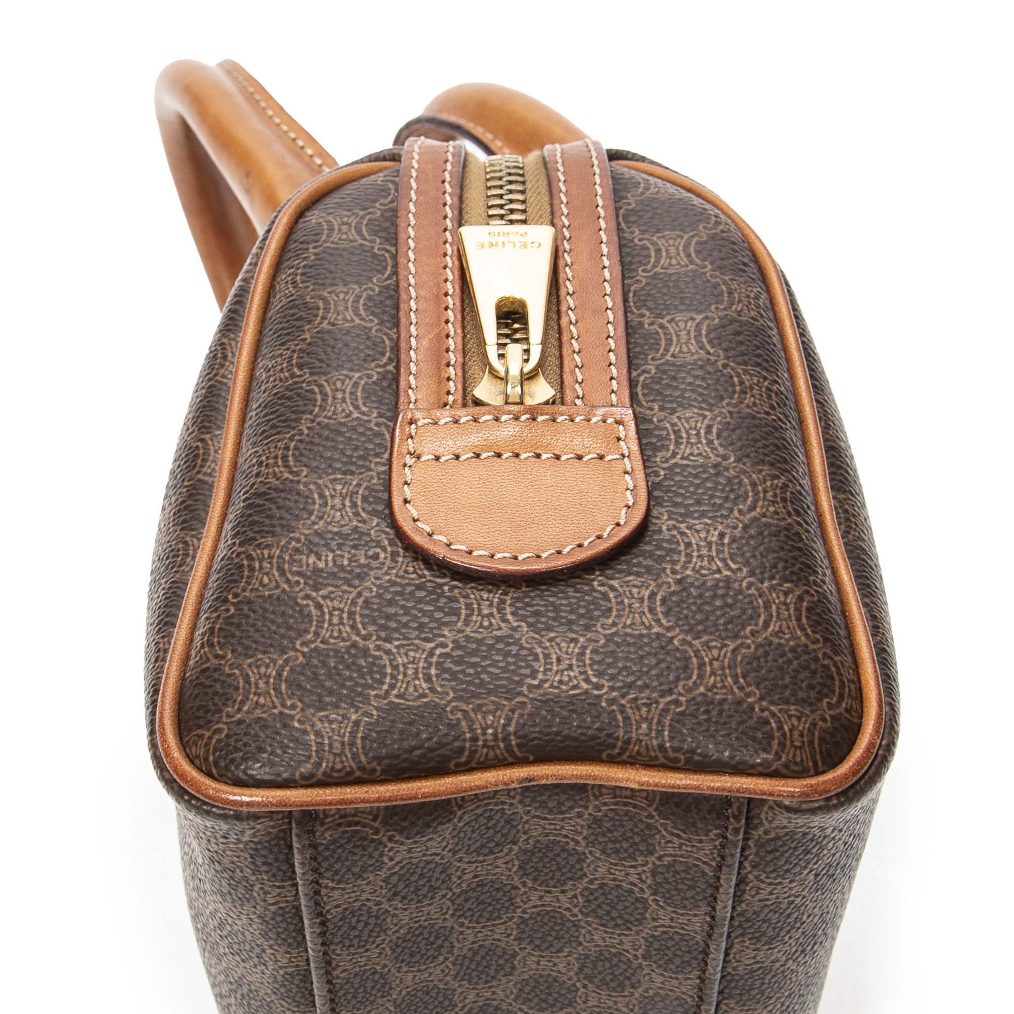 Celine Shoulder Bag Vintage Micro Boston in Brown Macadam Coated Canvas and Gold hardware. The product is in Very Good Condition (AB).
