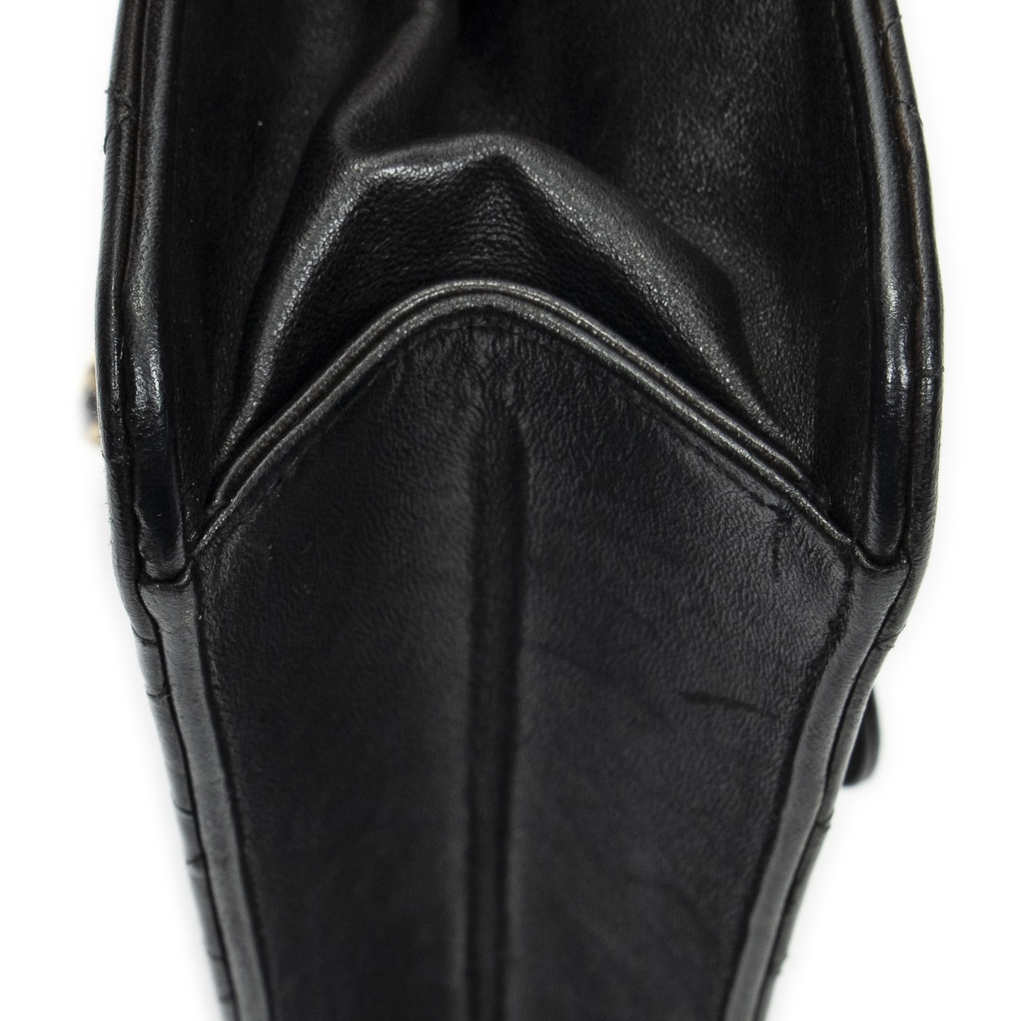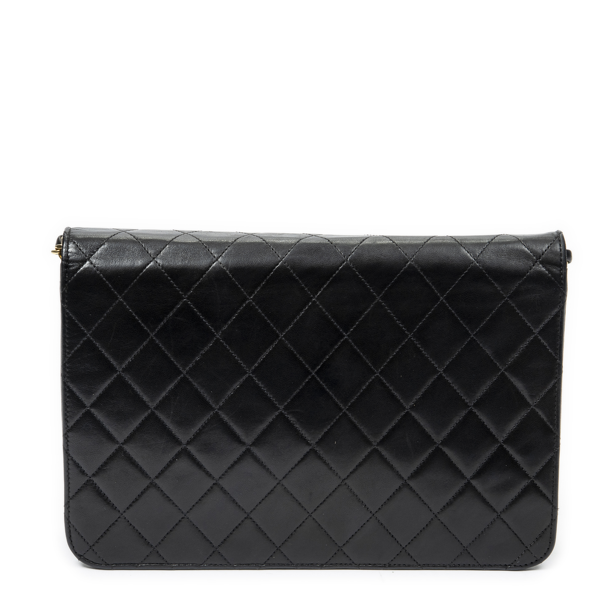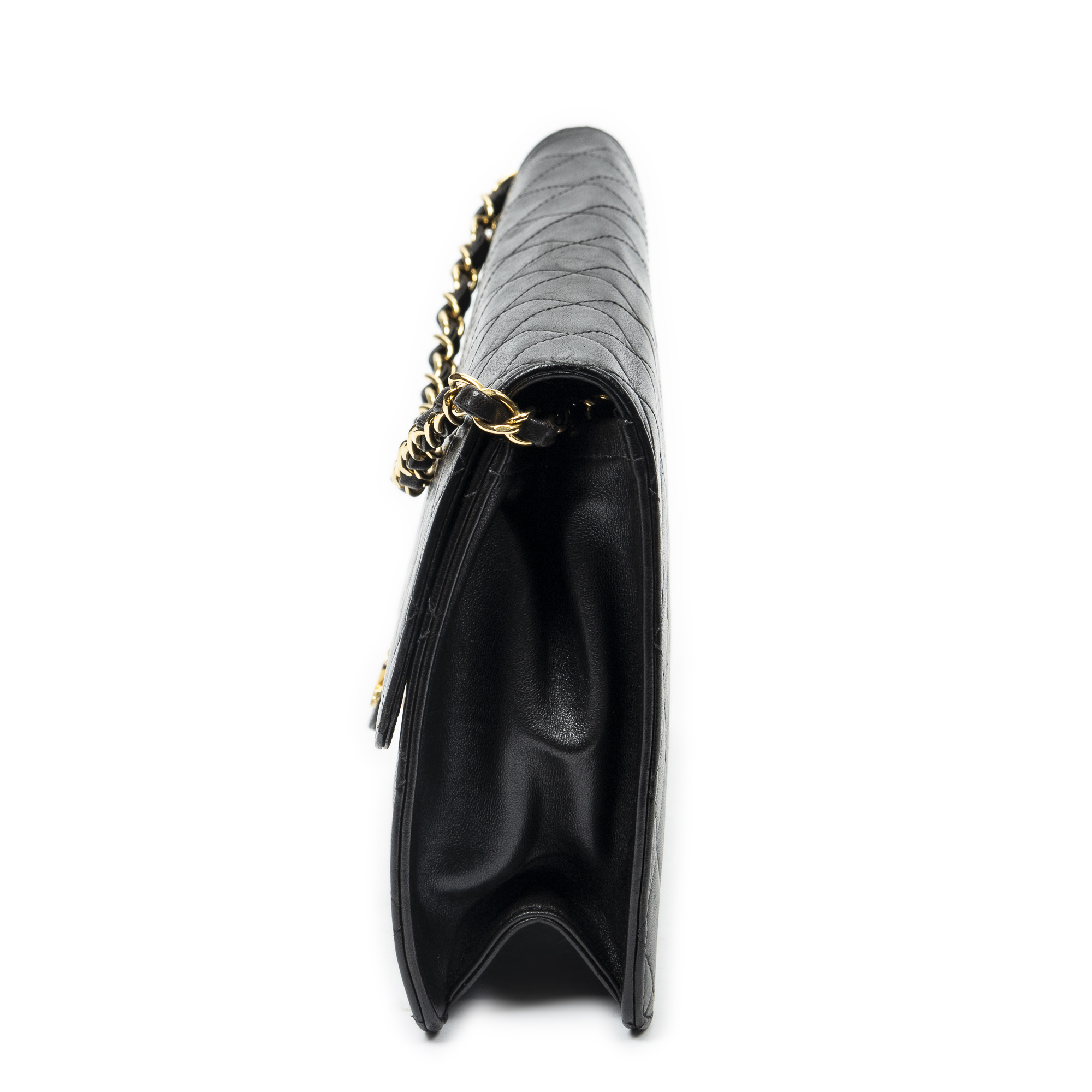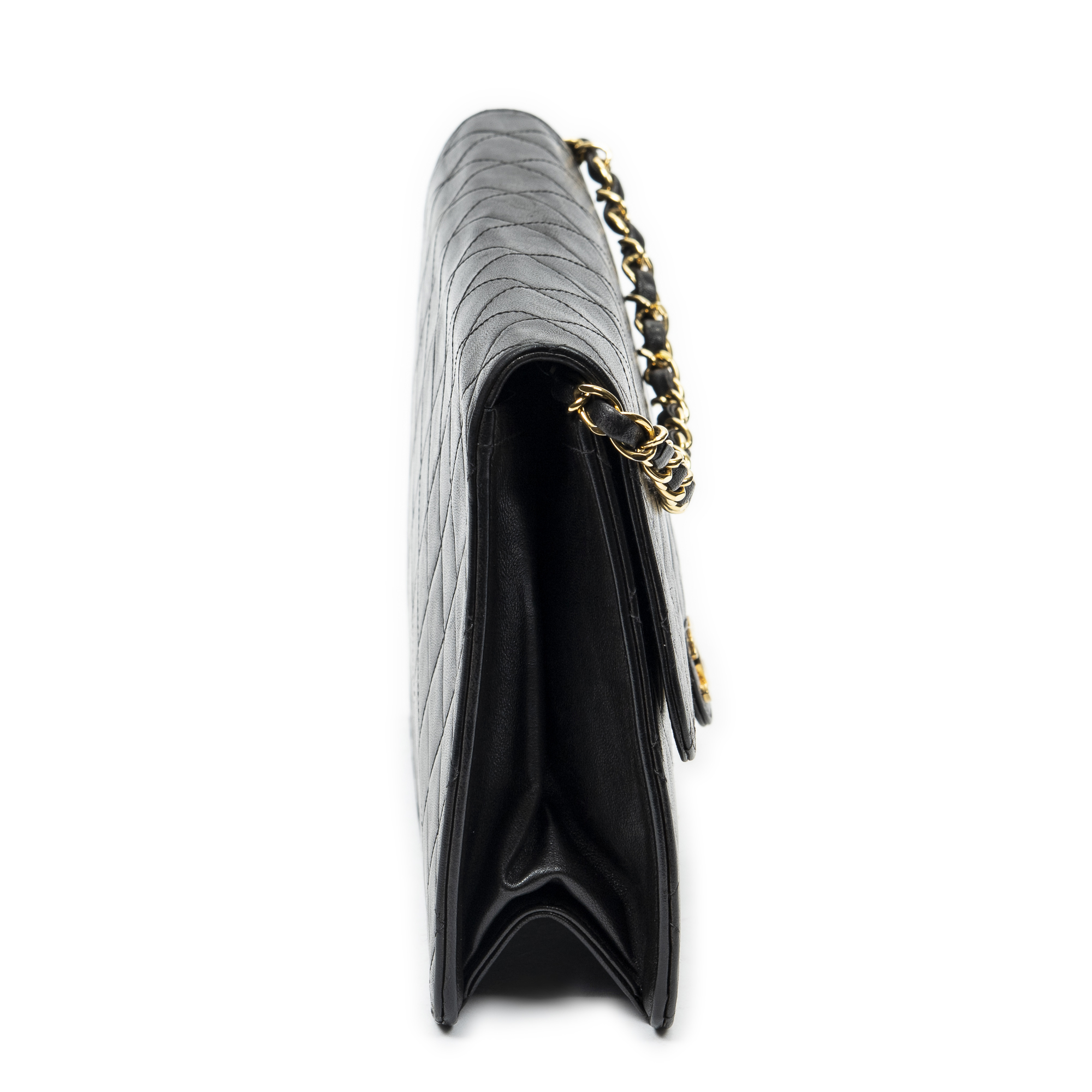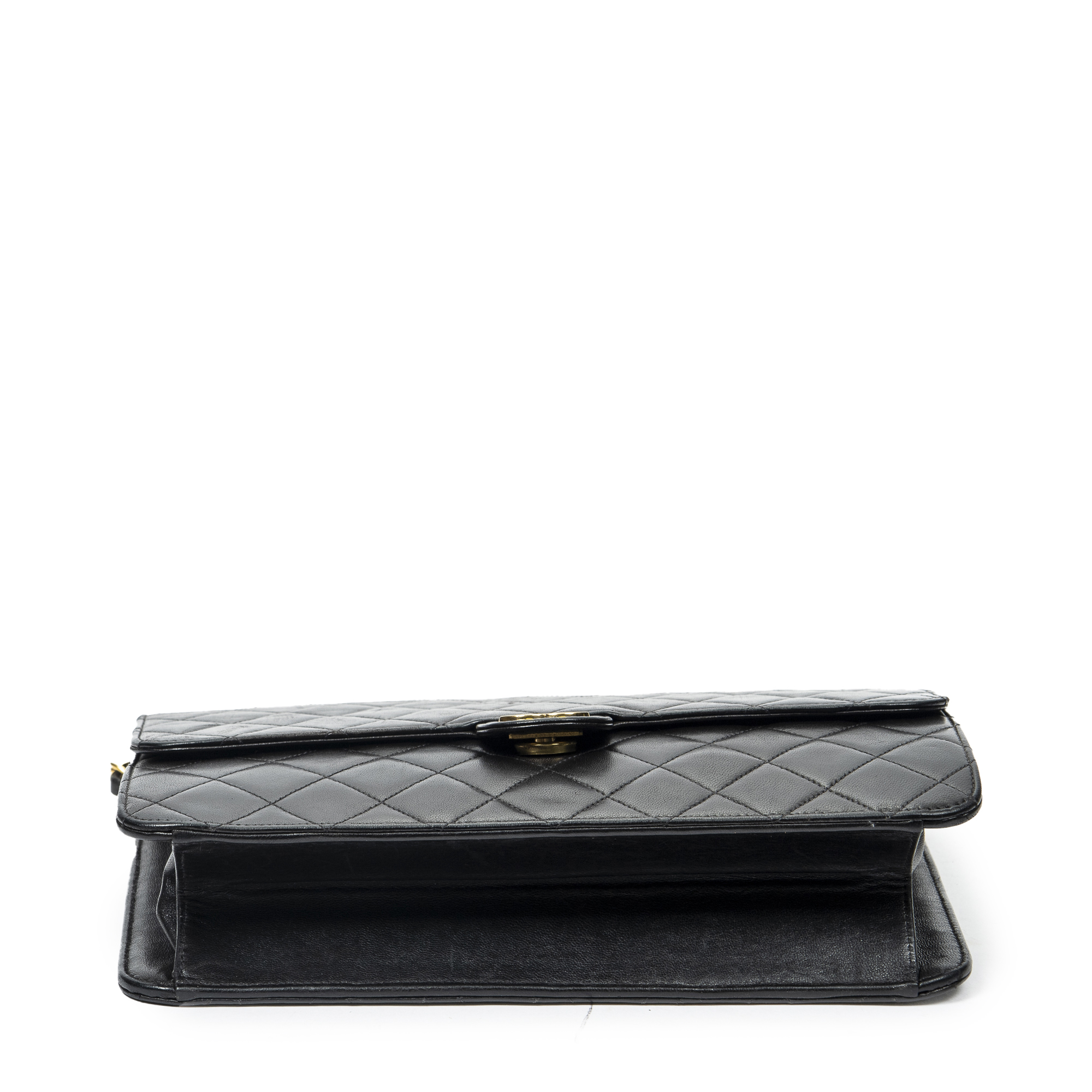 Chanel Shoulder Bag Vintage Push Lock Straight Flap in Black Quilted Lambskin Leather and Gold hardware. The product is in Excellent Condition (A).