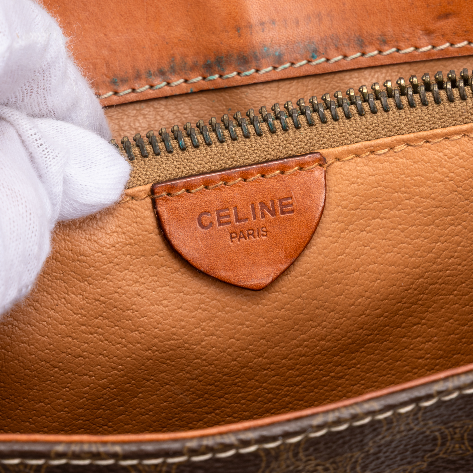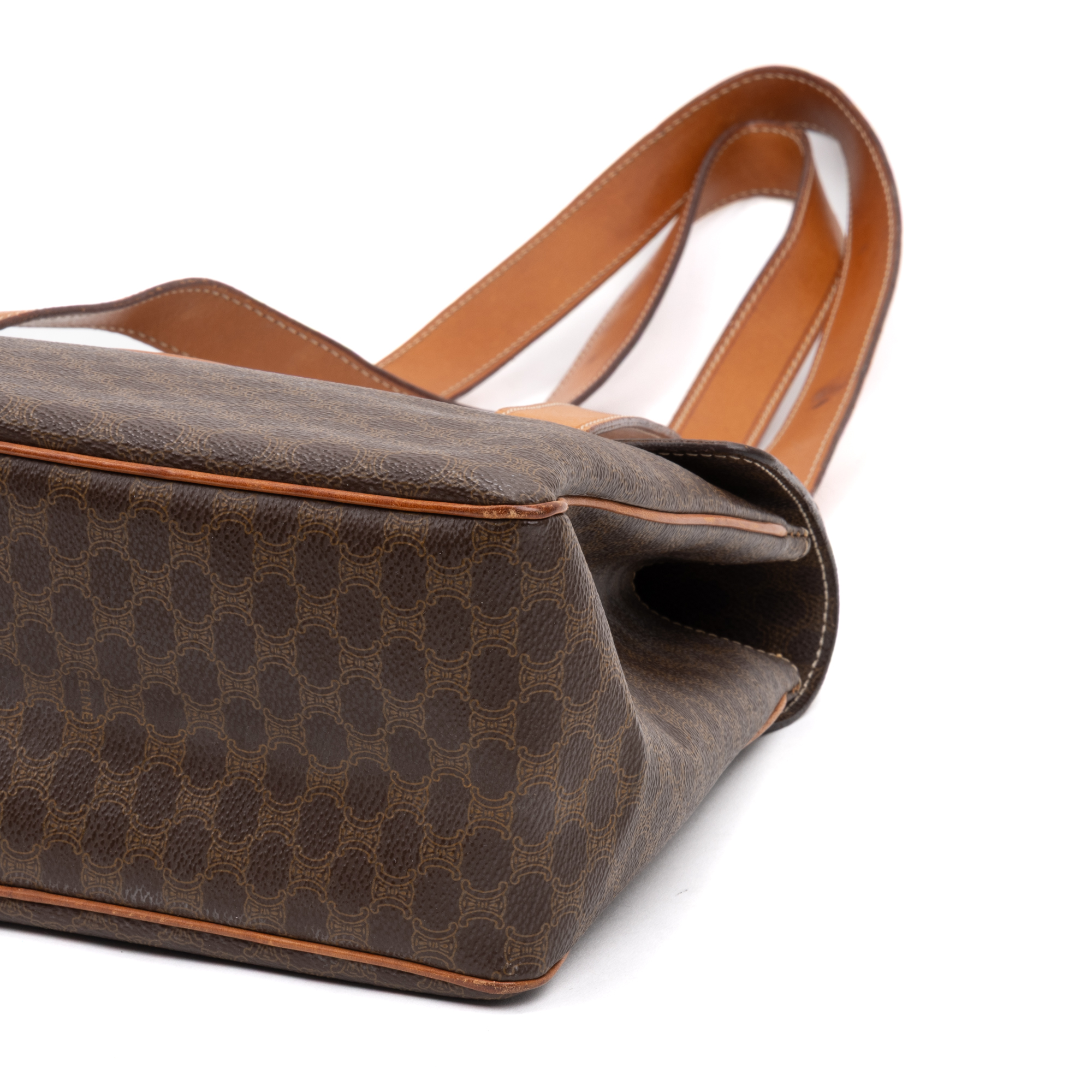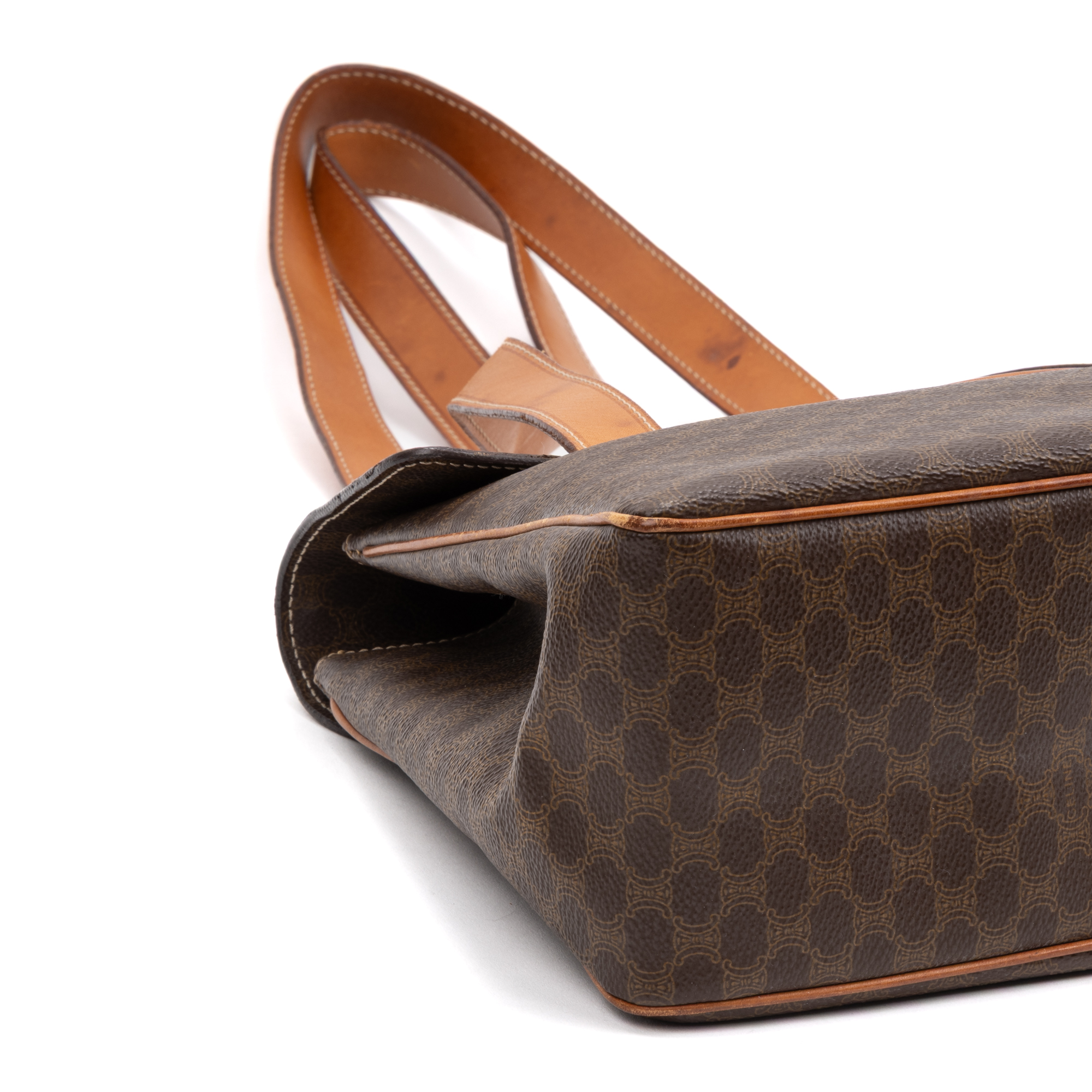 Celine Shoulder Bag Vintage Shopping Tote in Brown Macadam Coated Canvas and Gold hardware. The product is in Very Good Condition (AB).