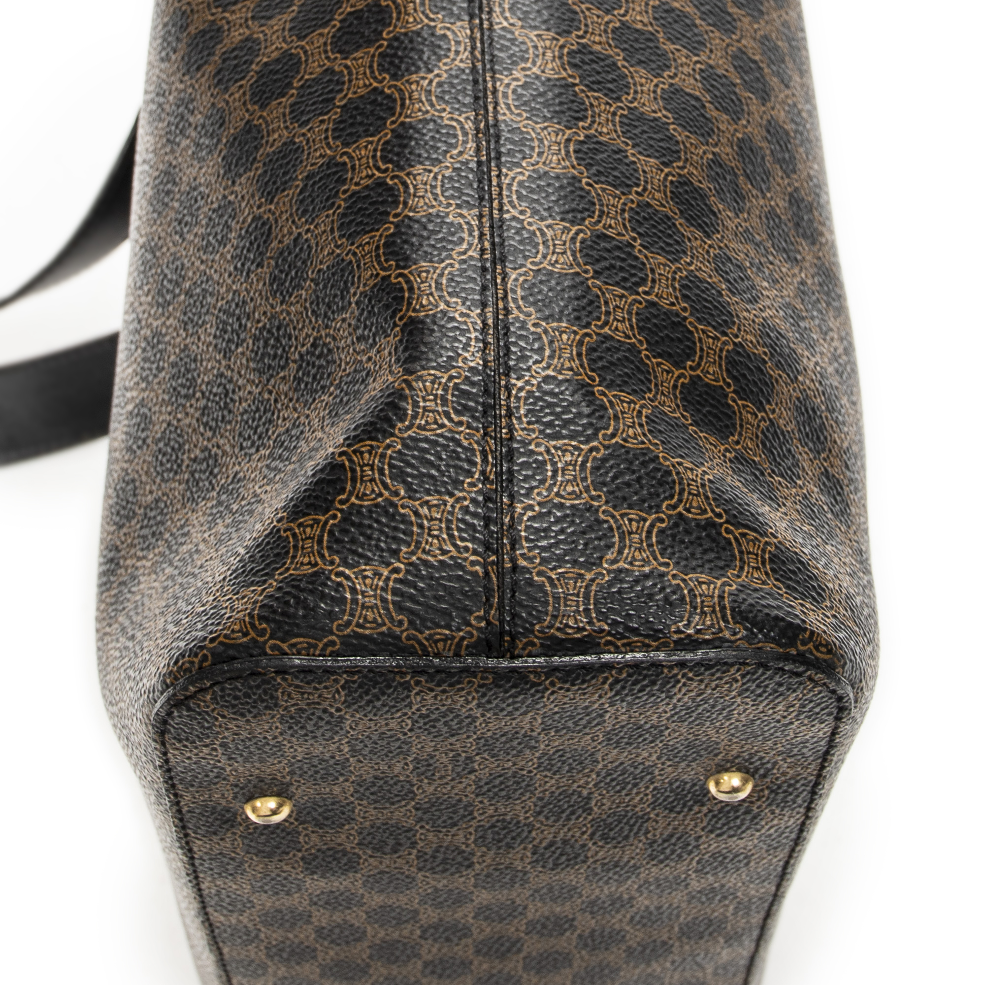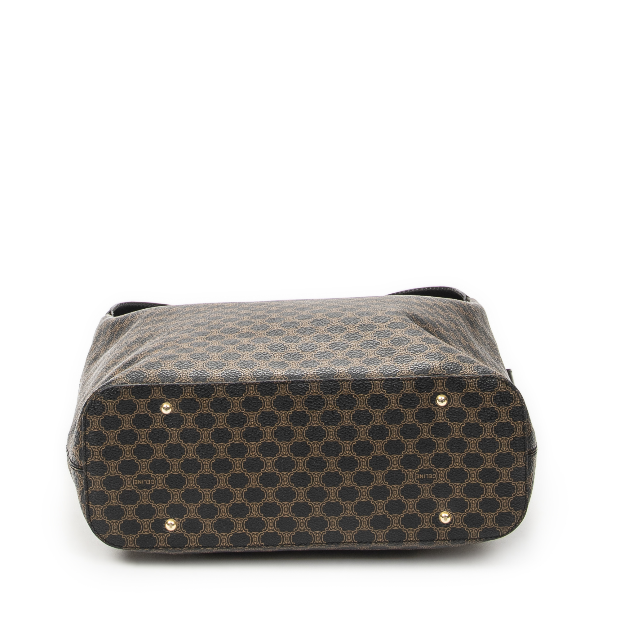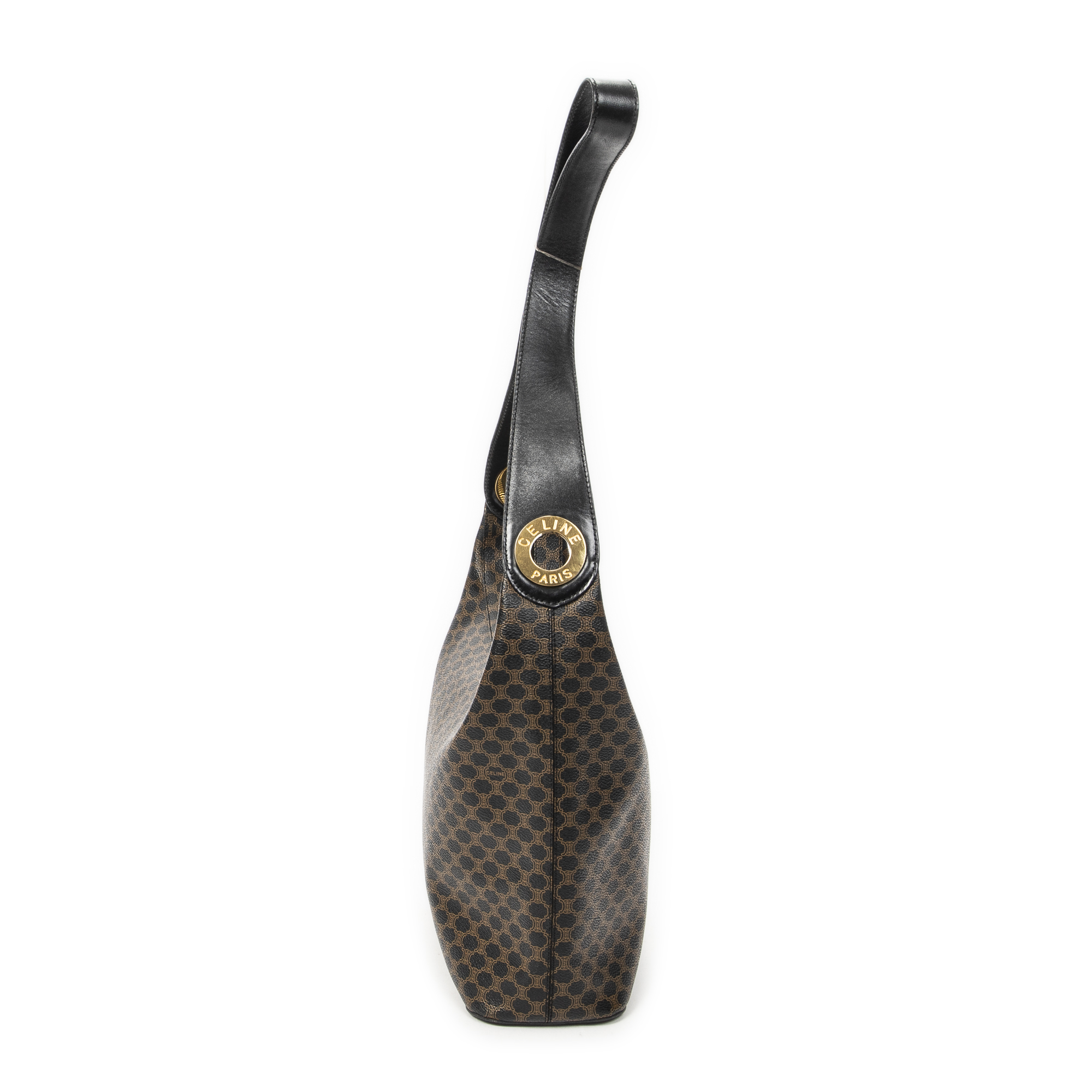 Celine Shoulder Bag Vintage Shoulder Zip Hobo in Black/Brown Macadam Coated Canvas and Gold hardware. The product is in Excellent Condition (A).