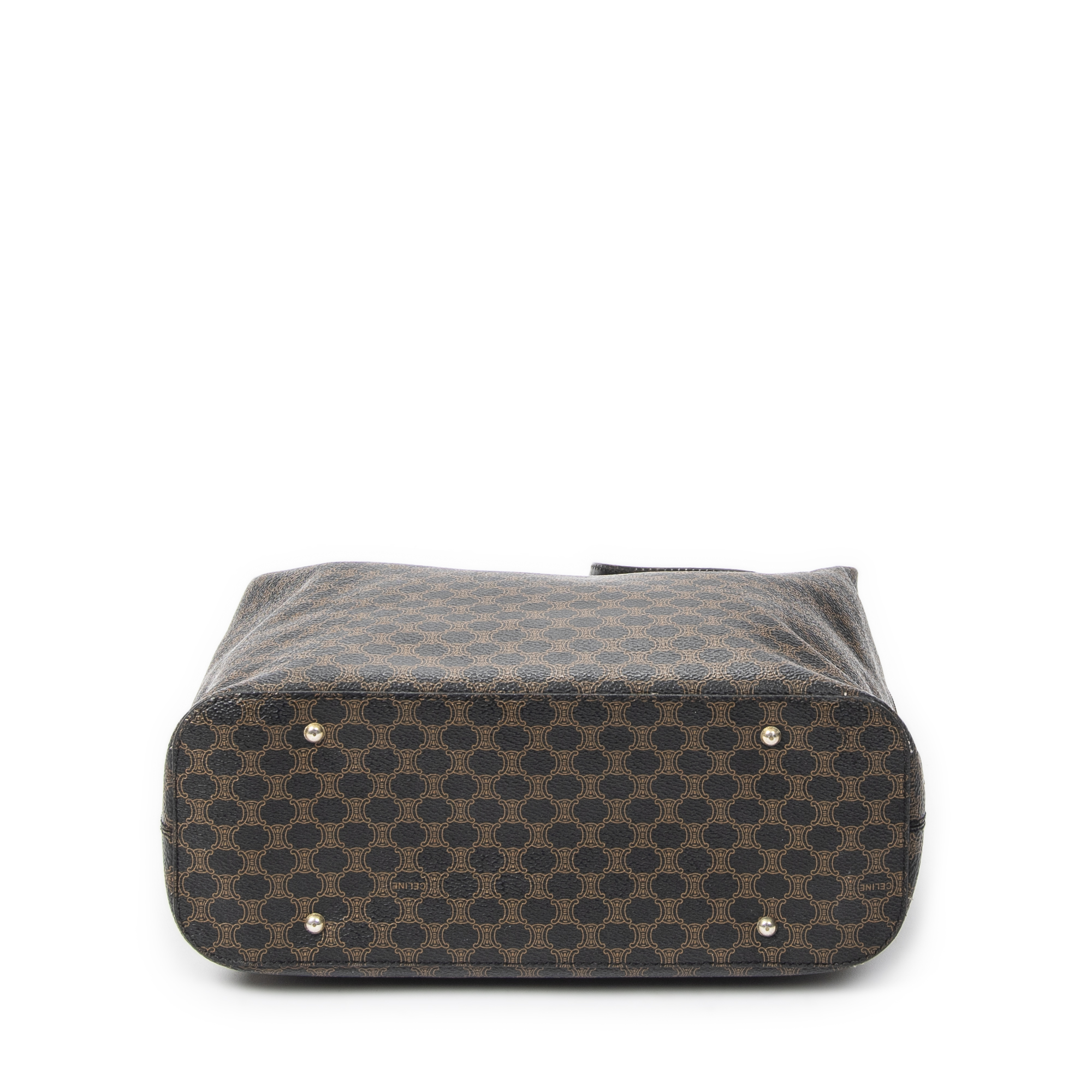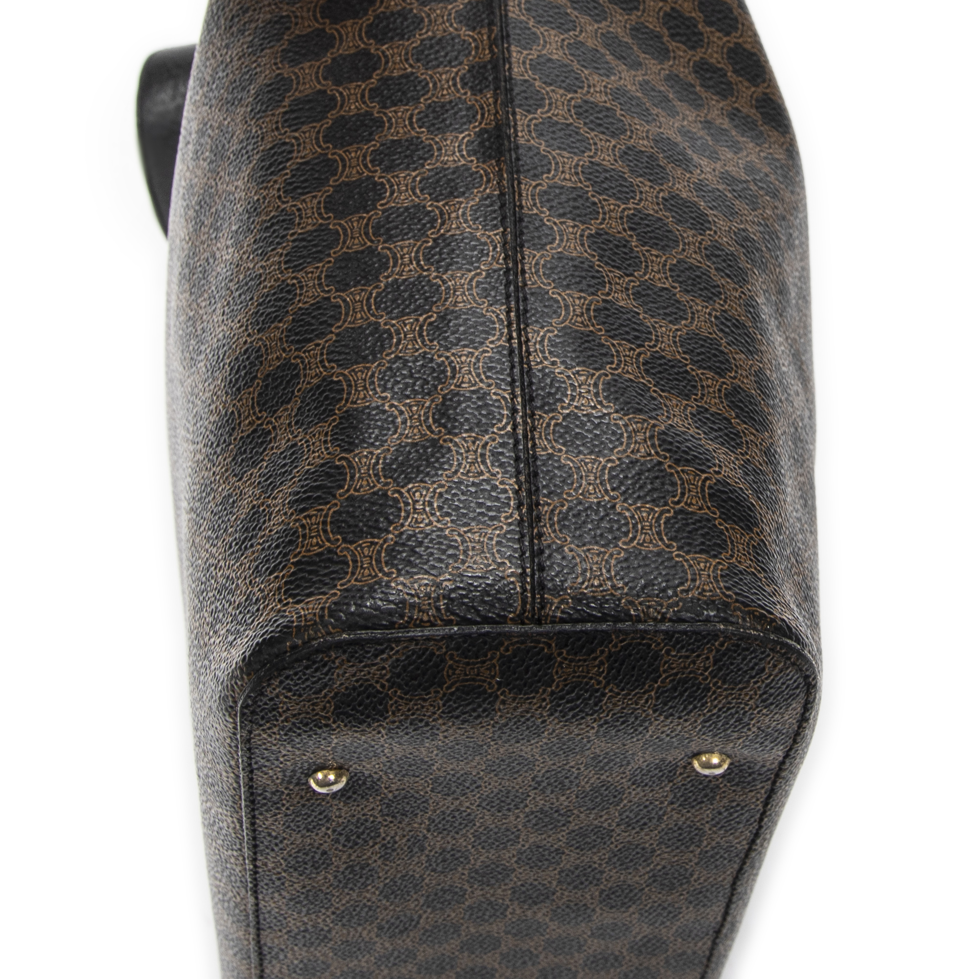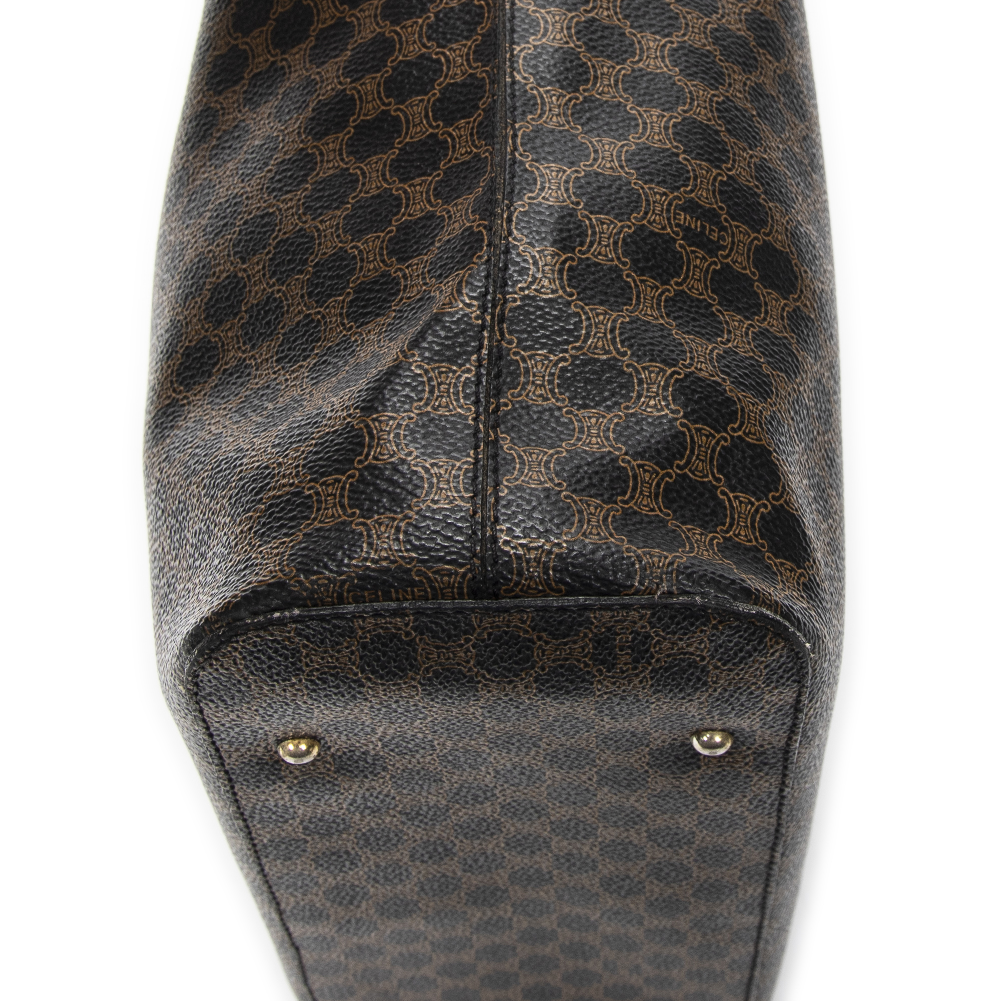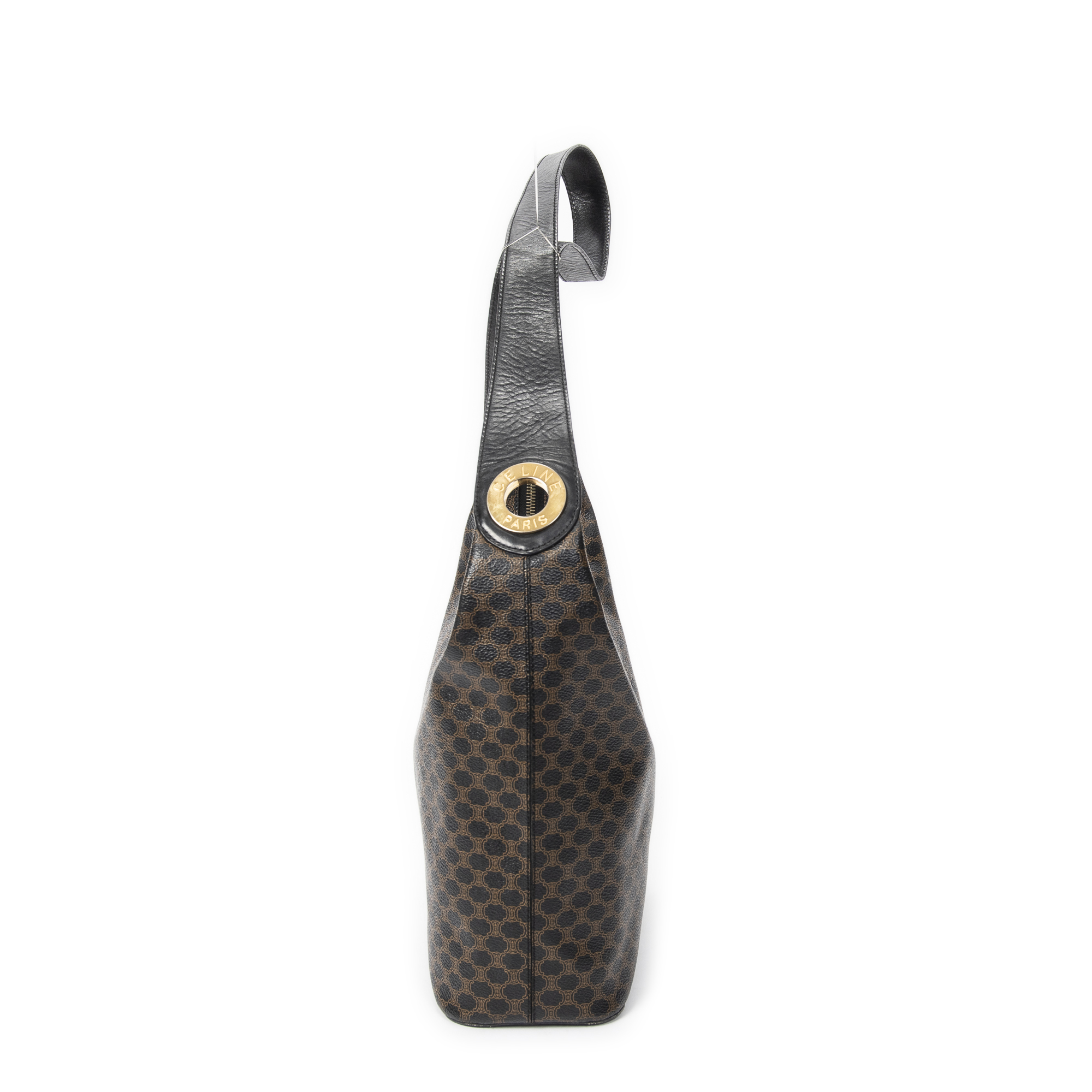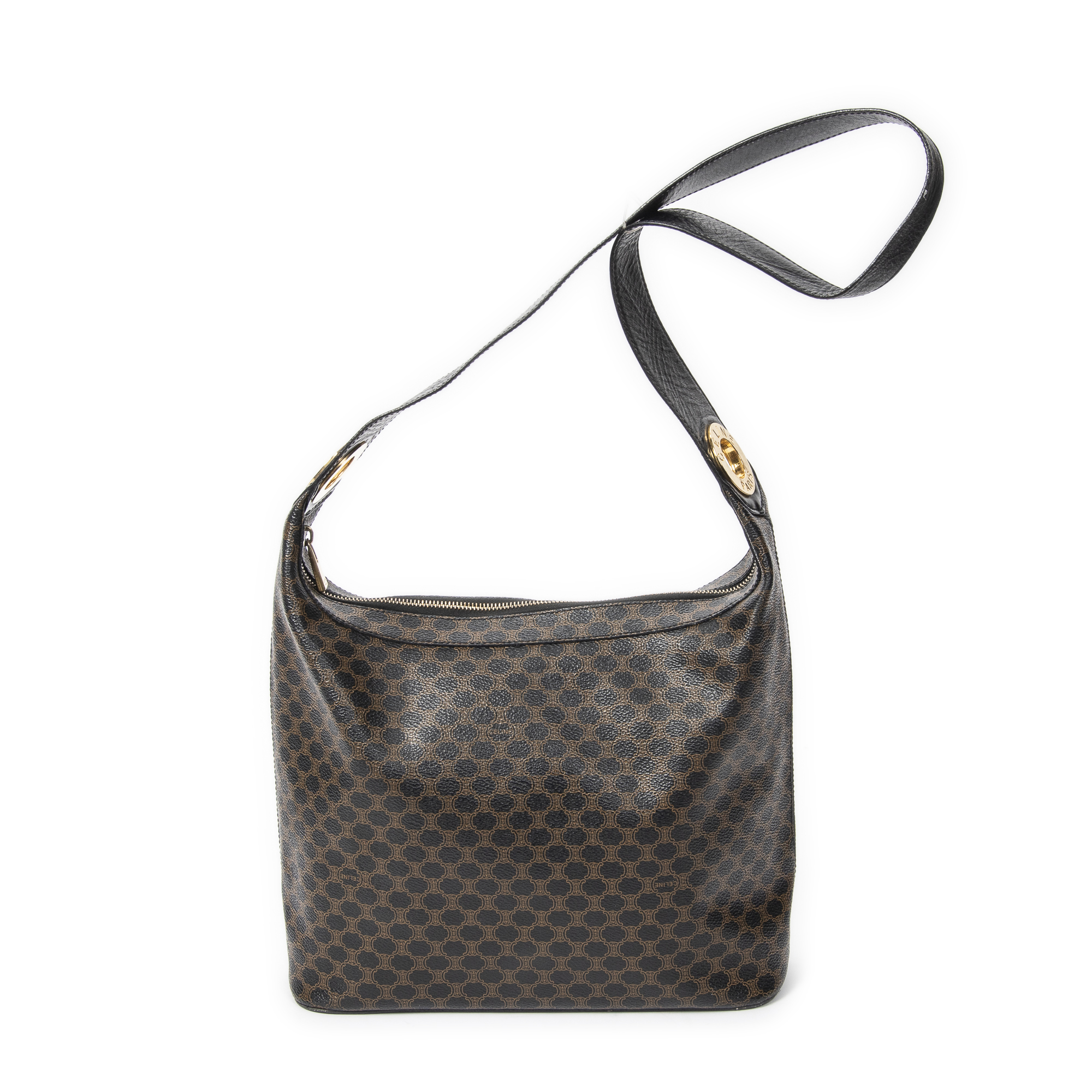 Celine Shoulder Bag Vintage Shoulder Zip Hobo in Brown/Black Macadam Coated Canvas and Gold hardware. The product is in Very Good Condition (AB).