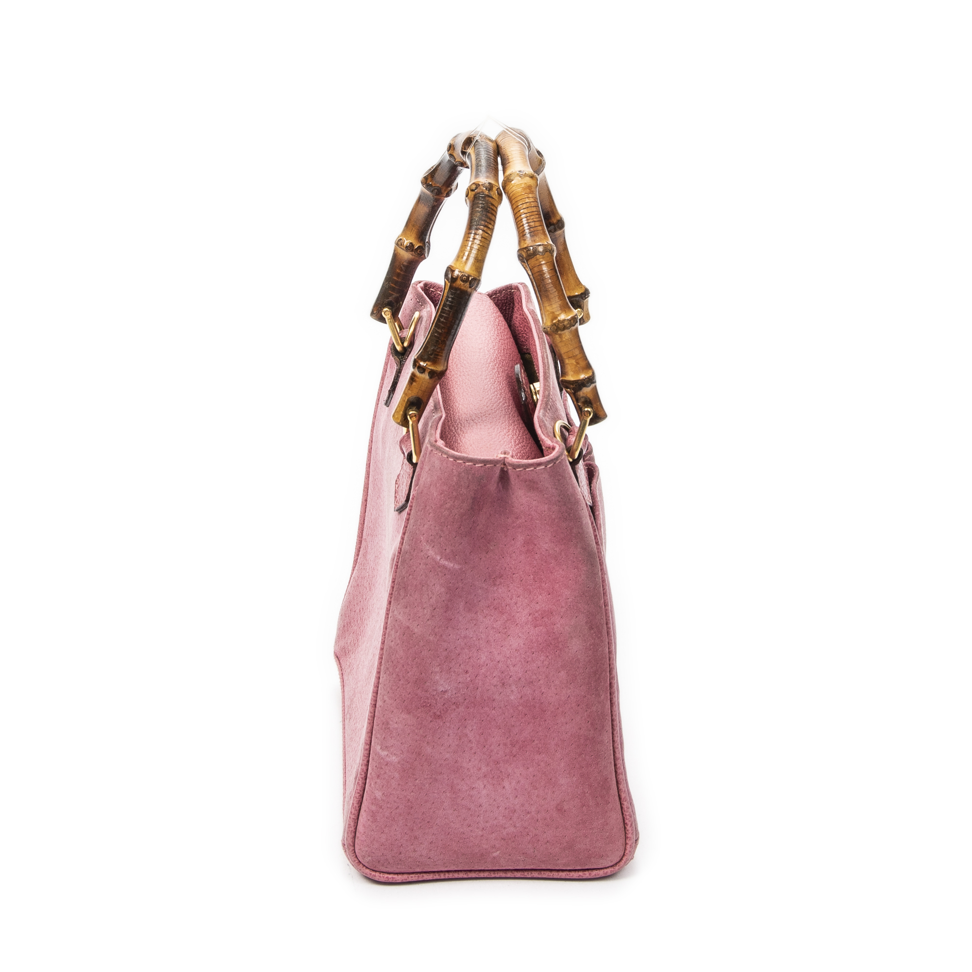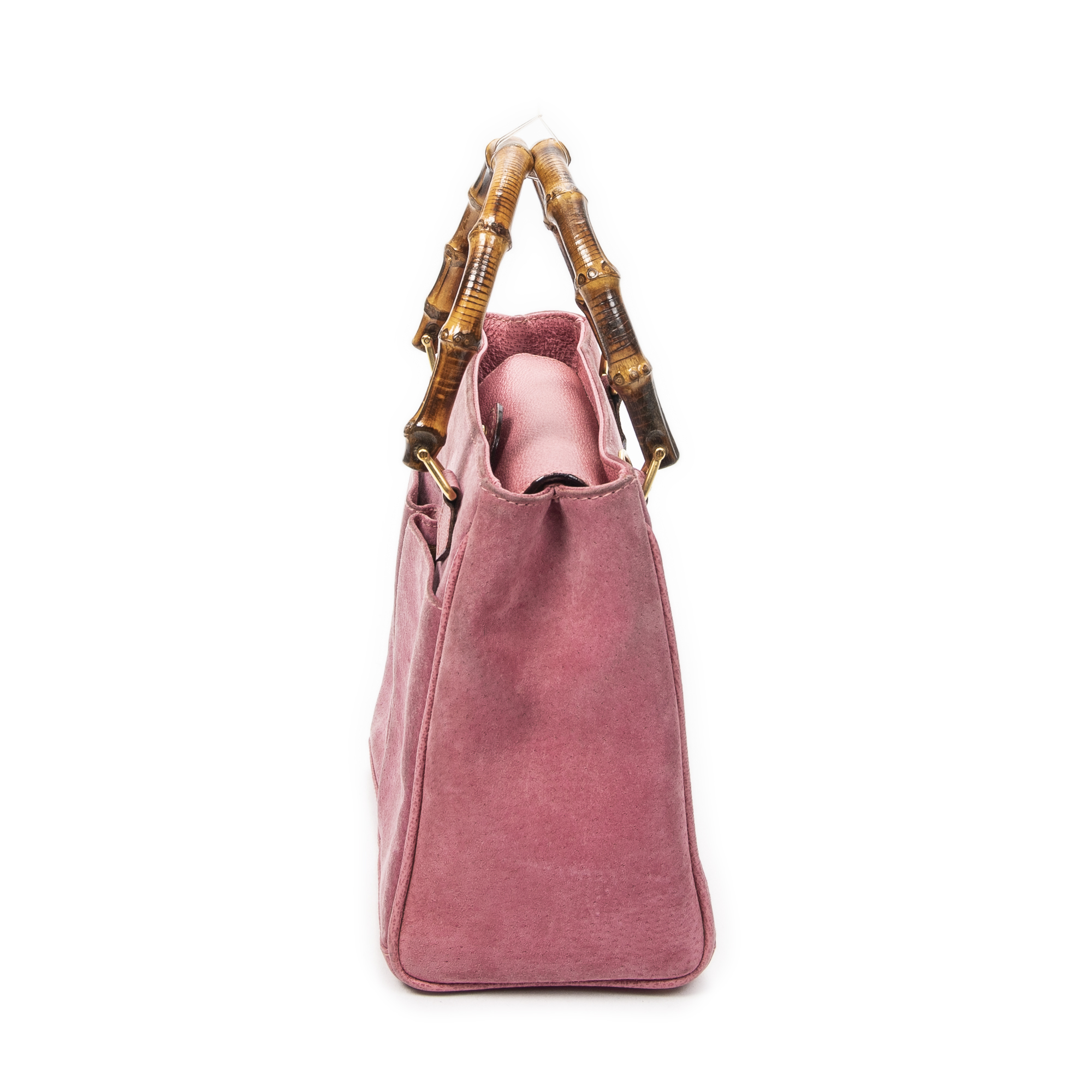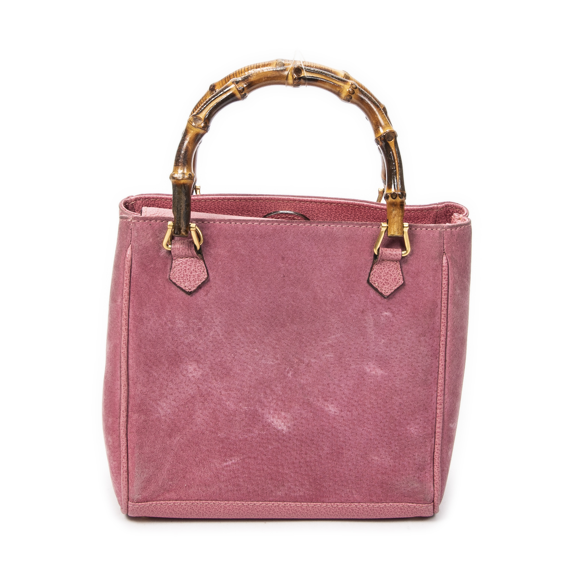 Gucci Shoulder Bag Vintage Small Bamboo Tote in Pink Suede Leather and Gold hardware. The product is in Very Good Condition (AB).