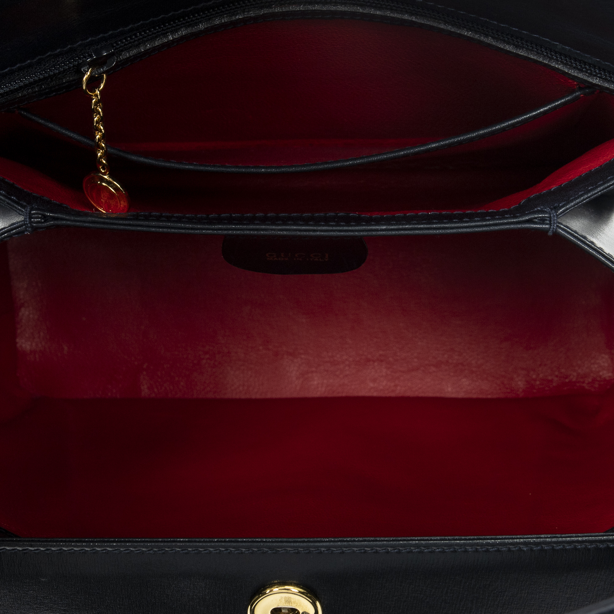 Gucci Shoulder Bag Vintage Turn Lock Top Handle in Navy Smooth Calfskin Leather and Gold hardware. The product is in Excellent Condition (A).