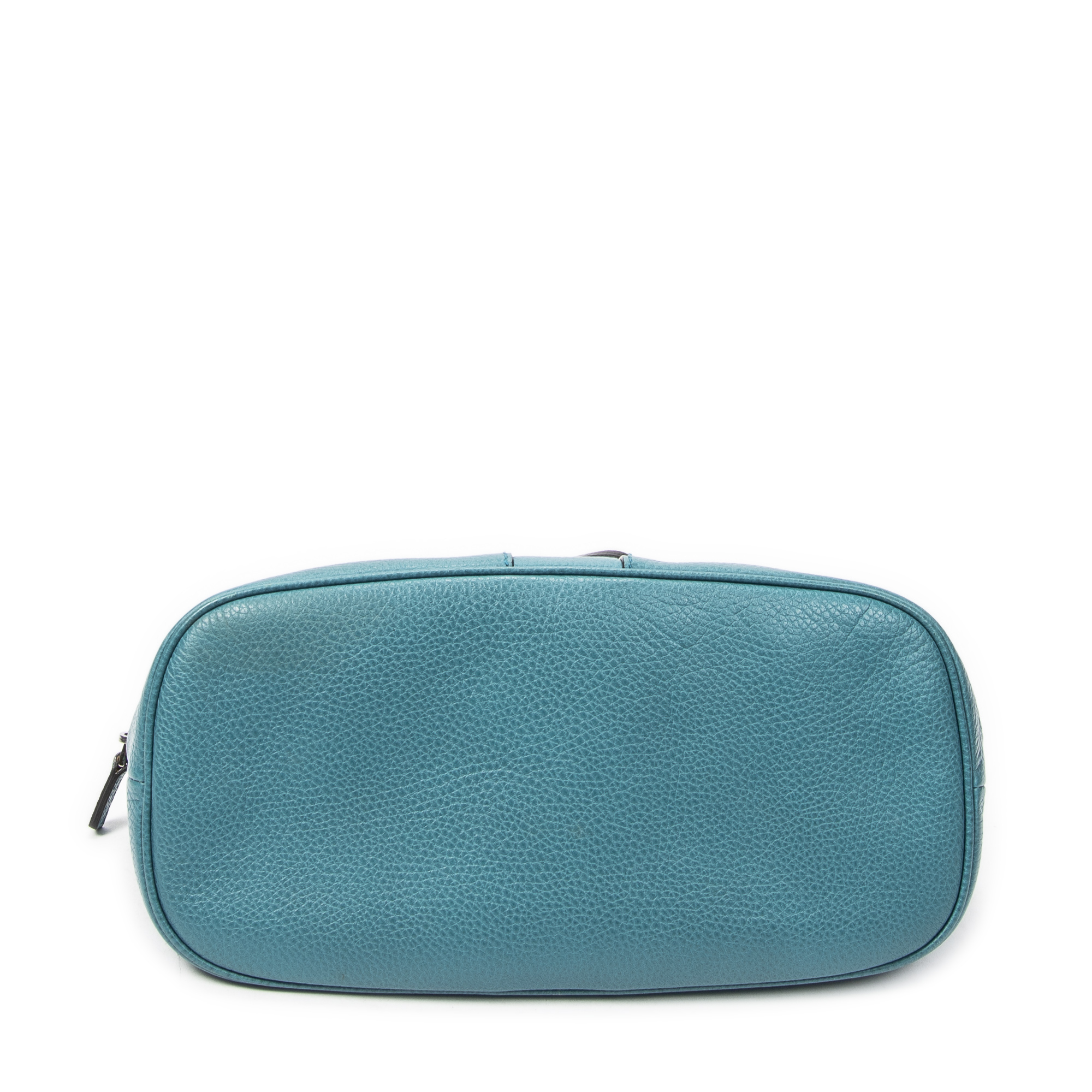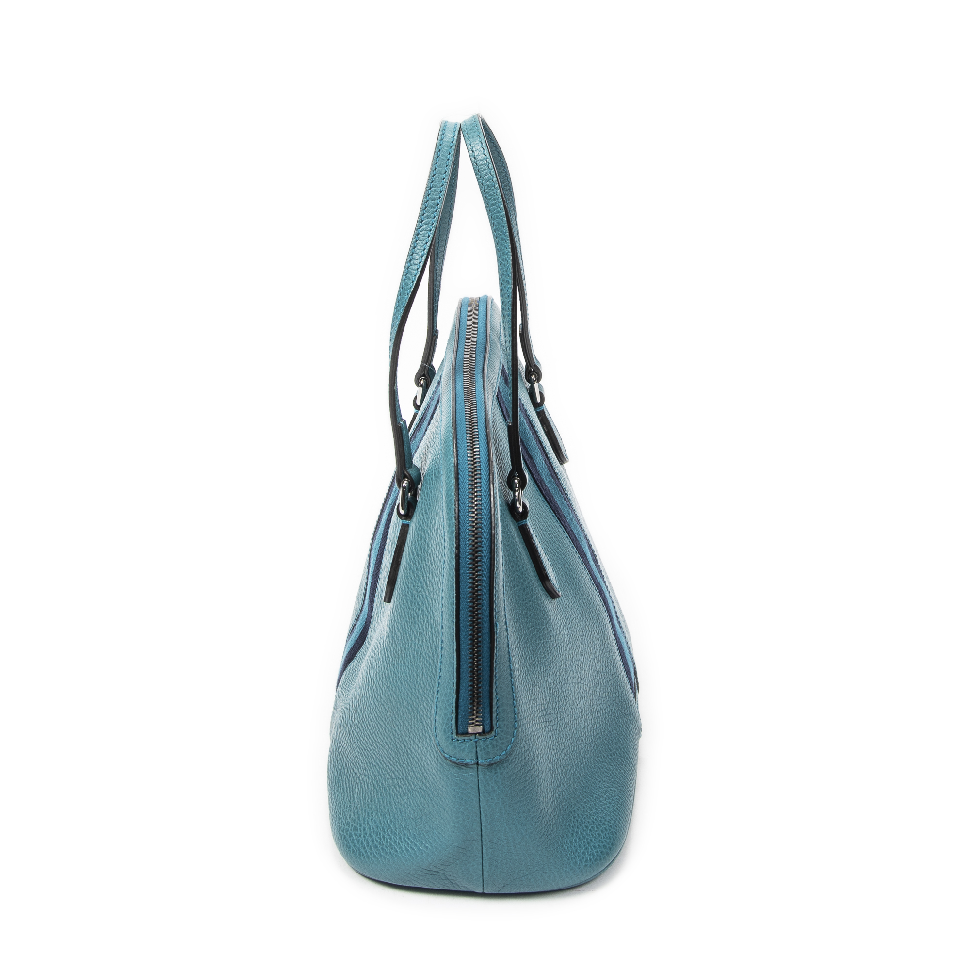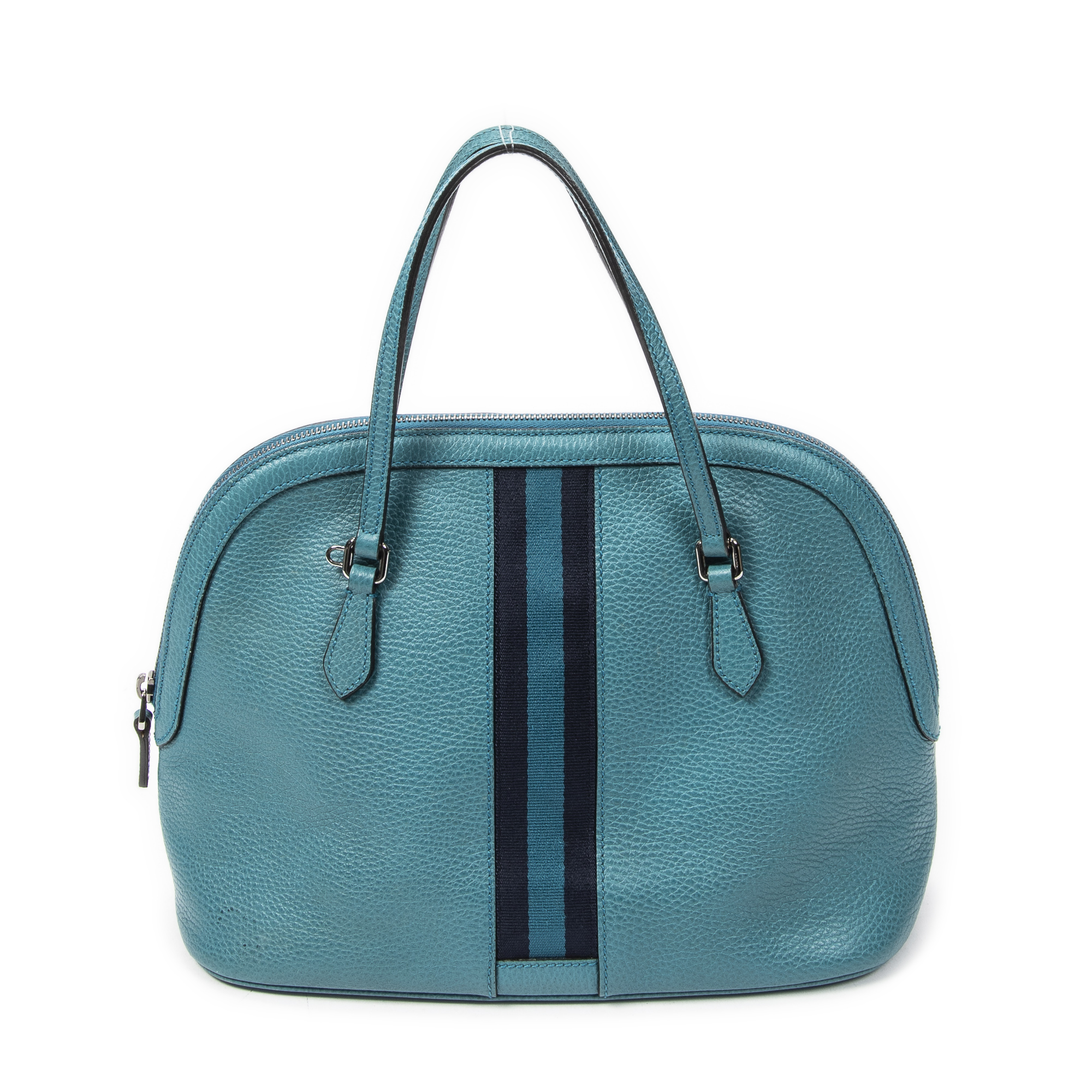 Gucci Shoulder Bag Web Dome Tote in Teal Grained Calfskin Leather and Silver hardware. The product is in Excellent Condition (A).