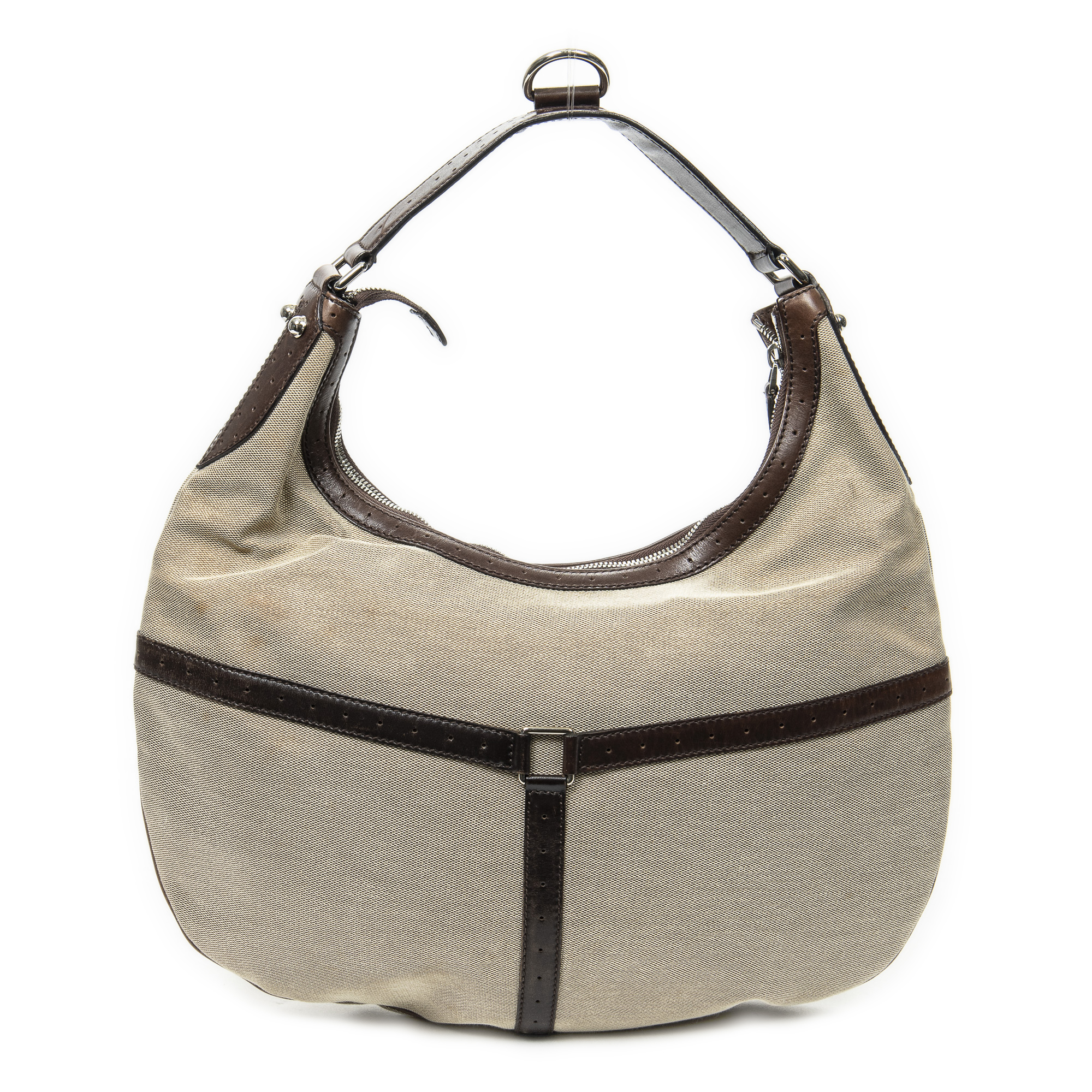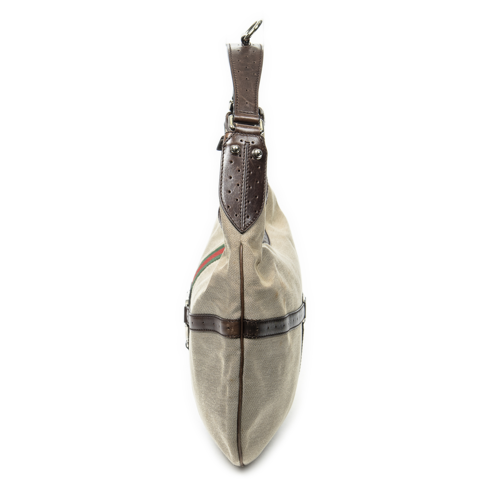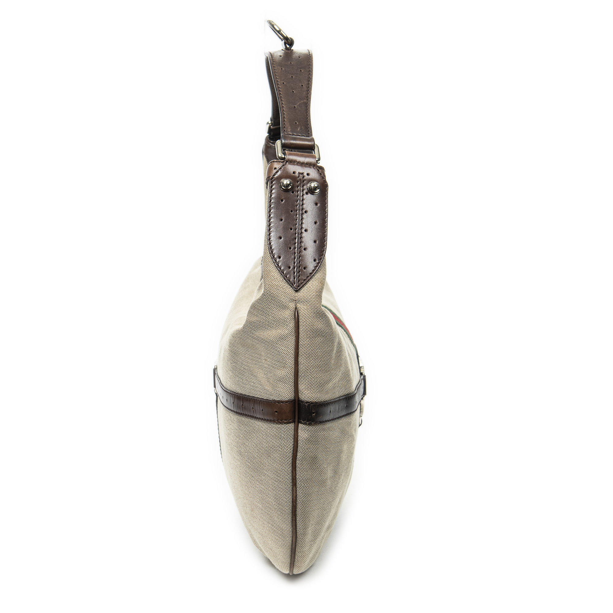 Gucci Shoulder bag Web GG Reins Hobo in Beige/Dark Brown Canvas and Silver hardware. The product is in Very Good Condition (AB).