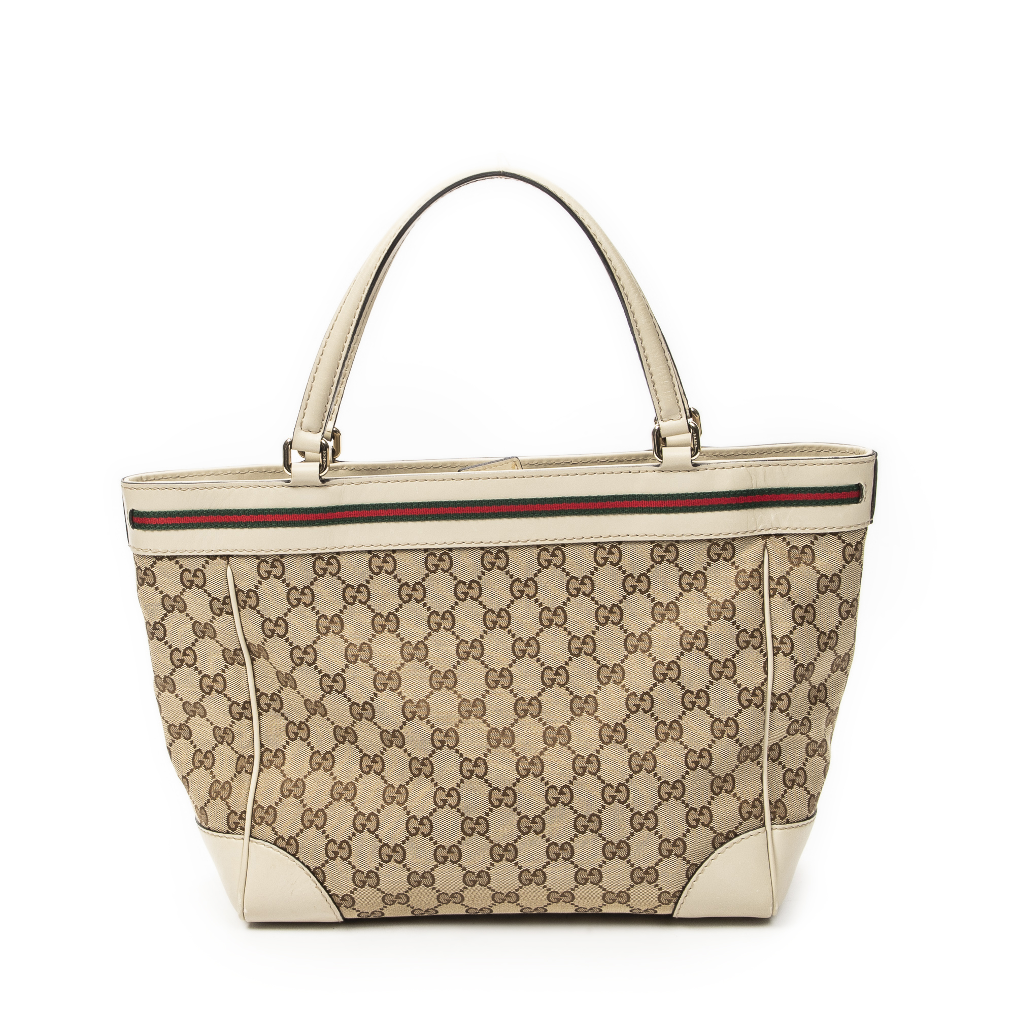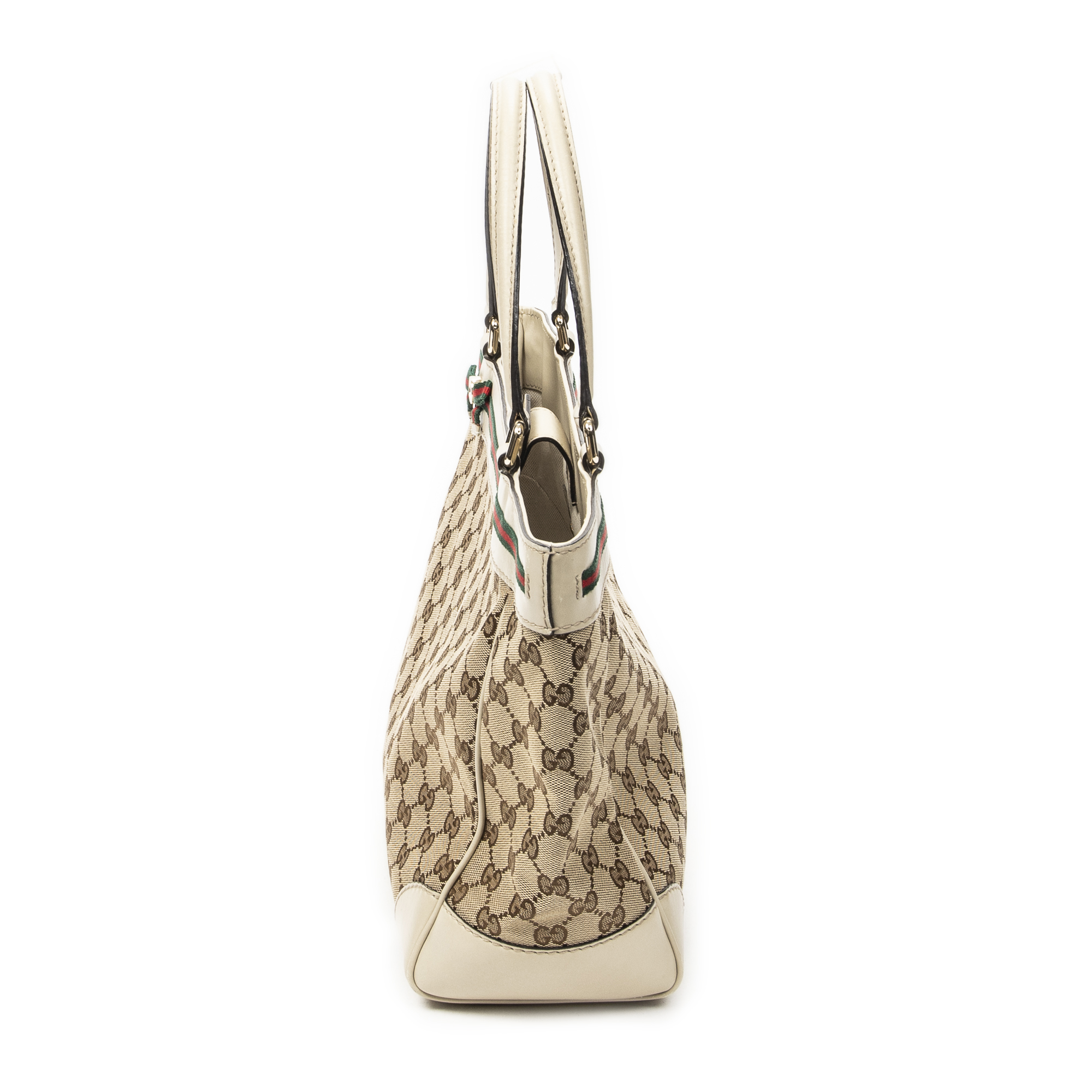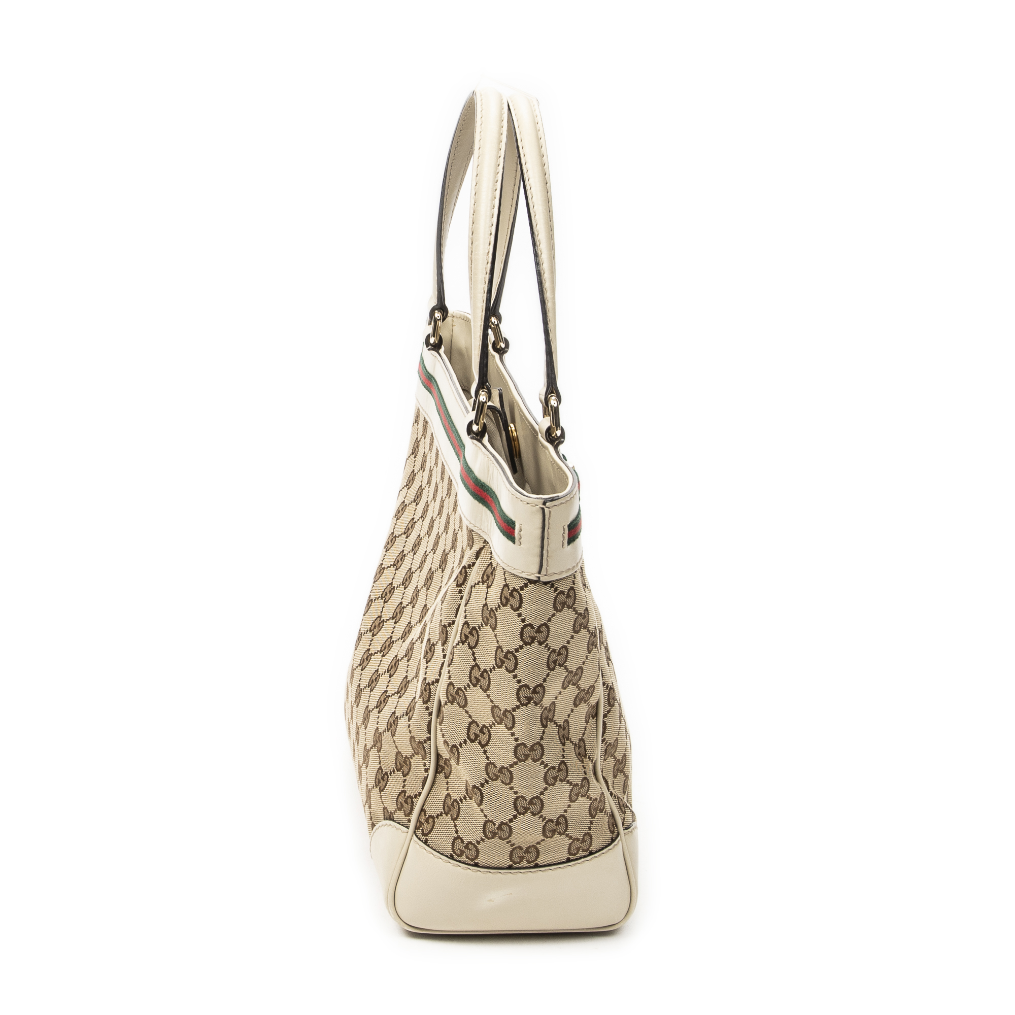 Gucci Shoulder Bag Web Mayfair Tote in Beige Monogrammed Canvas and Gold hardware. The product is in Excellent Condition (A).
