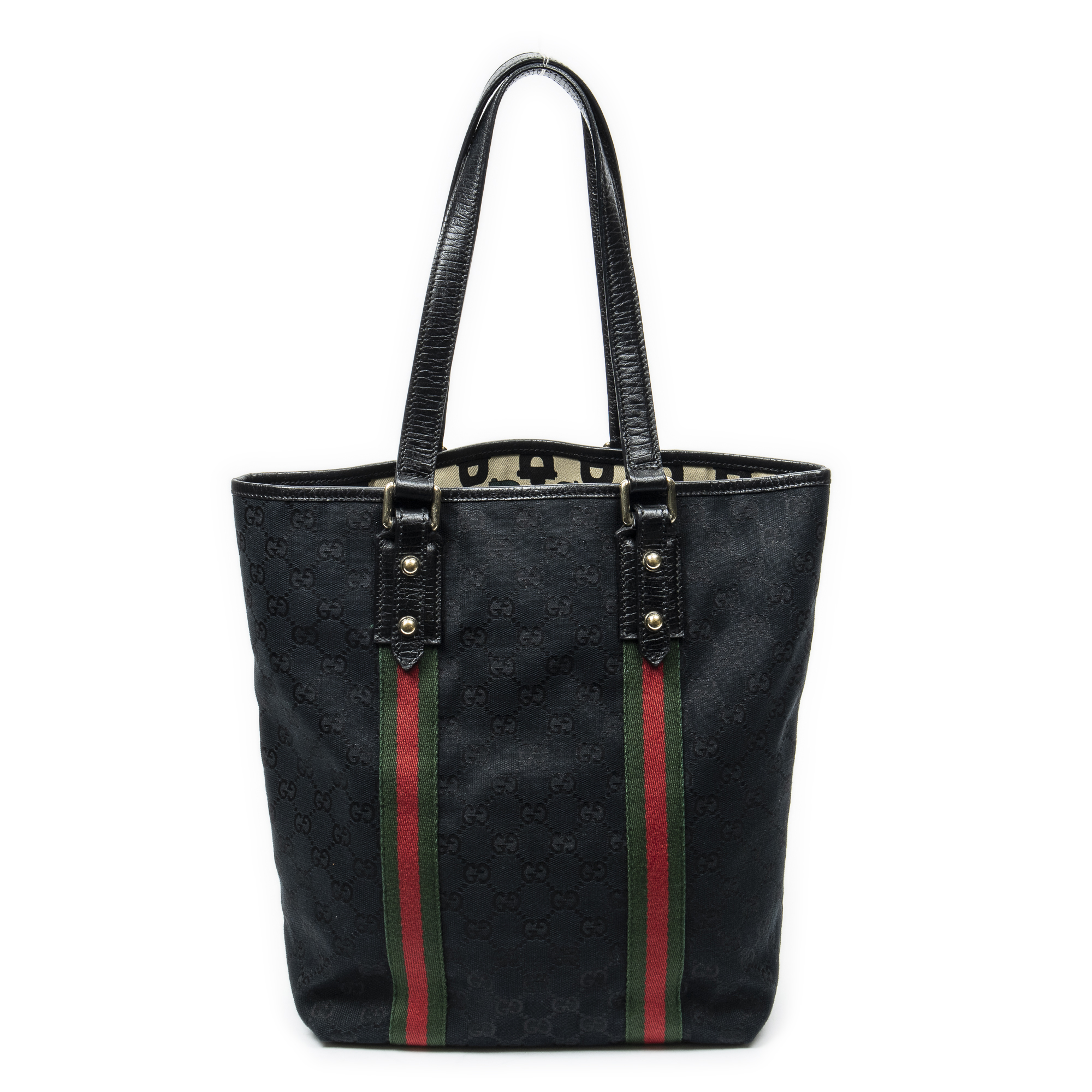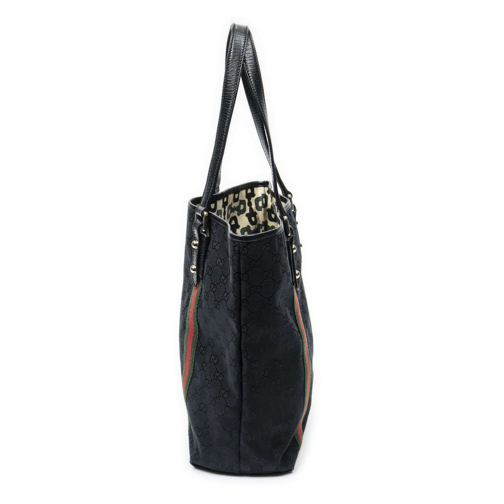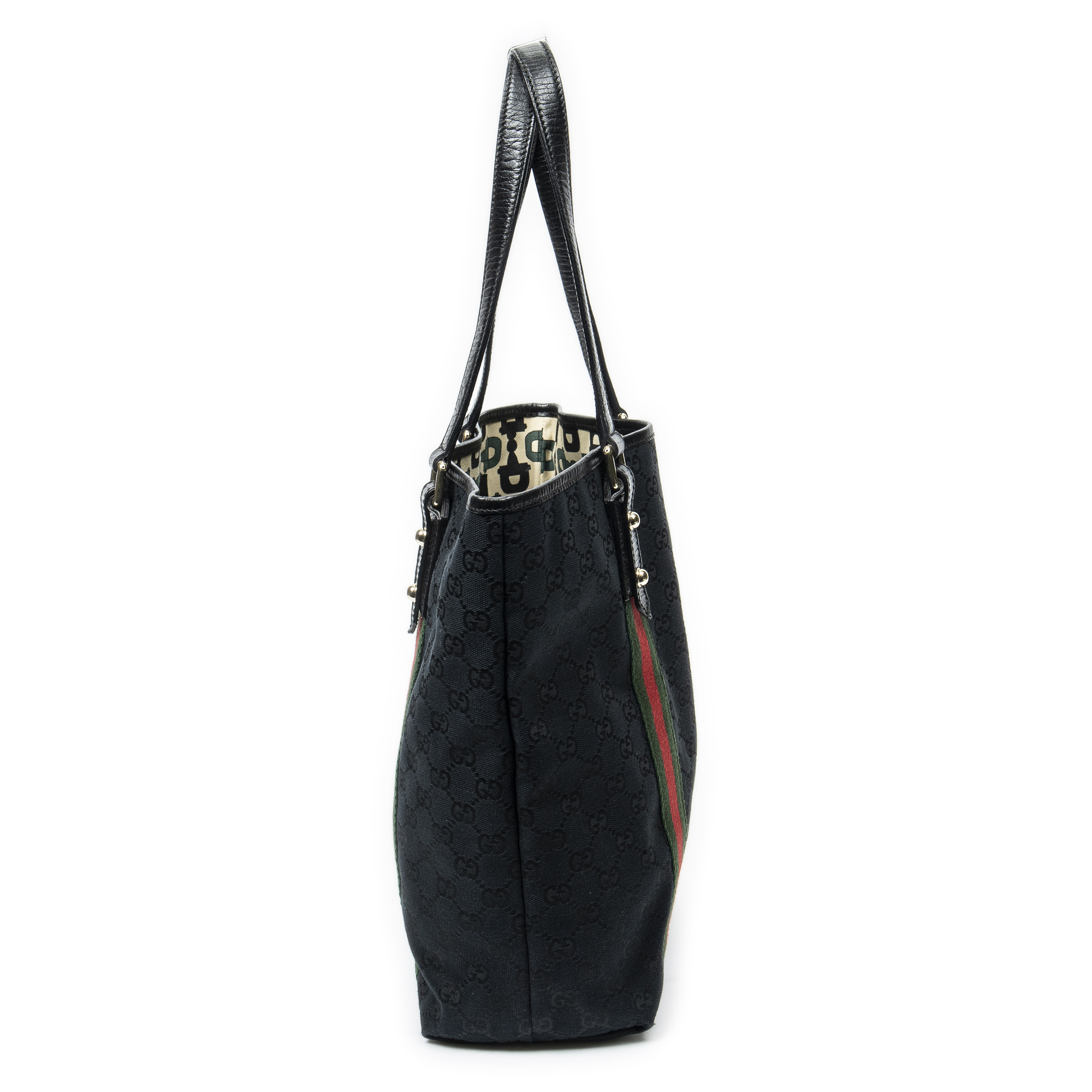 Gucci Shoulder Bag Web Vertical Jolicoeur Tote in Black Monogrammed Canvas and Gold hardware. The product is in Excellent Condition (A).