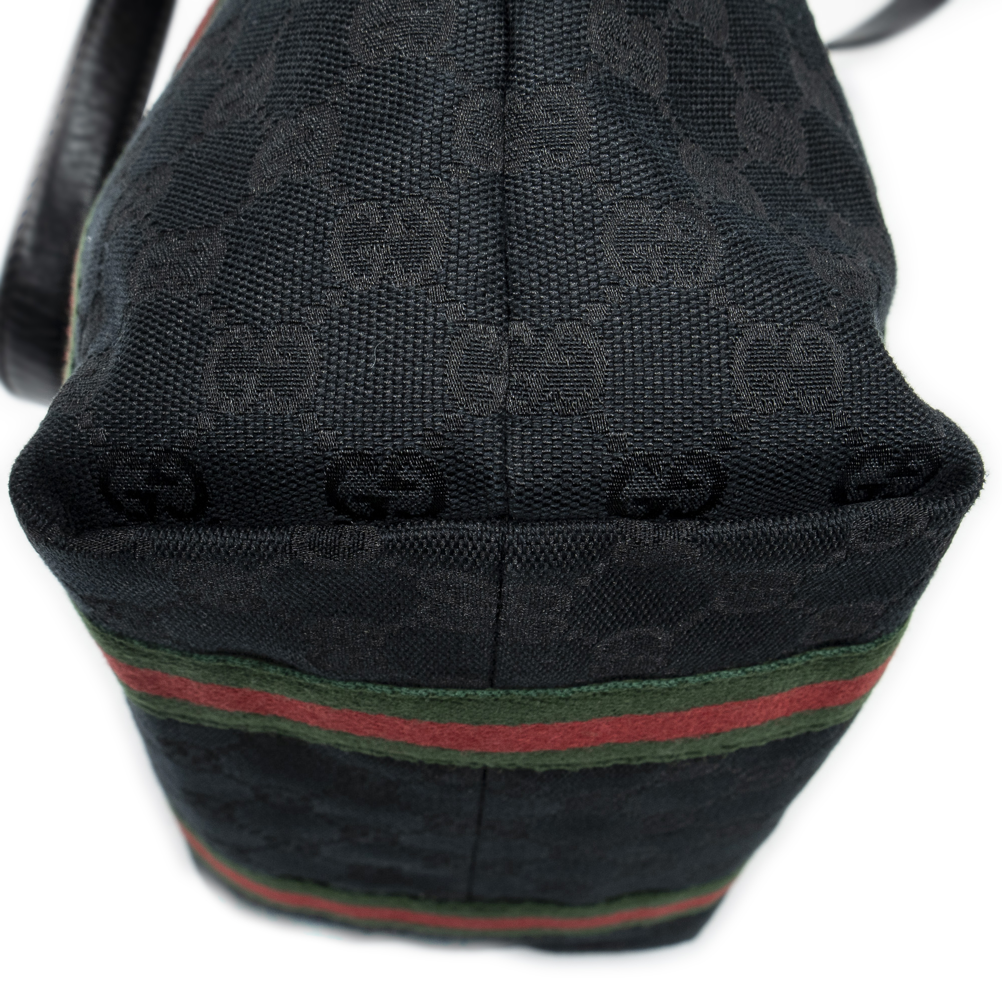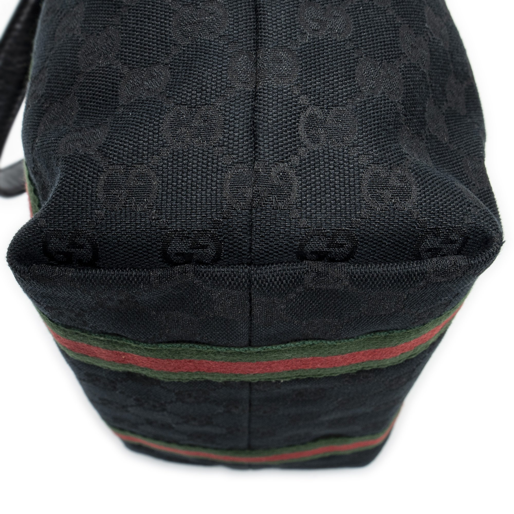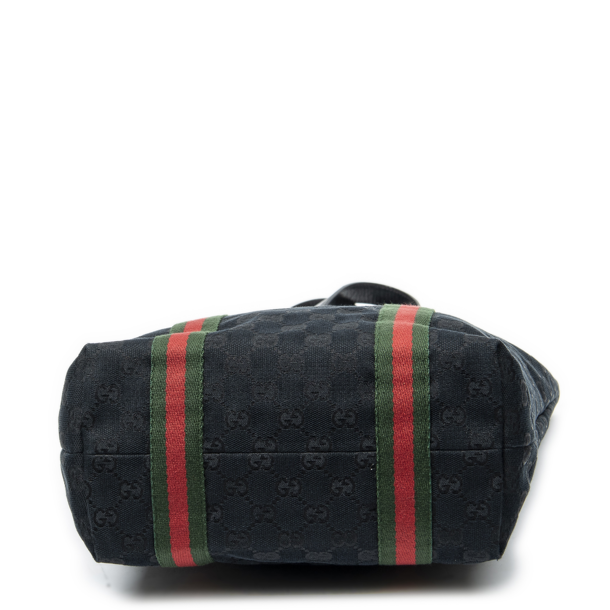 Gucci Shoulder Bag Web Vertical Jolicoeur Tote in Black Monogrammed Canvas and Gold hardware. The product is in Excellent Condition (A).