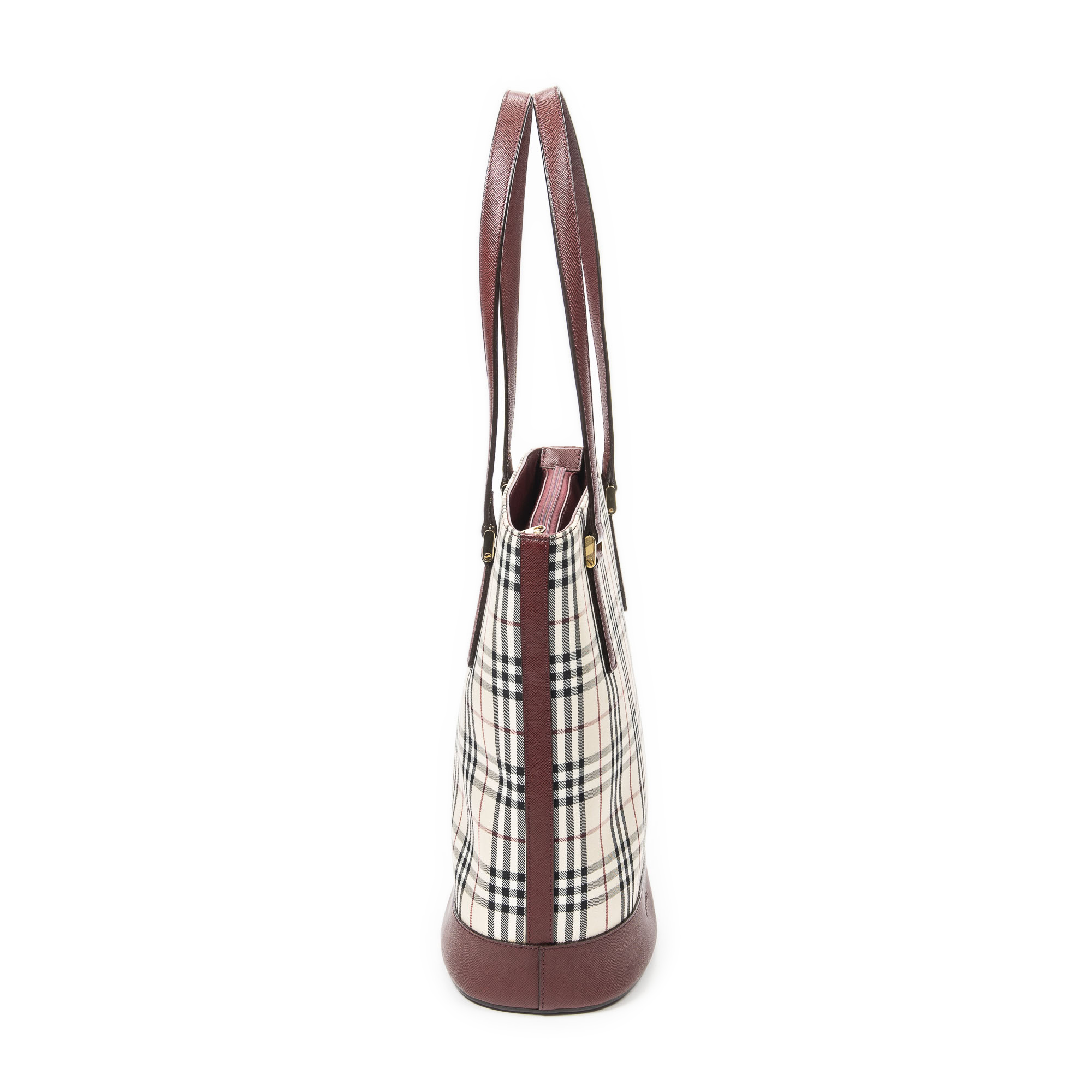 Burberry Shoulder Bag Zip Bucket Tote in Beige/Red Nova Check Coated Canvas and Gold hardware. The product is in Excellent Condition (A).
