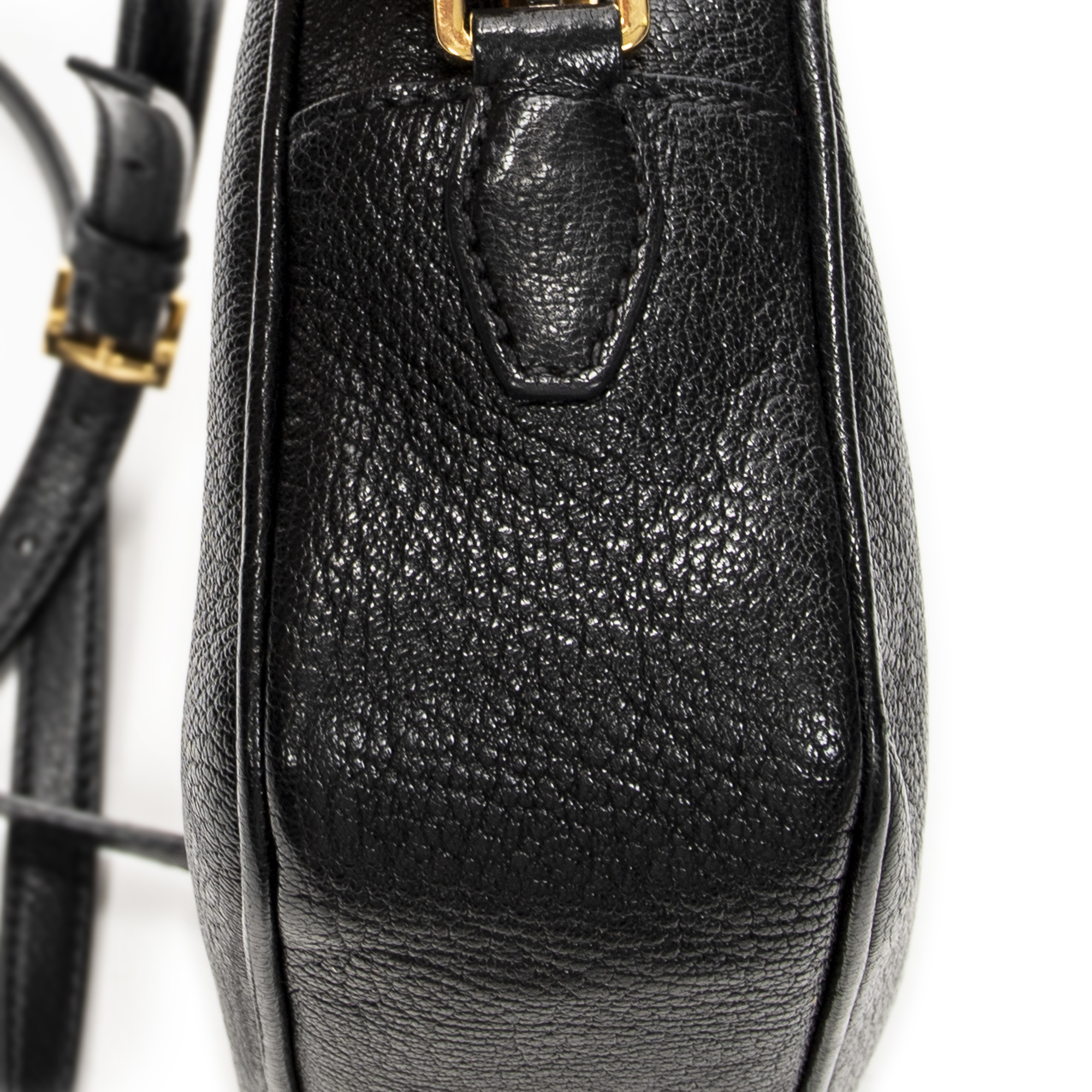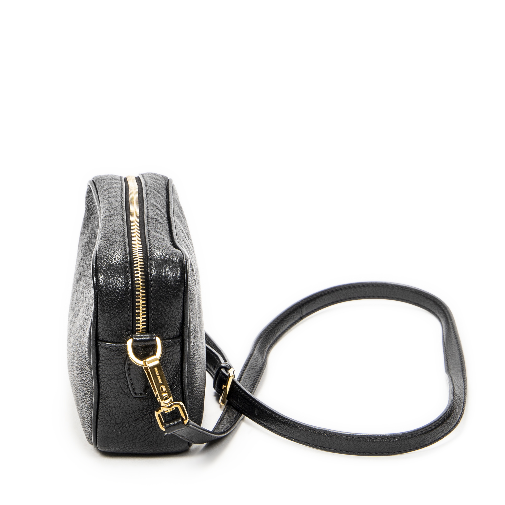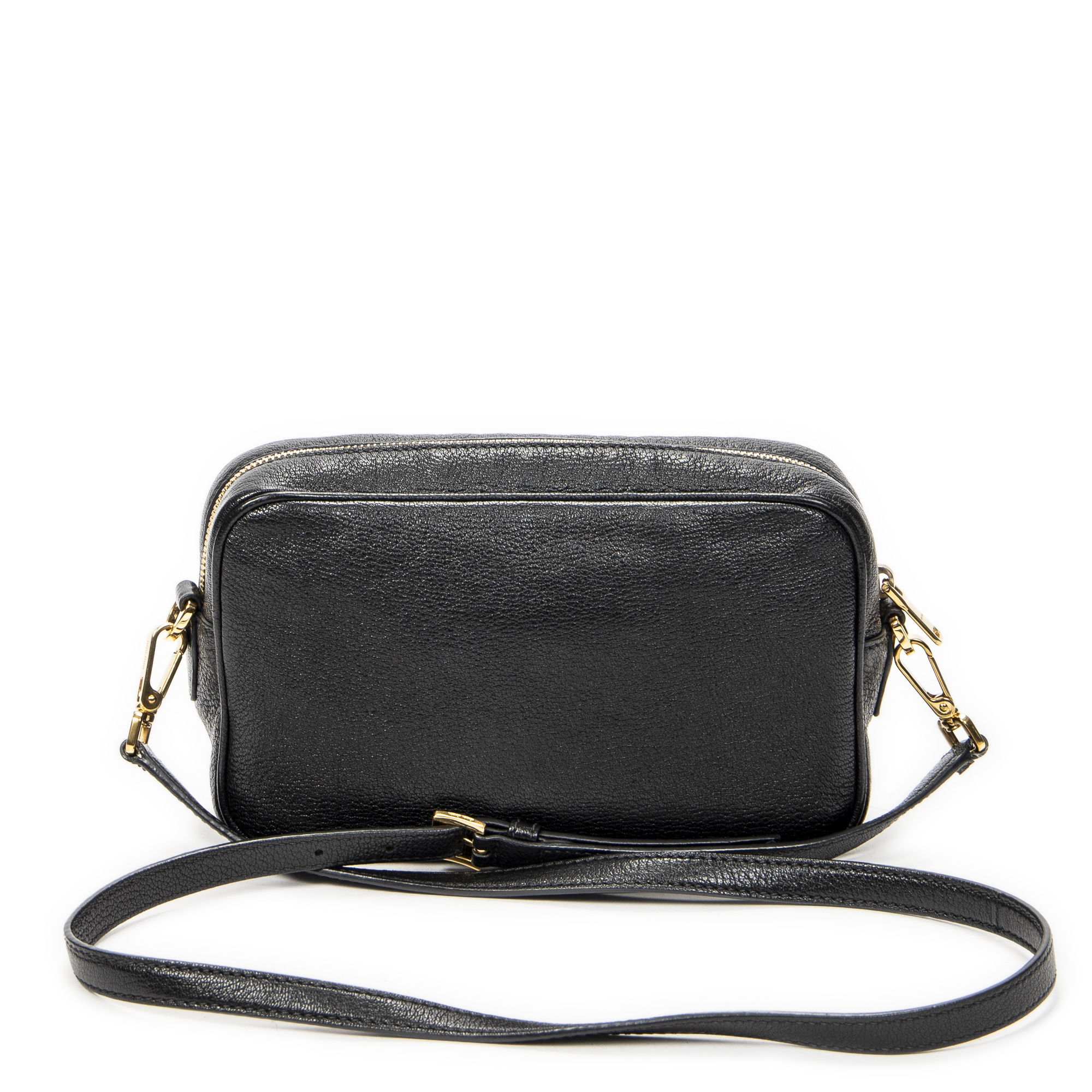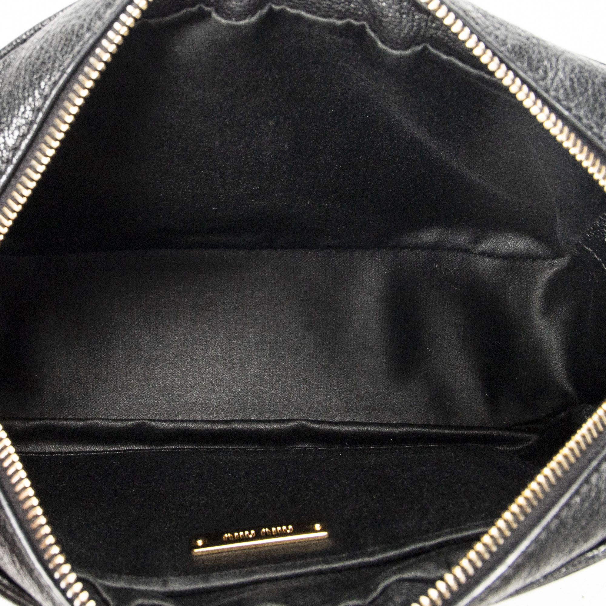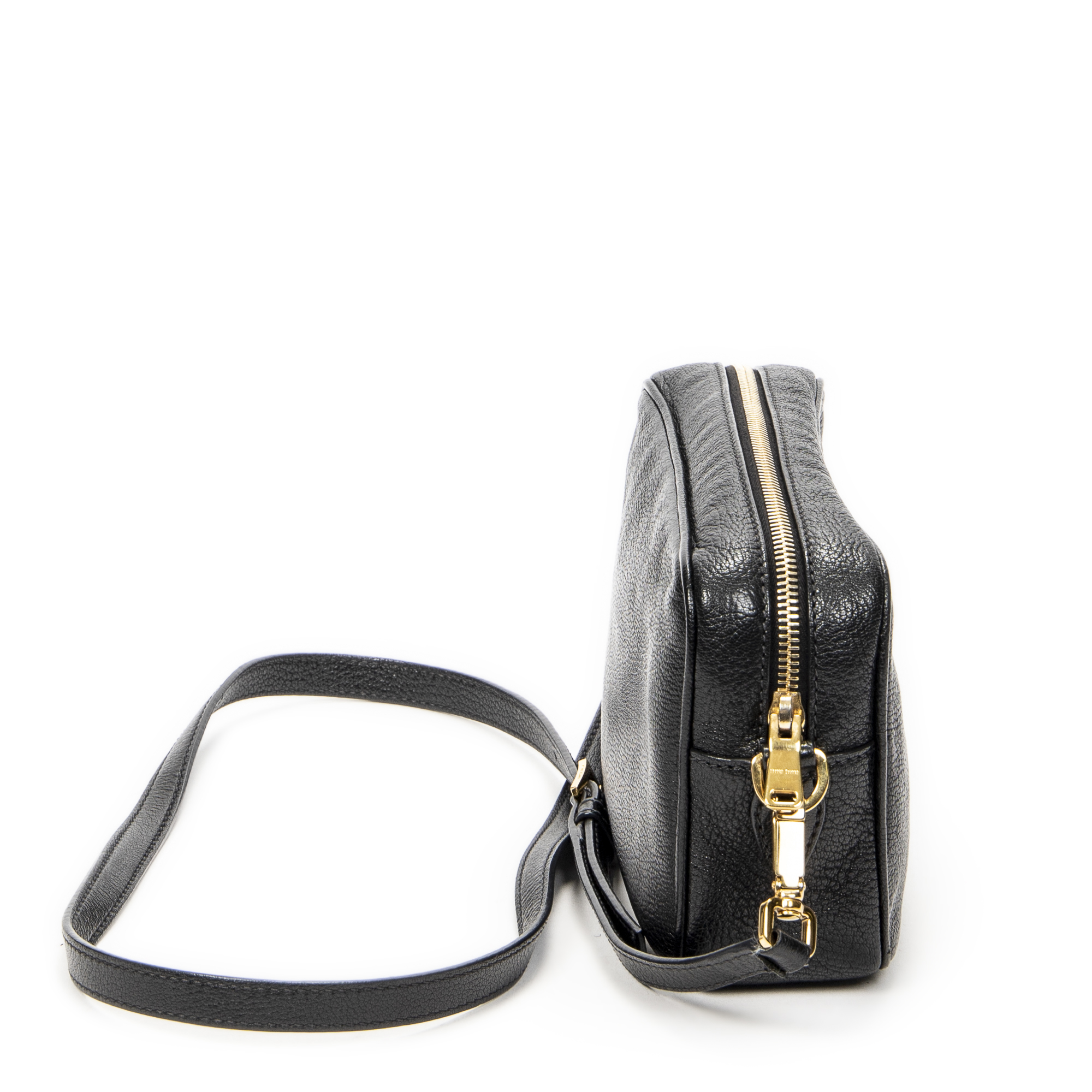 Miu Miu Shoulder Bag Zip Camera Crossbody in Black Goatskin Leather and Gold hardware. The product is in Excellent Condition (A).