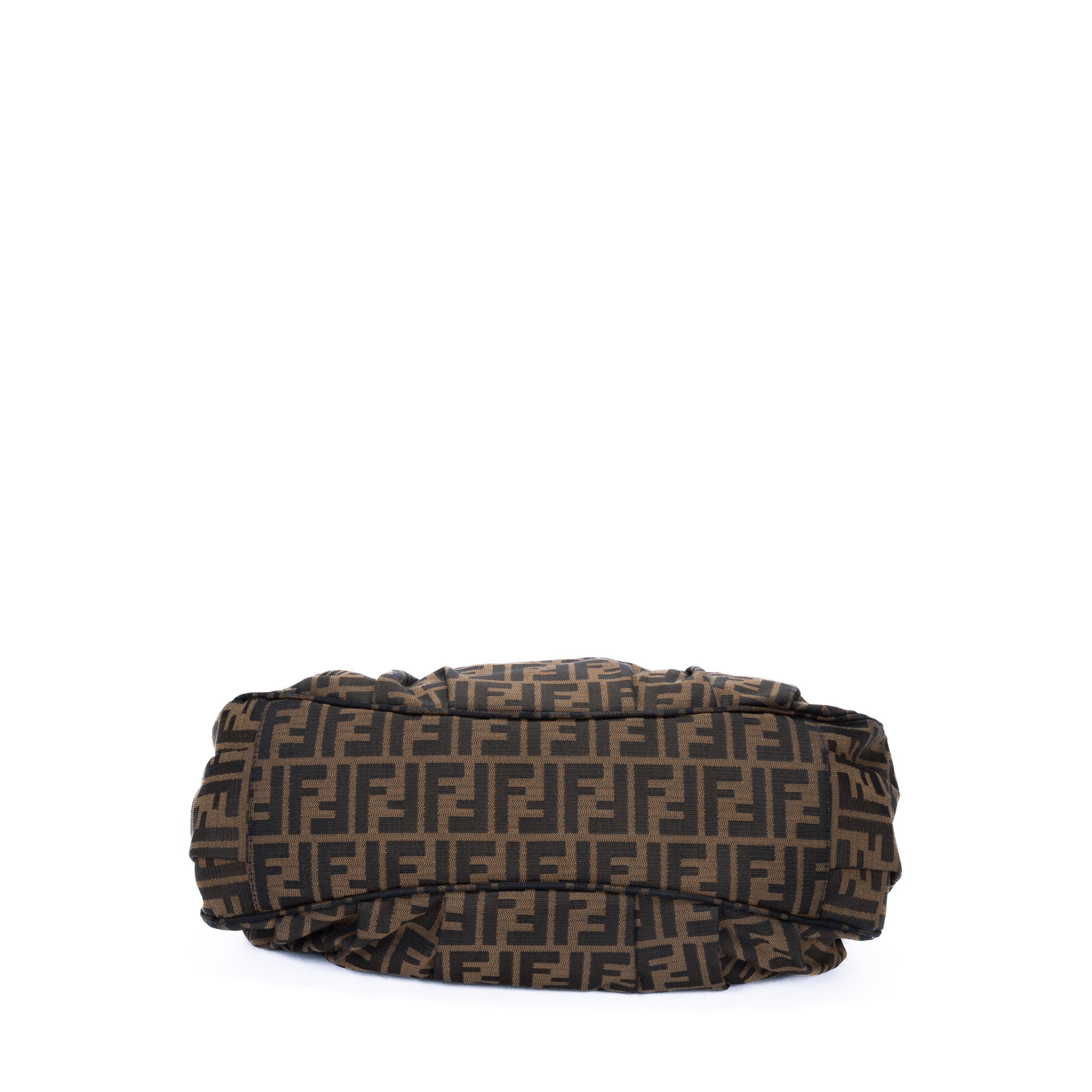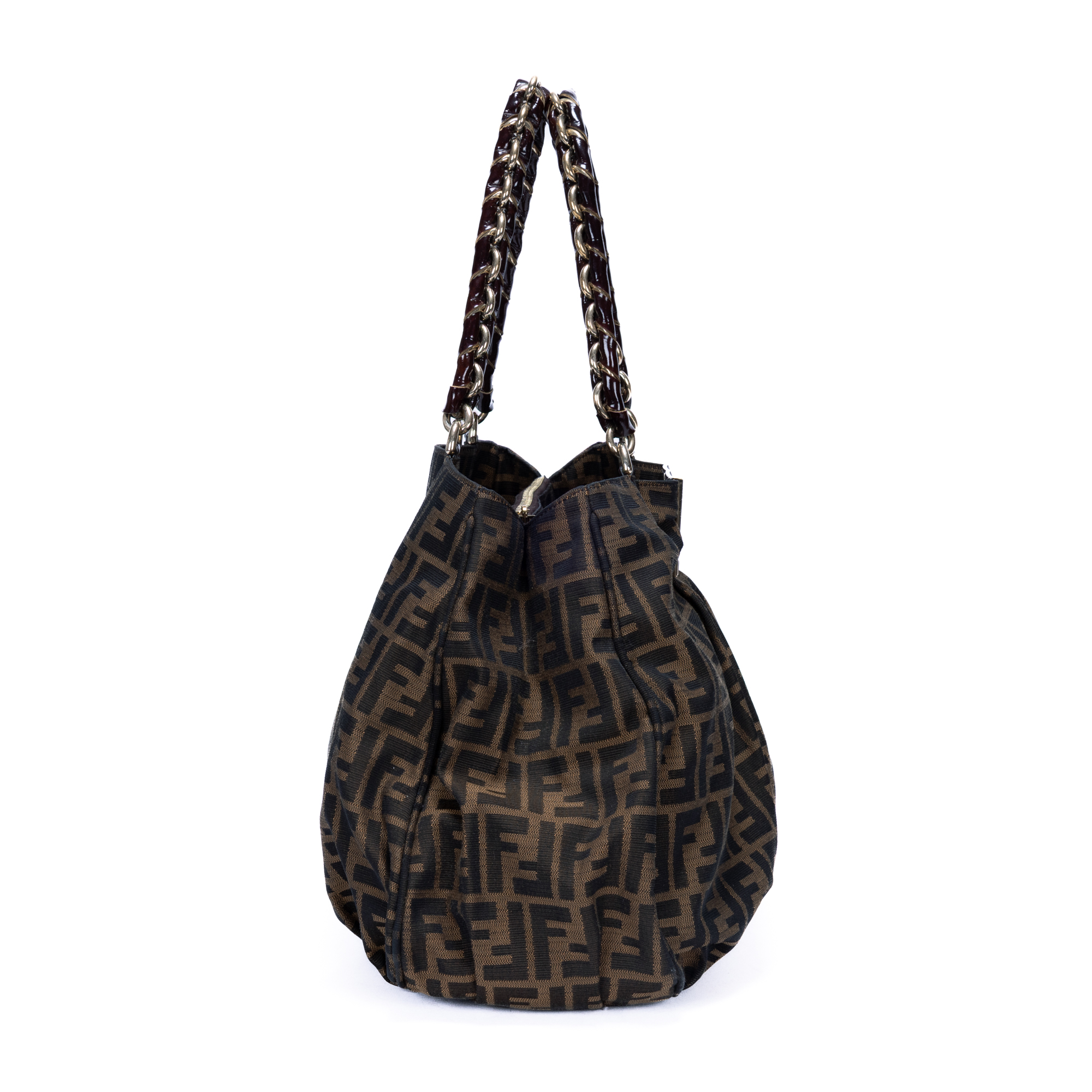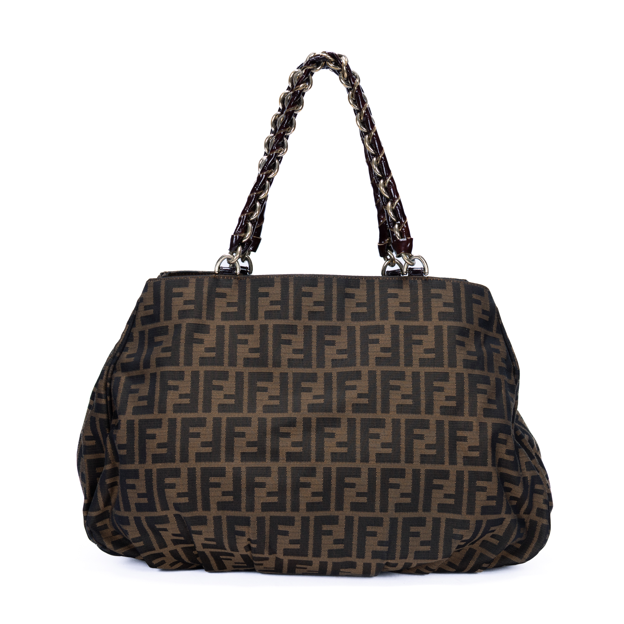 Fendi Shoulder Bag Zucca Mia Tote in Black/Beige Zucca Canvas and Champagne Gold hardware. The product is in Excellent Condition (A).