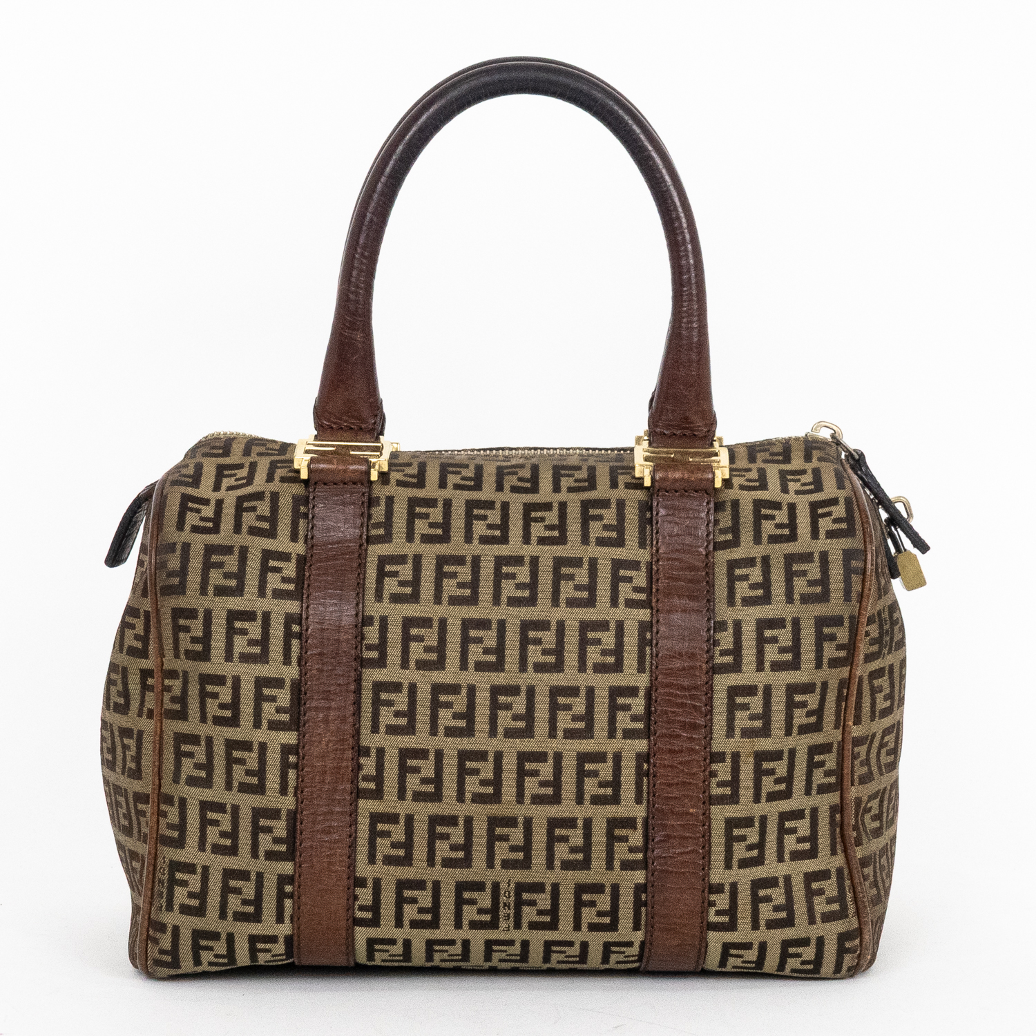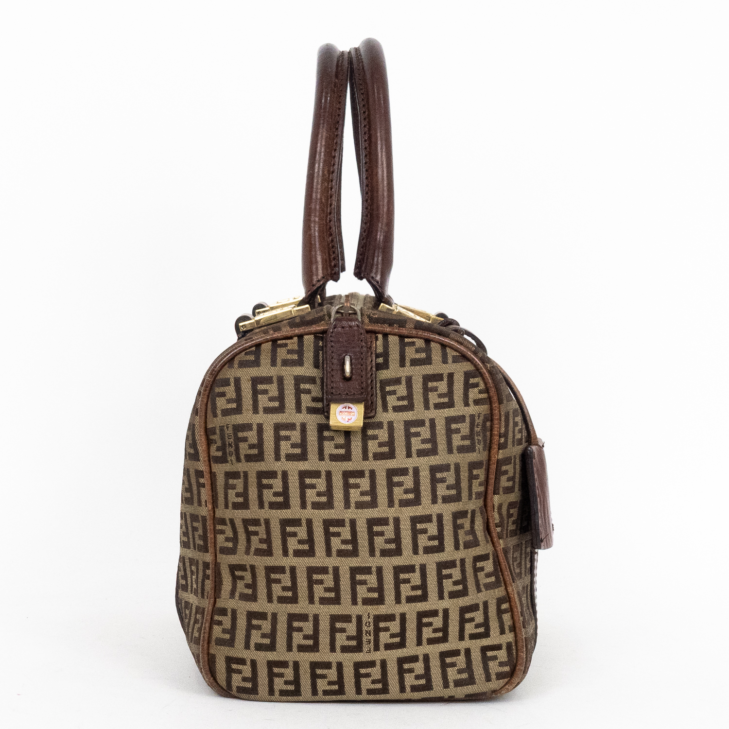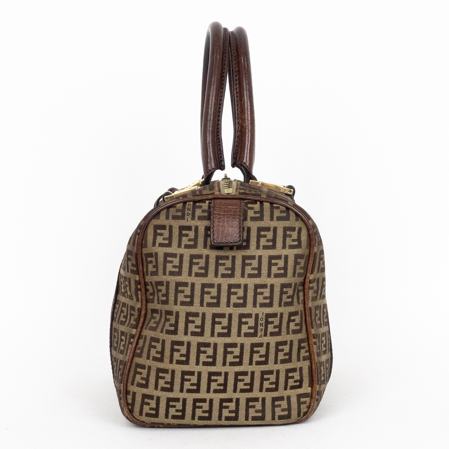 Fendi Travel Bag Boston Small in Brown Zucchino Canvas and Gold hardware. The product is in Very Good Condition (AB).