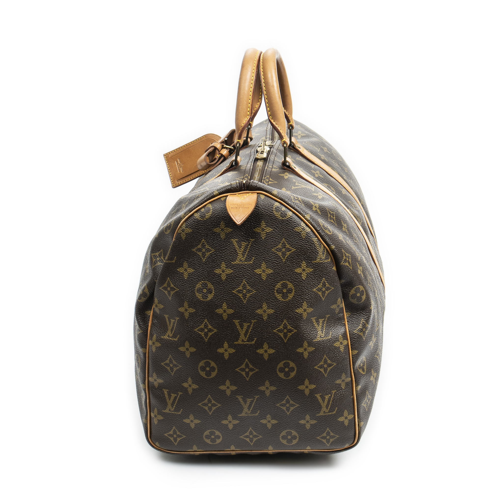 Louis Vuitton Travel Bag Keepall 50 in Brown Monogram Canvas and Golden Brass hardware. The product is in Very Good Condition (AB).