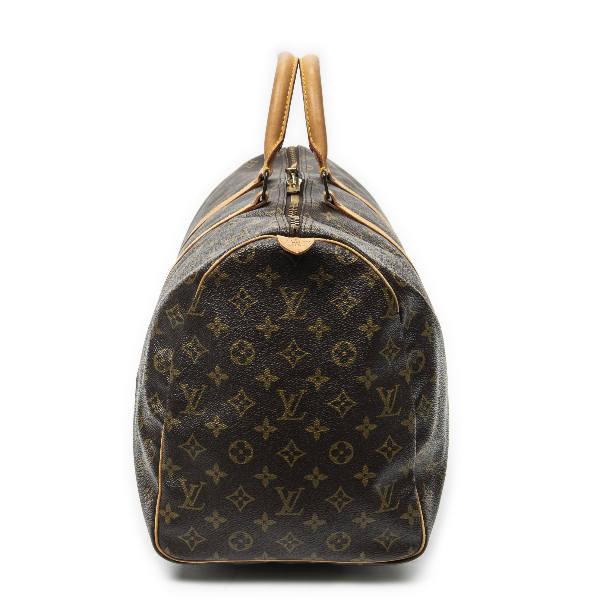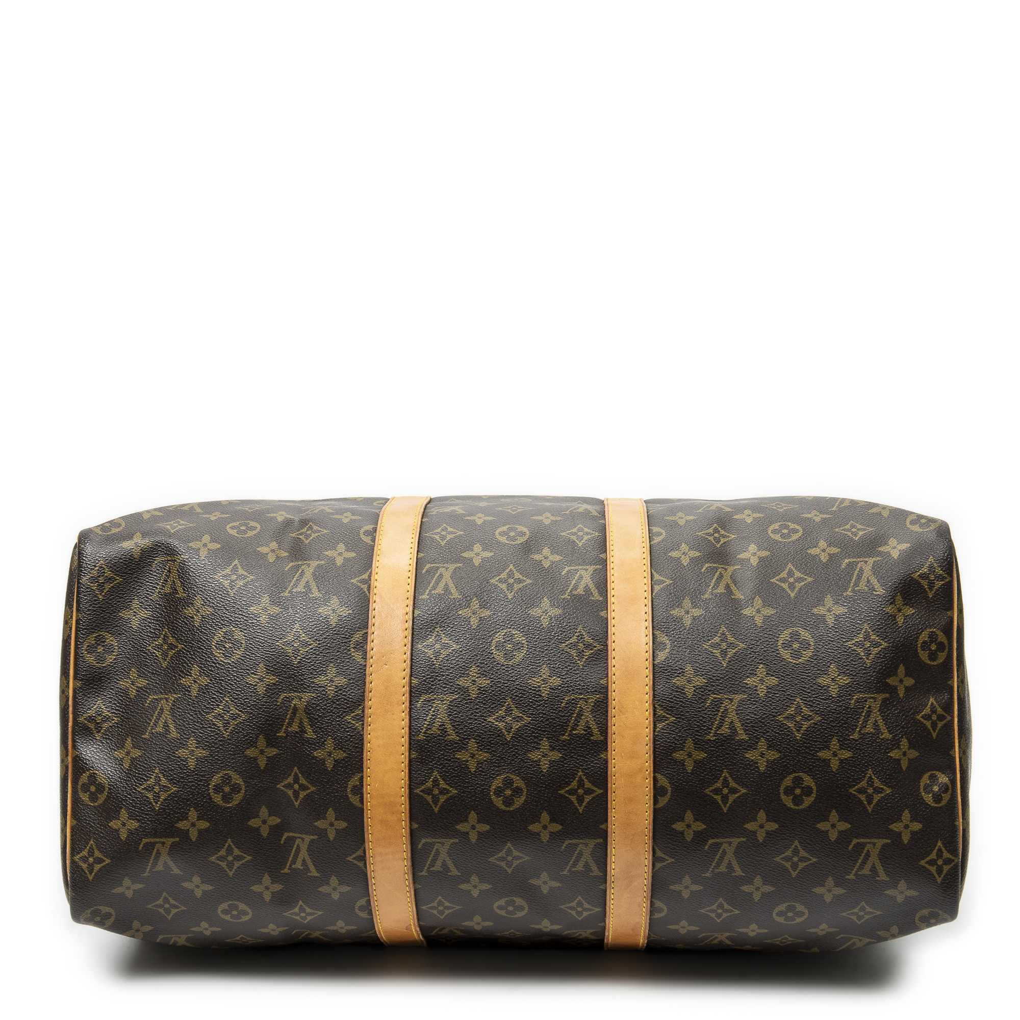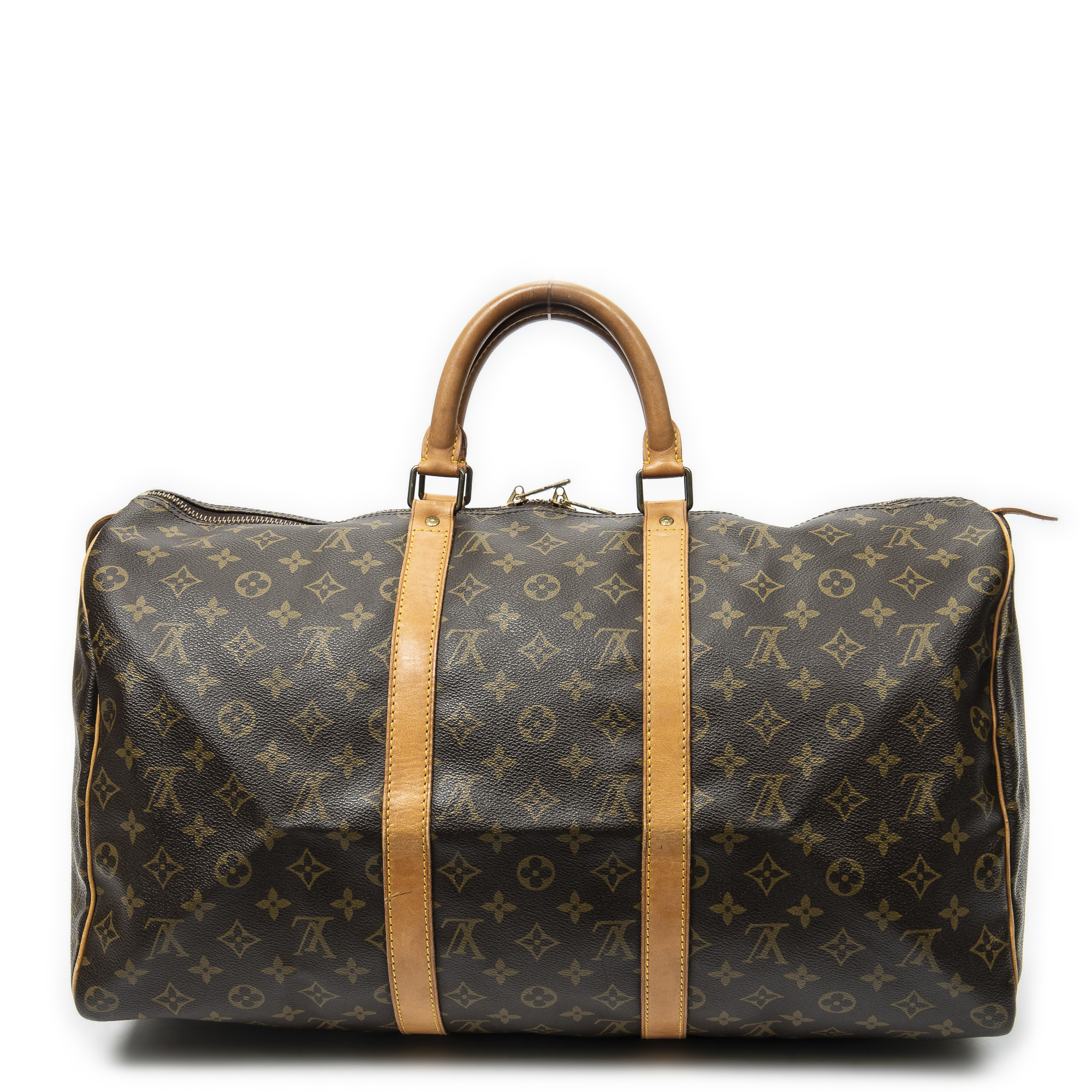 Louis Vuitton Travel Bag Keepall 50 in Brown Monogram Canvas and Golden Brass hardware. The product is in Very Good Condition (AB).