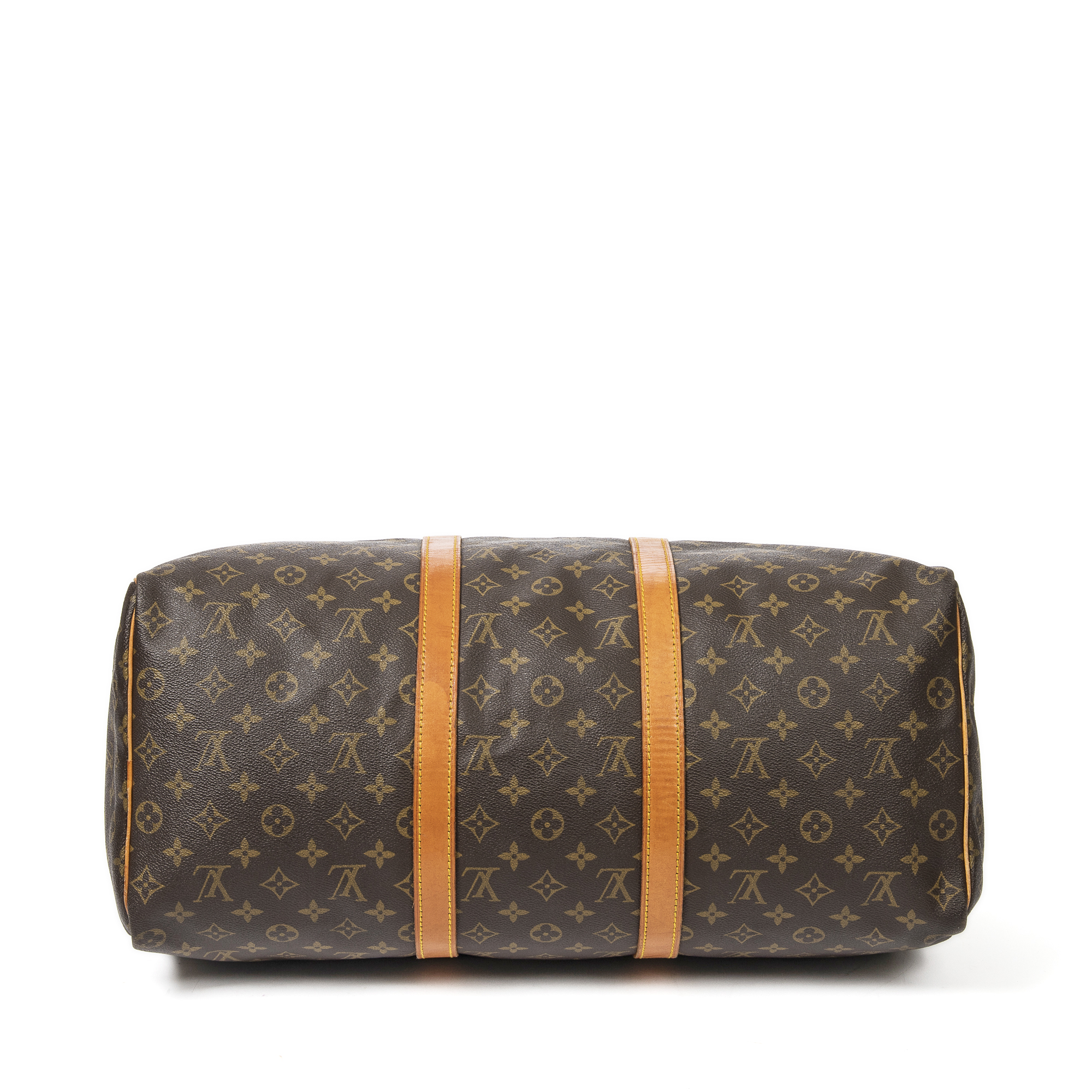 Louis Vuitton Travel Bag Keepall 50 in Brown Monogram Canvas and Golden Brass hardware. The product is in Very Good Condition (AB).