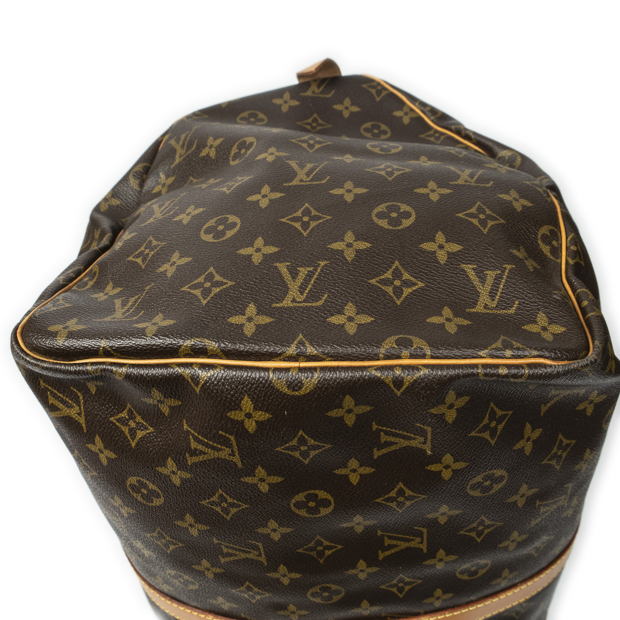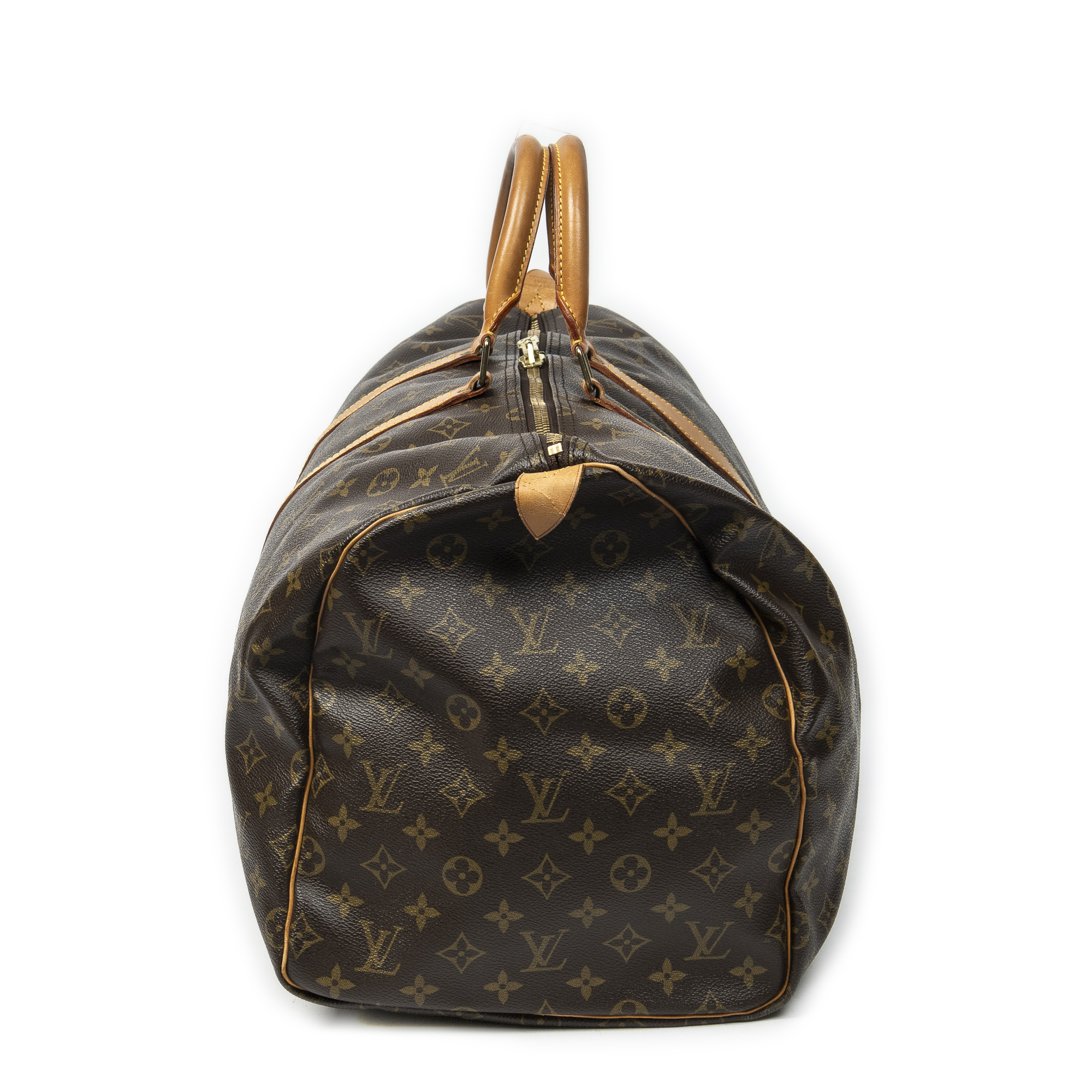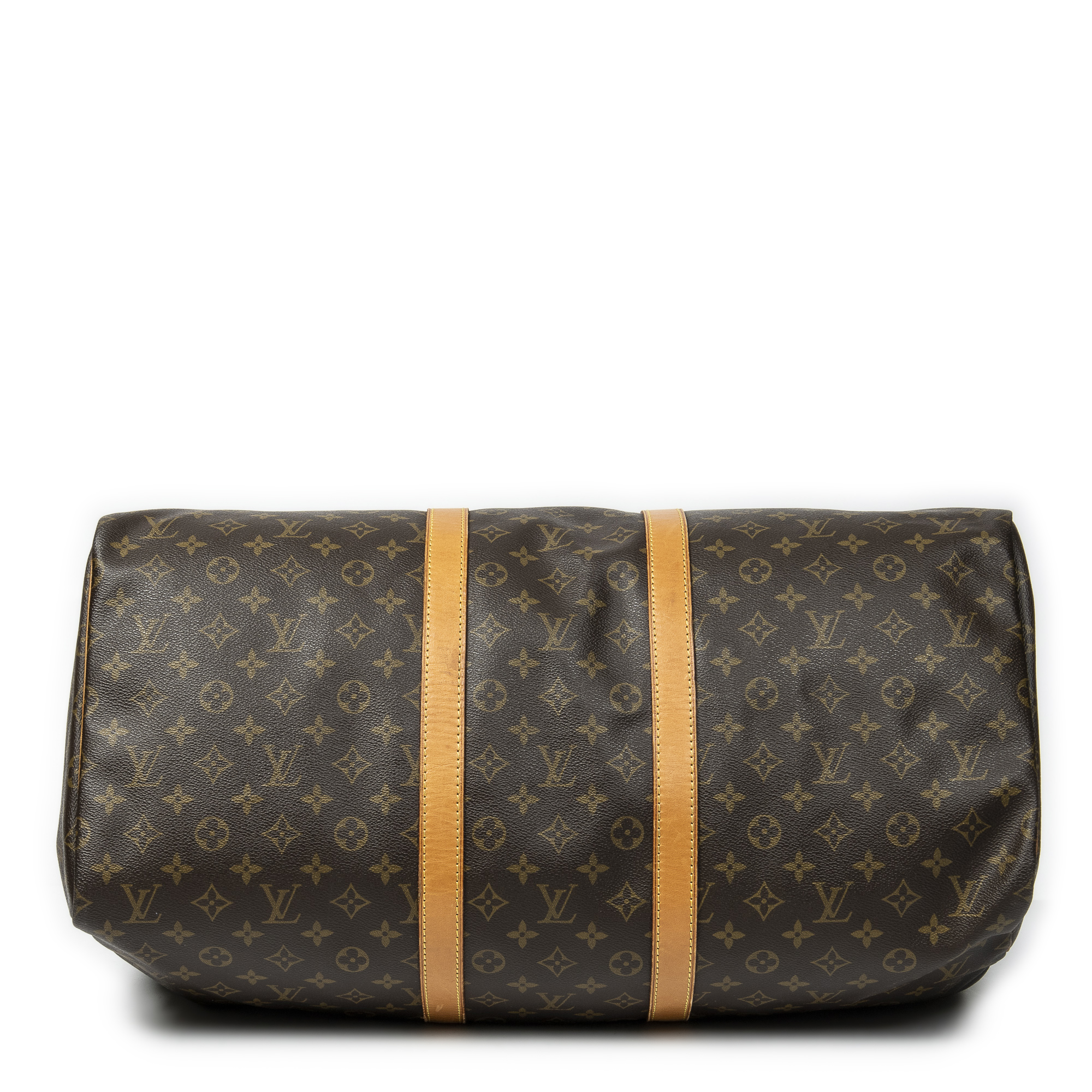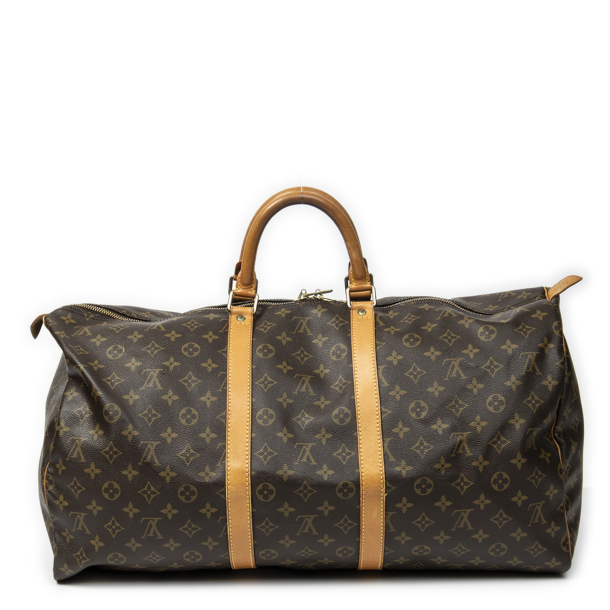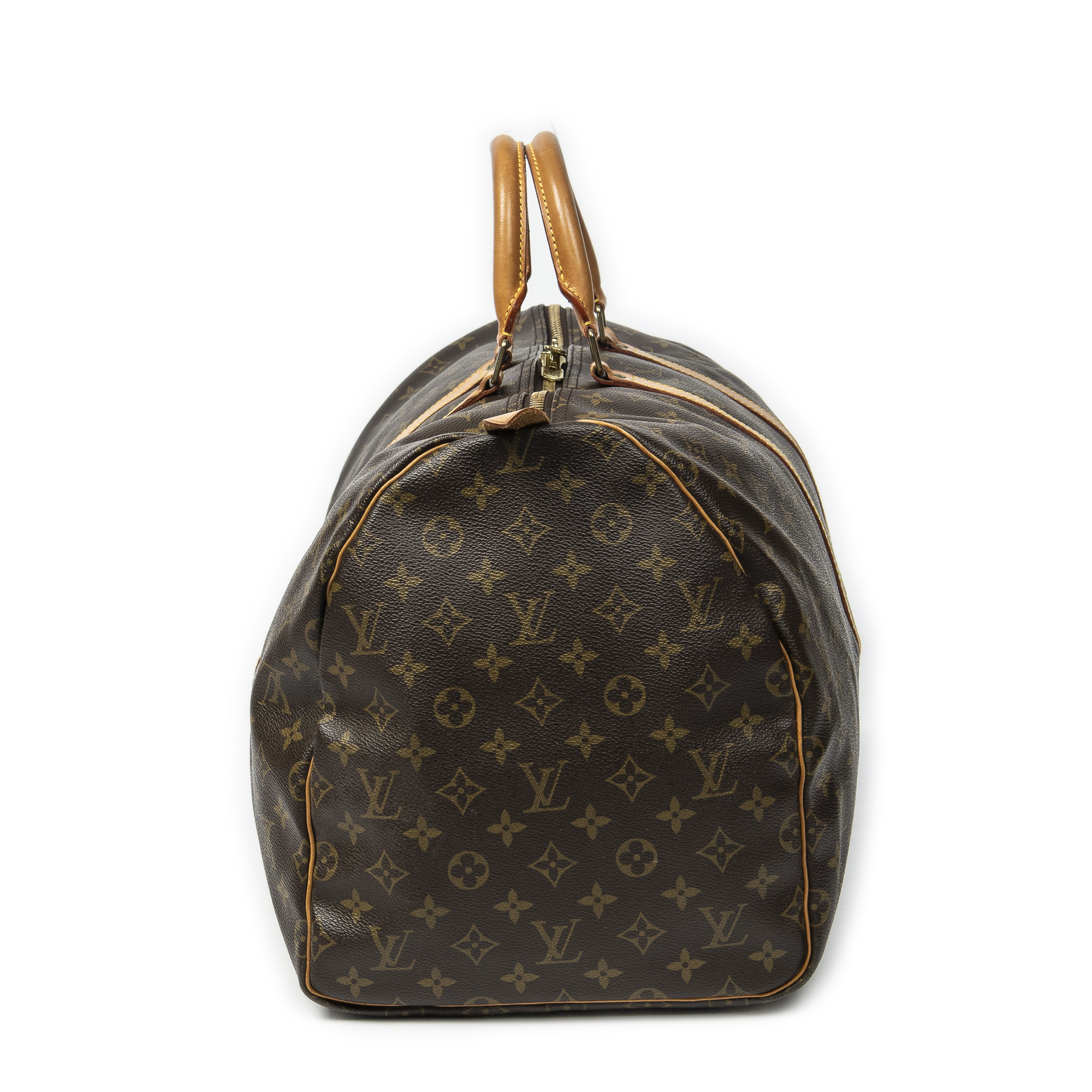 Louis Vuitton Travel Bag Keepall 55 in Brown Monogram Canvas and Golden Brass hardware. The product is in Very Good Condition (AB).