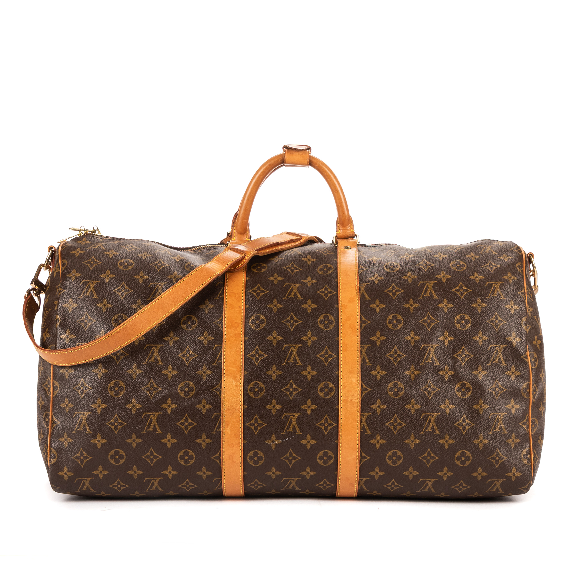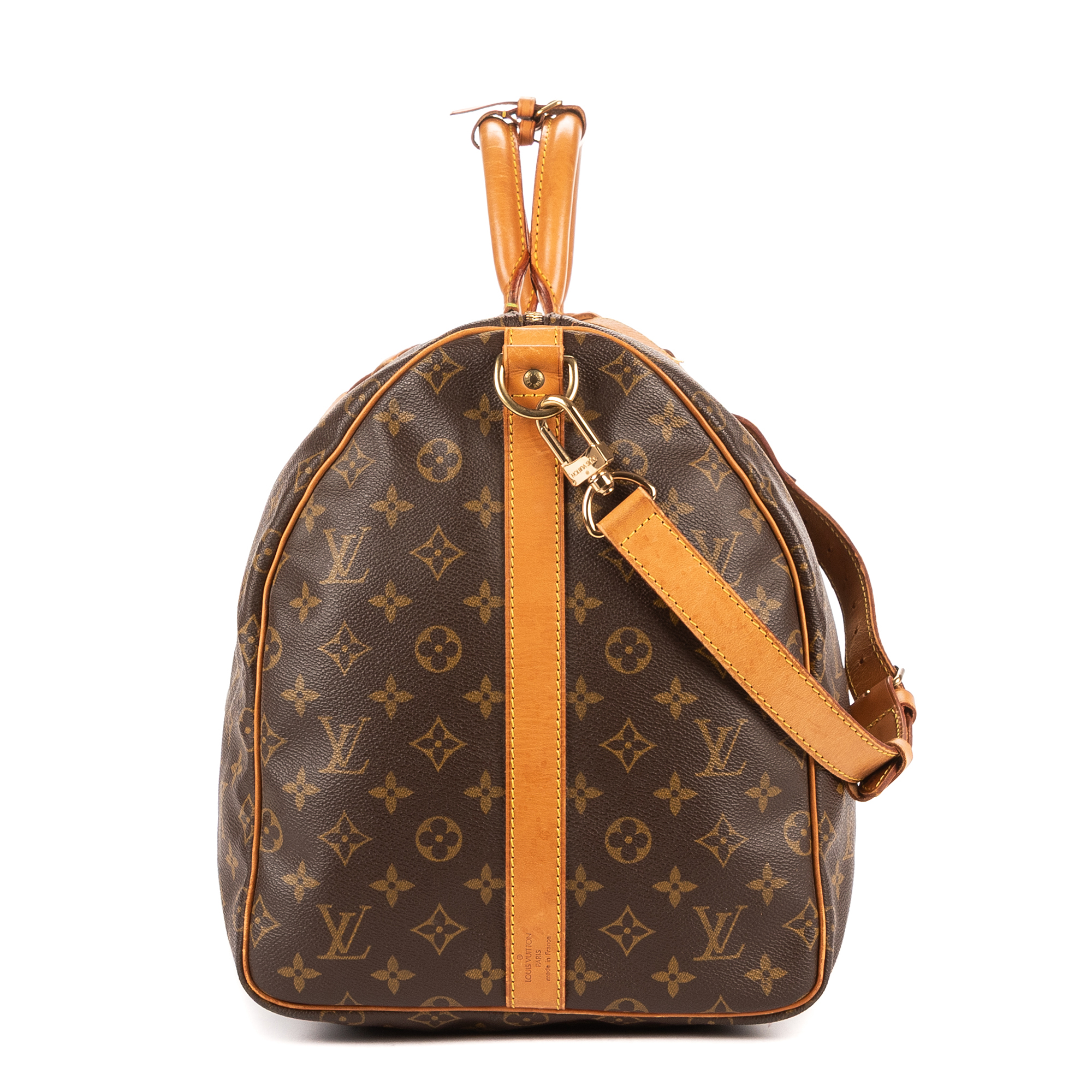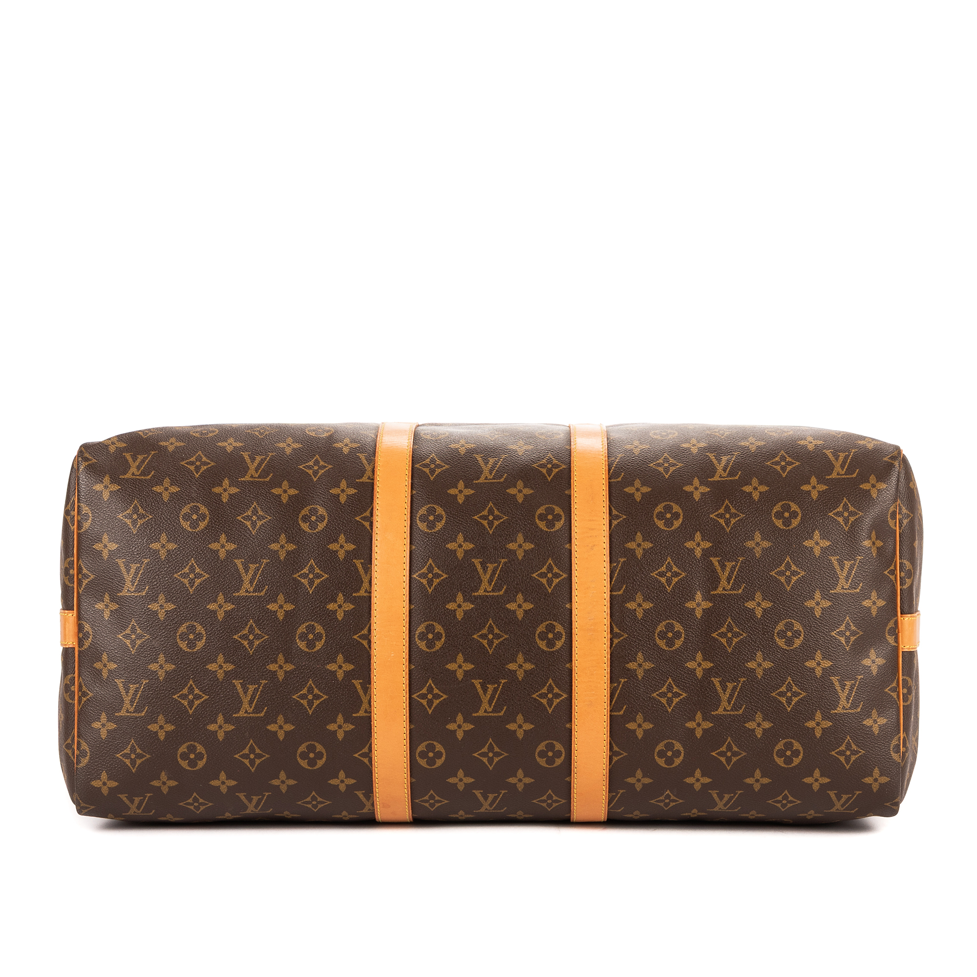 Louis Vuitton Travel Bag Keepall Bandouliere 55 in Brown Monogram Canvas and Golden Brass hardware. The product is in Very Good Condition (AB).