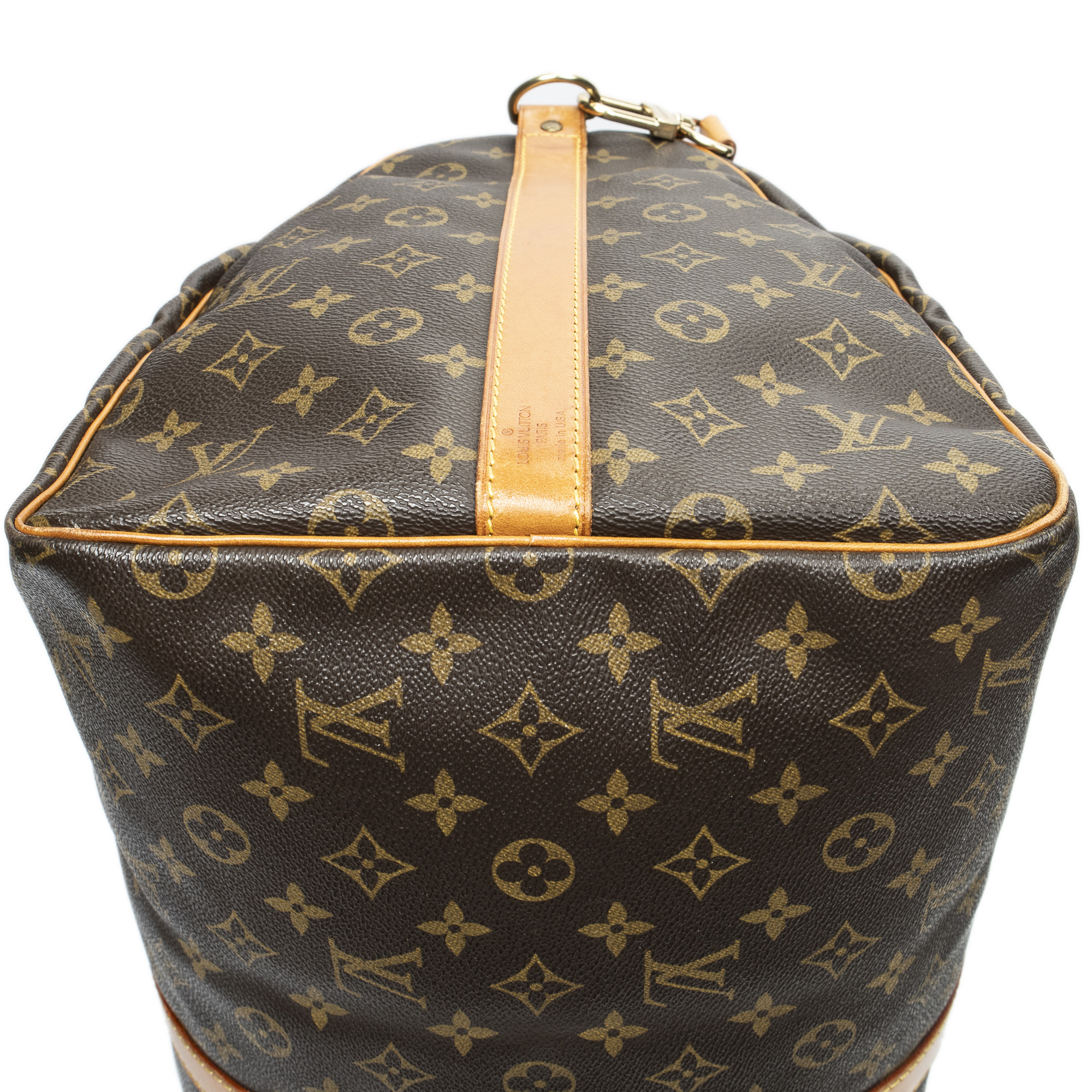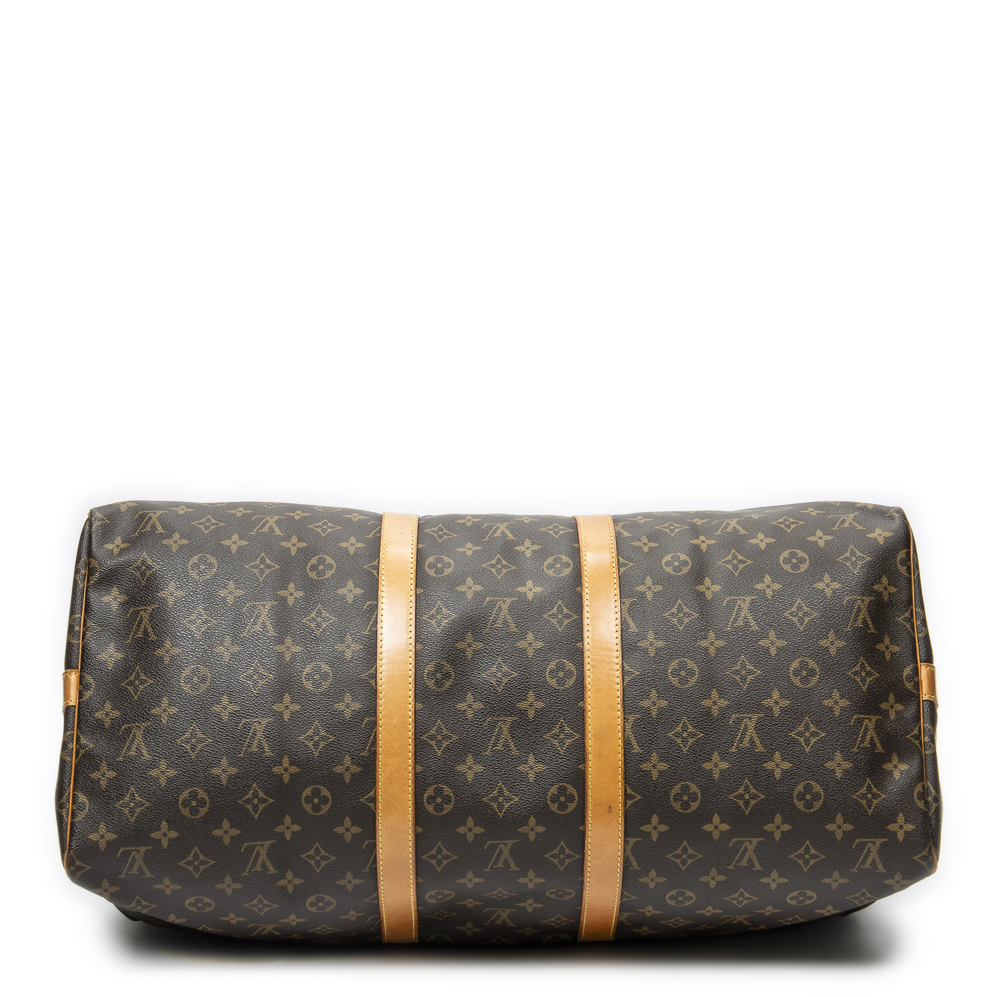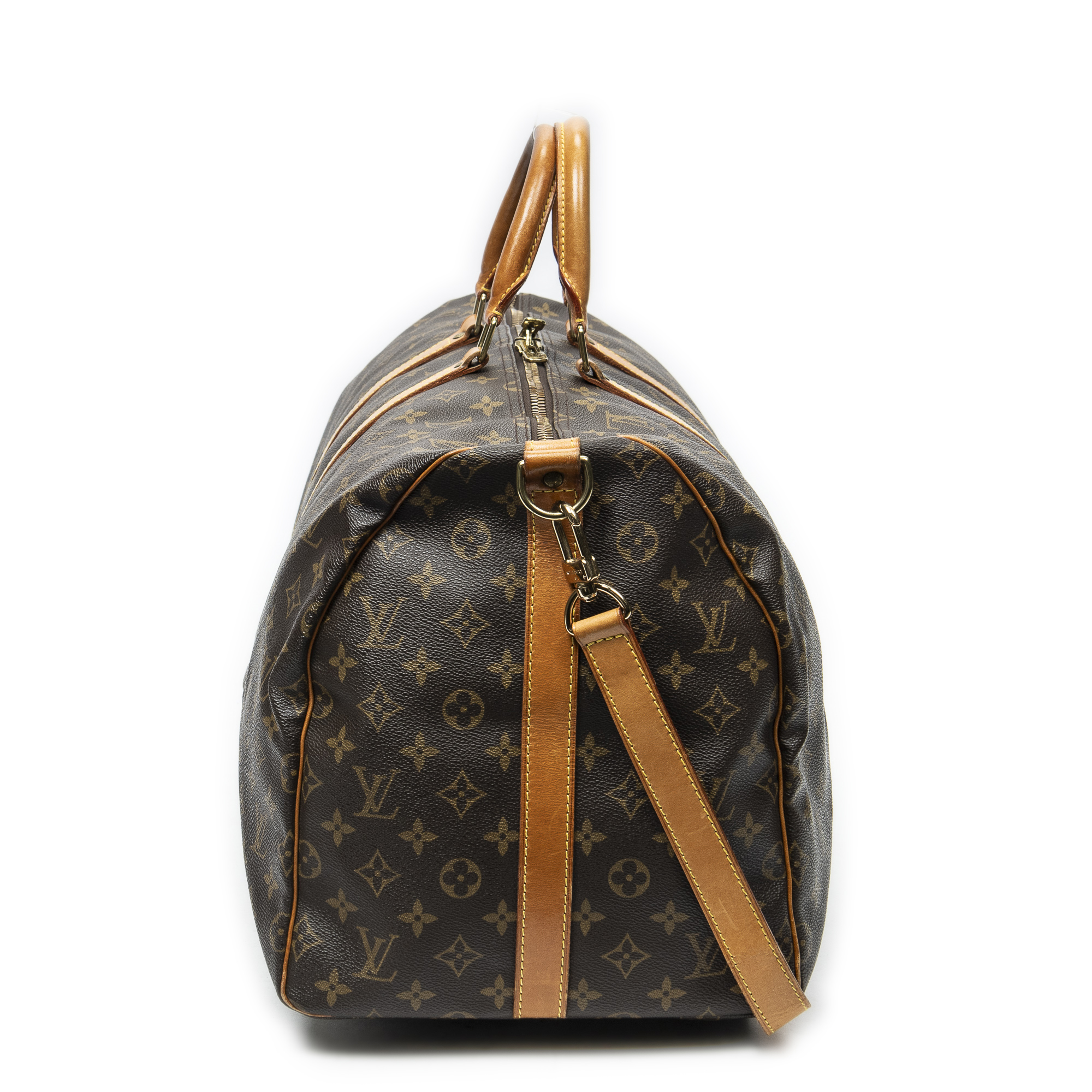 Louis Vuitton Travel Bag Keepall Bandouliere 55 in Brown Monogram Canvas and Golden Brass hardware. The product is in Very Good Condition (AB).