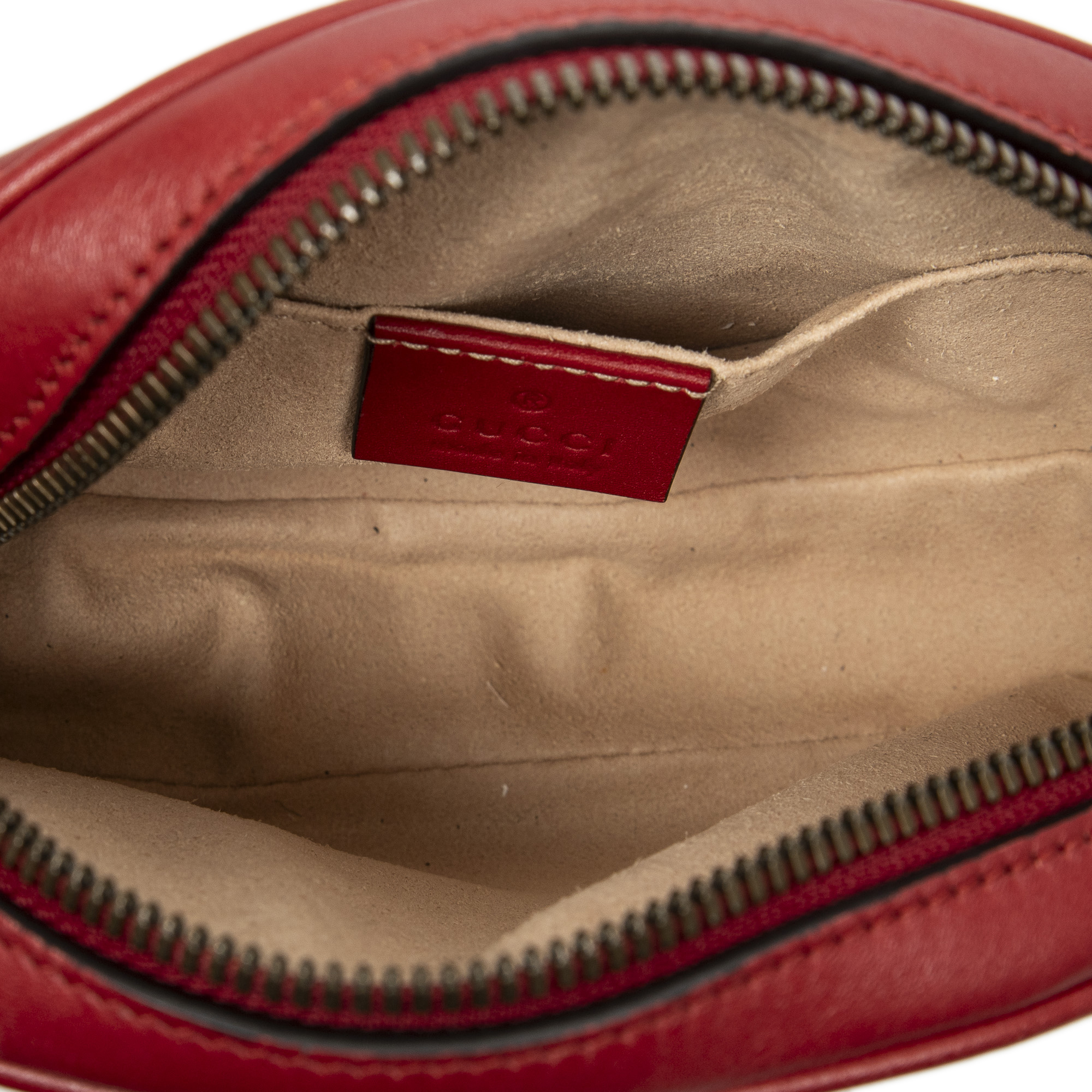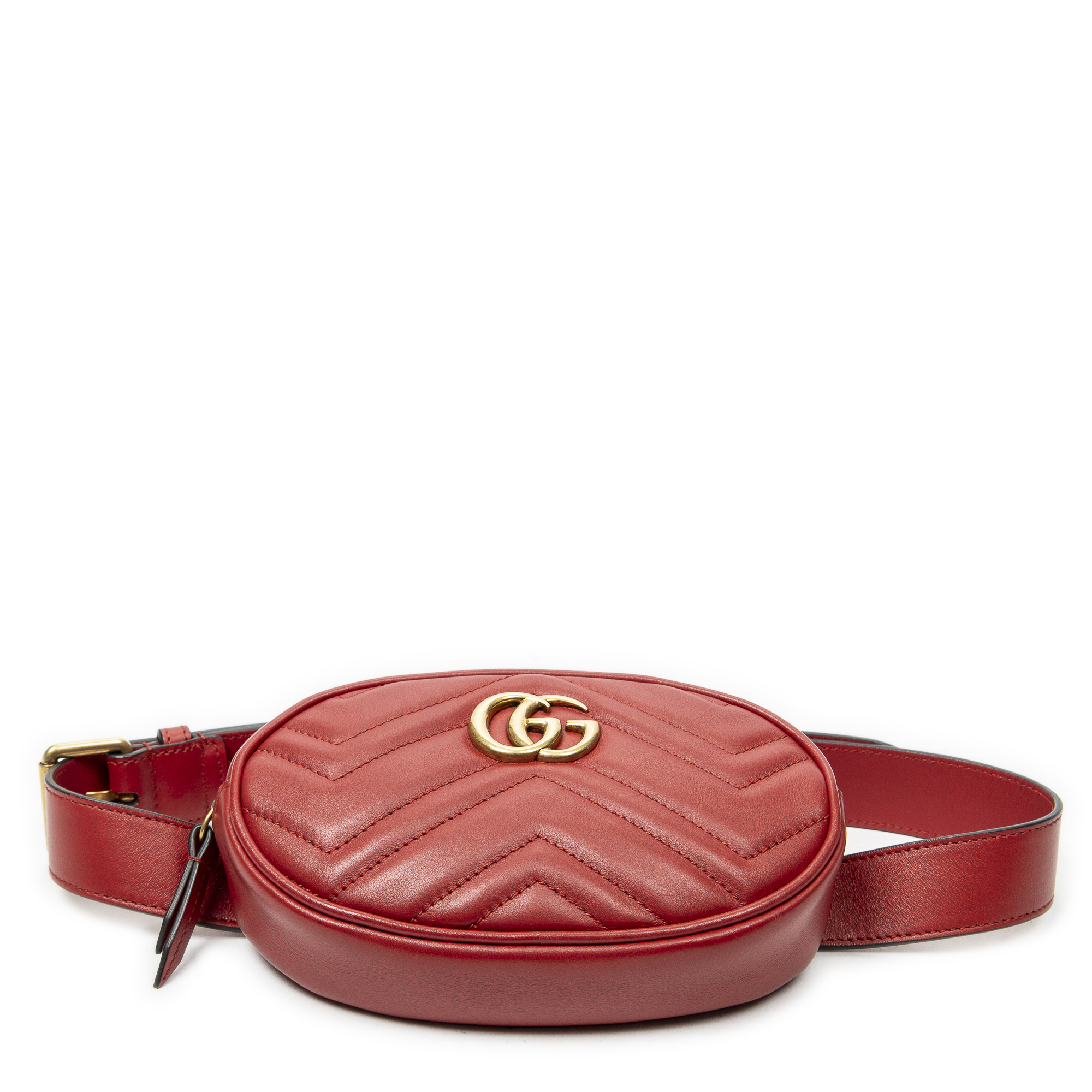 Gucci Waist Bag GG Marmont Belt Bag in Red Quilted Chevron Leather and Gold hardware. The product is in Excellent Condition (A).