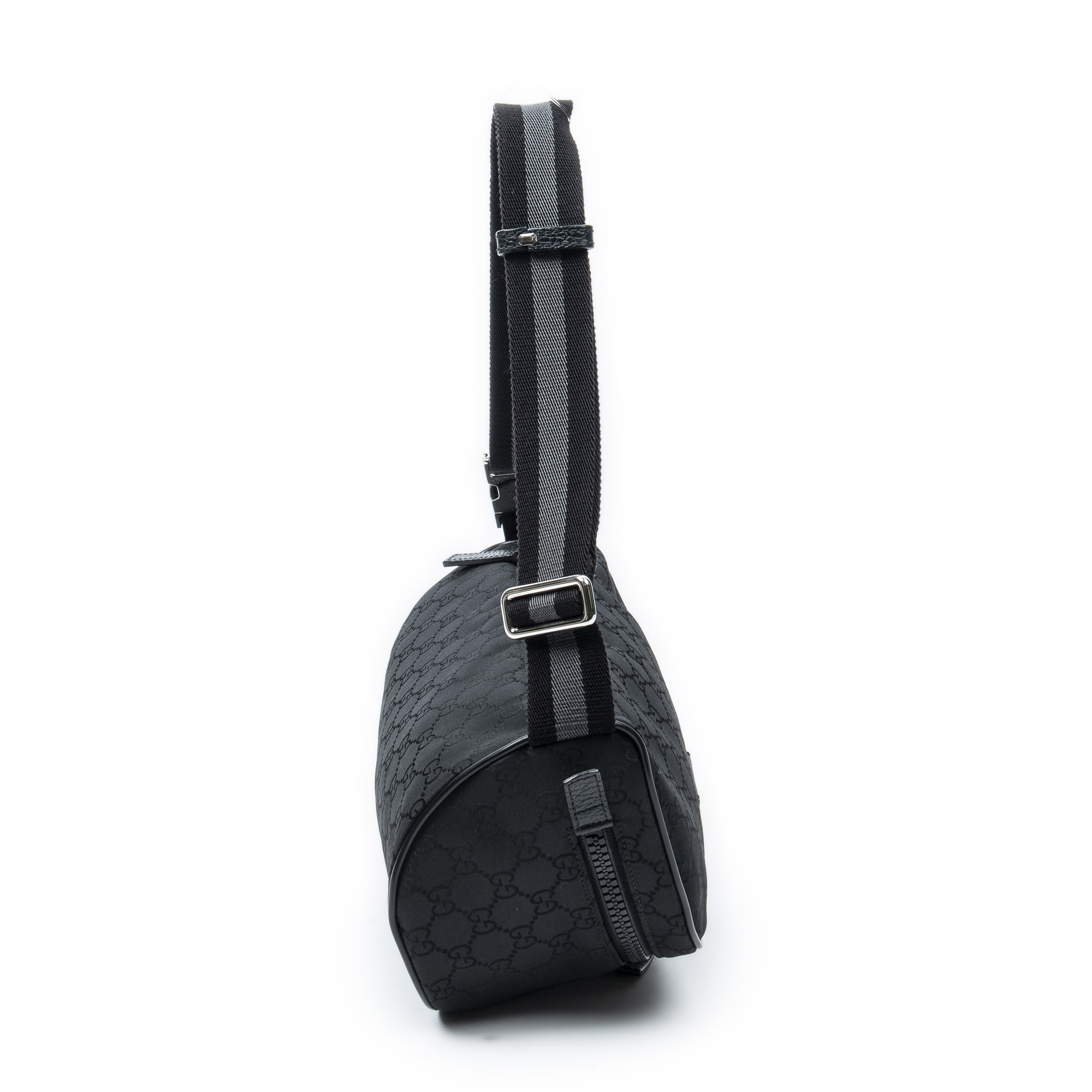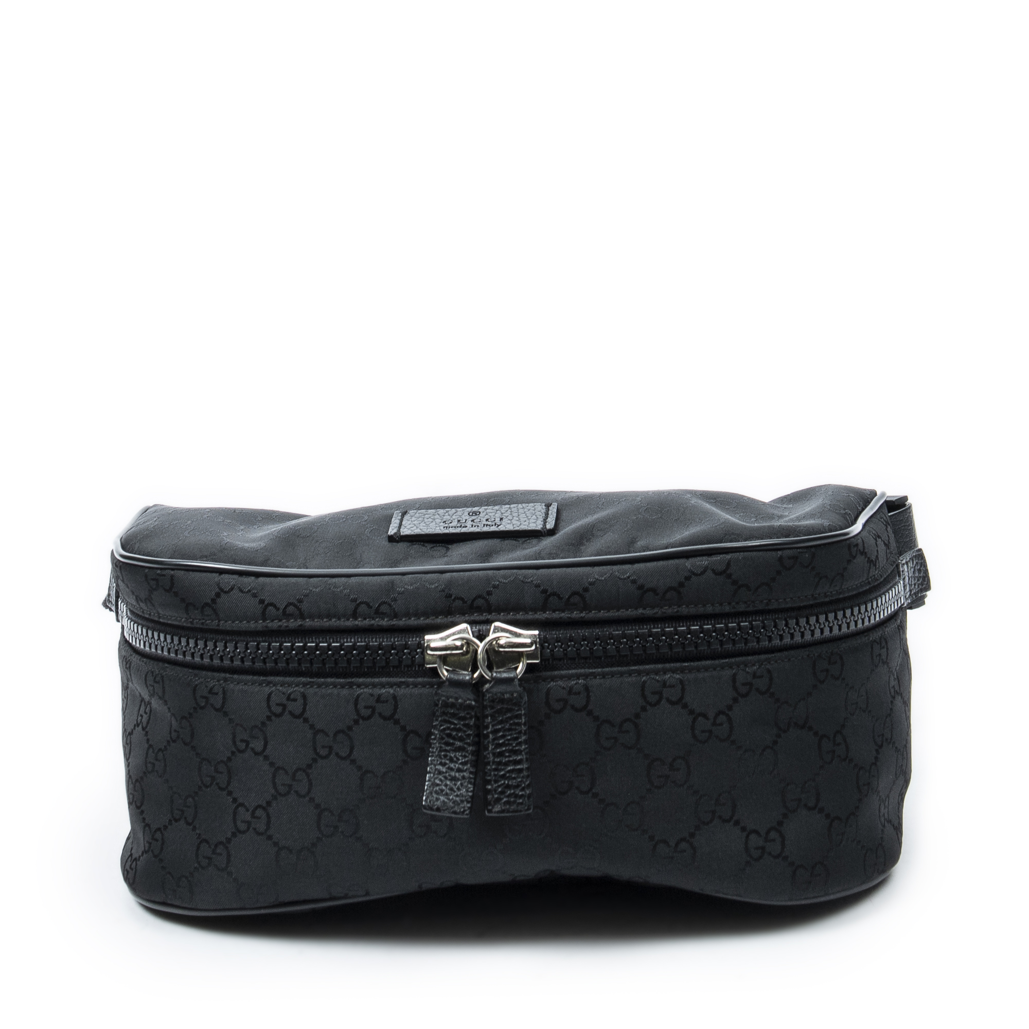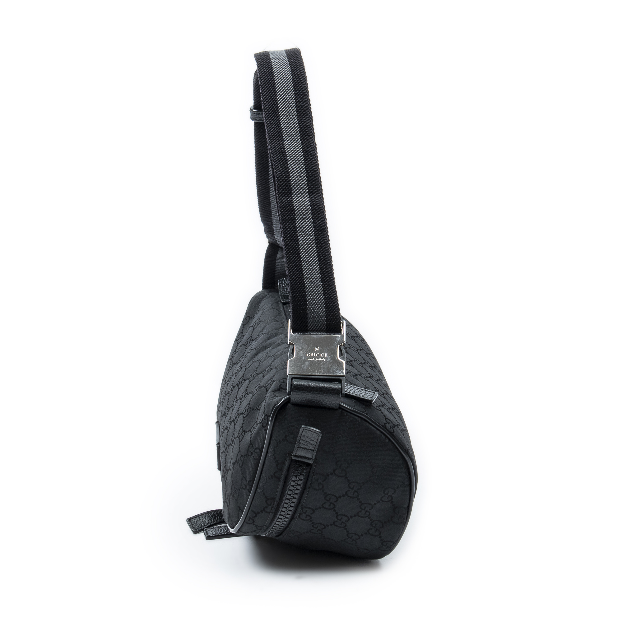 Gucci Waist Bag Web Belt Bag in Black Monogrammed Nylon Canvas and Silver hardware. The product is in Perfect Condition (AA).