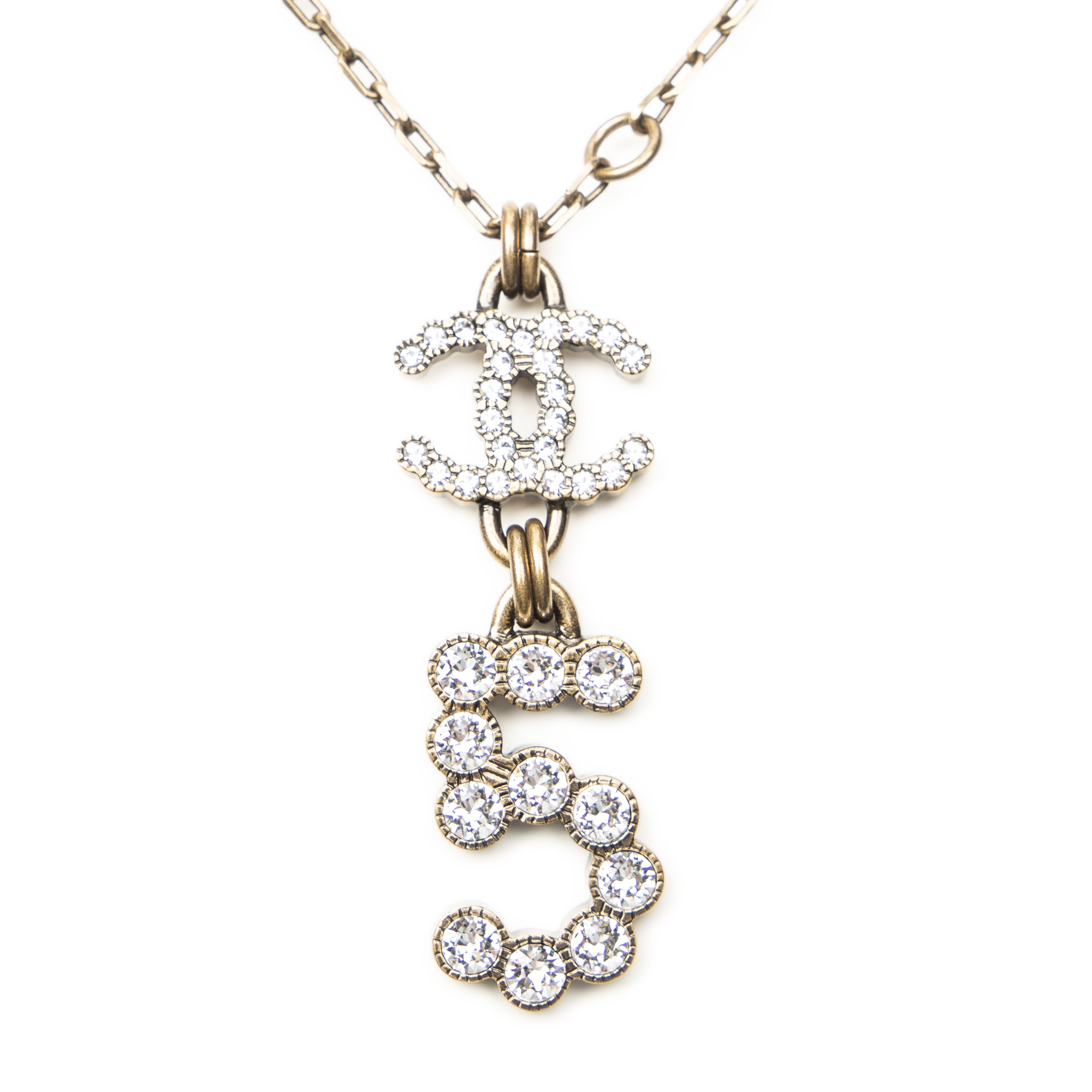 Chanel Necklace CC No. 5 Crystal Pendant Necklace in Gold Gold Plated and Golden Brass hardware. The product is in Excellent Condition (A).