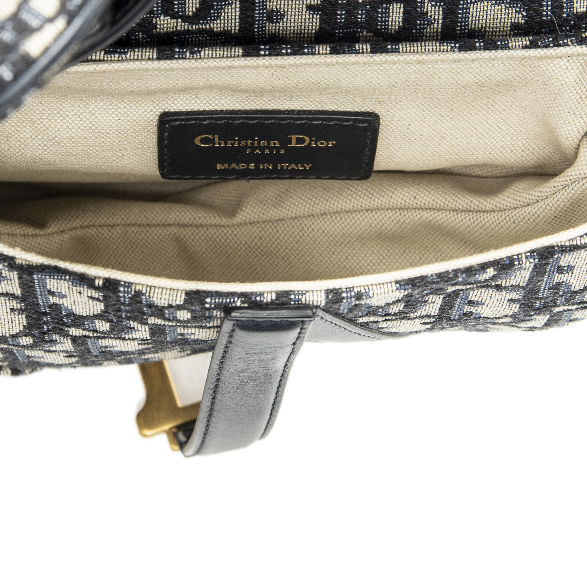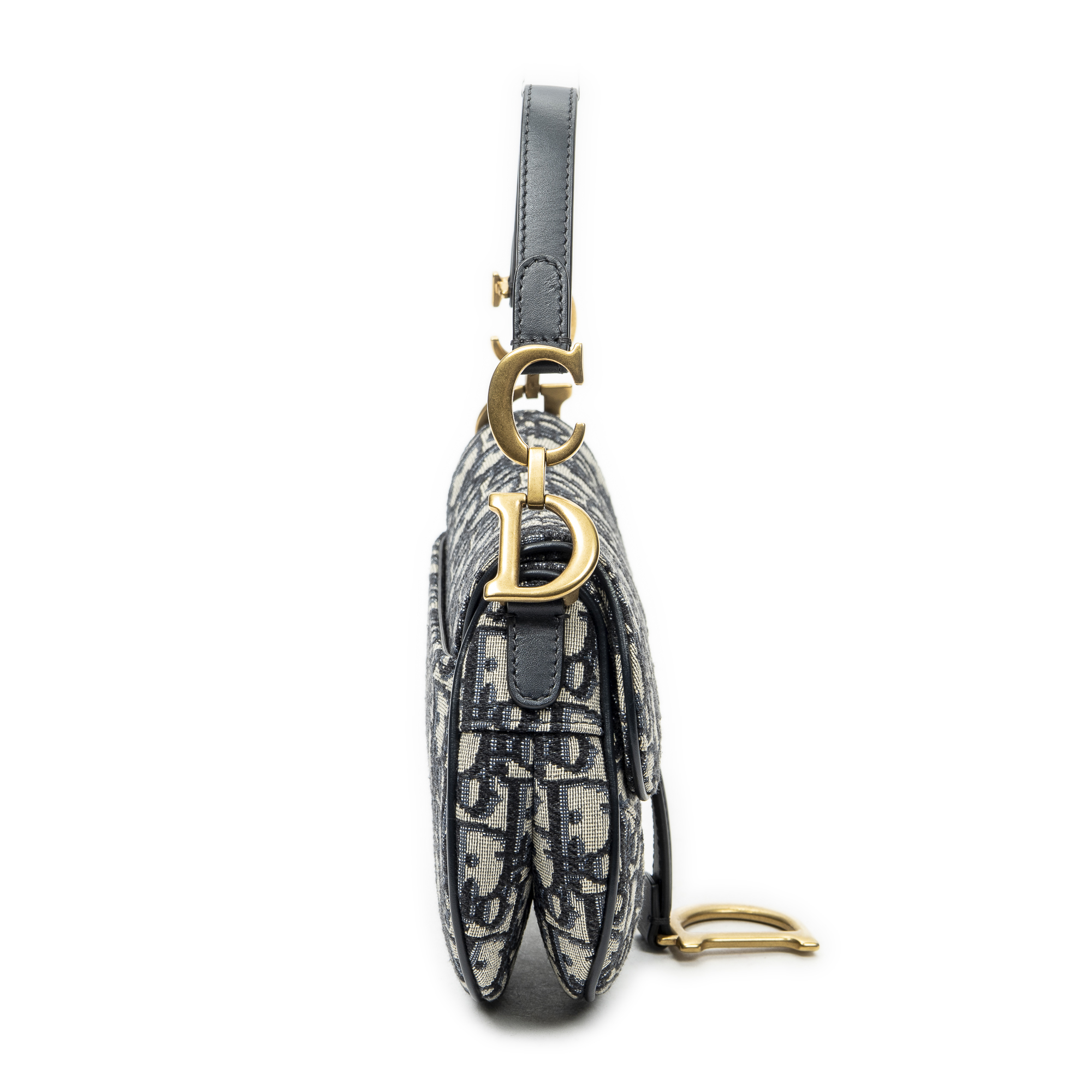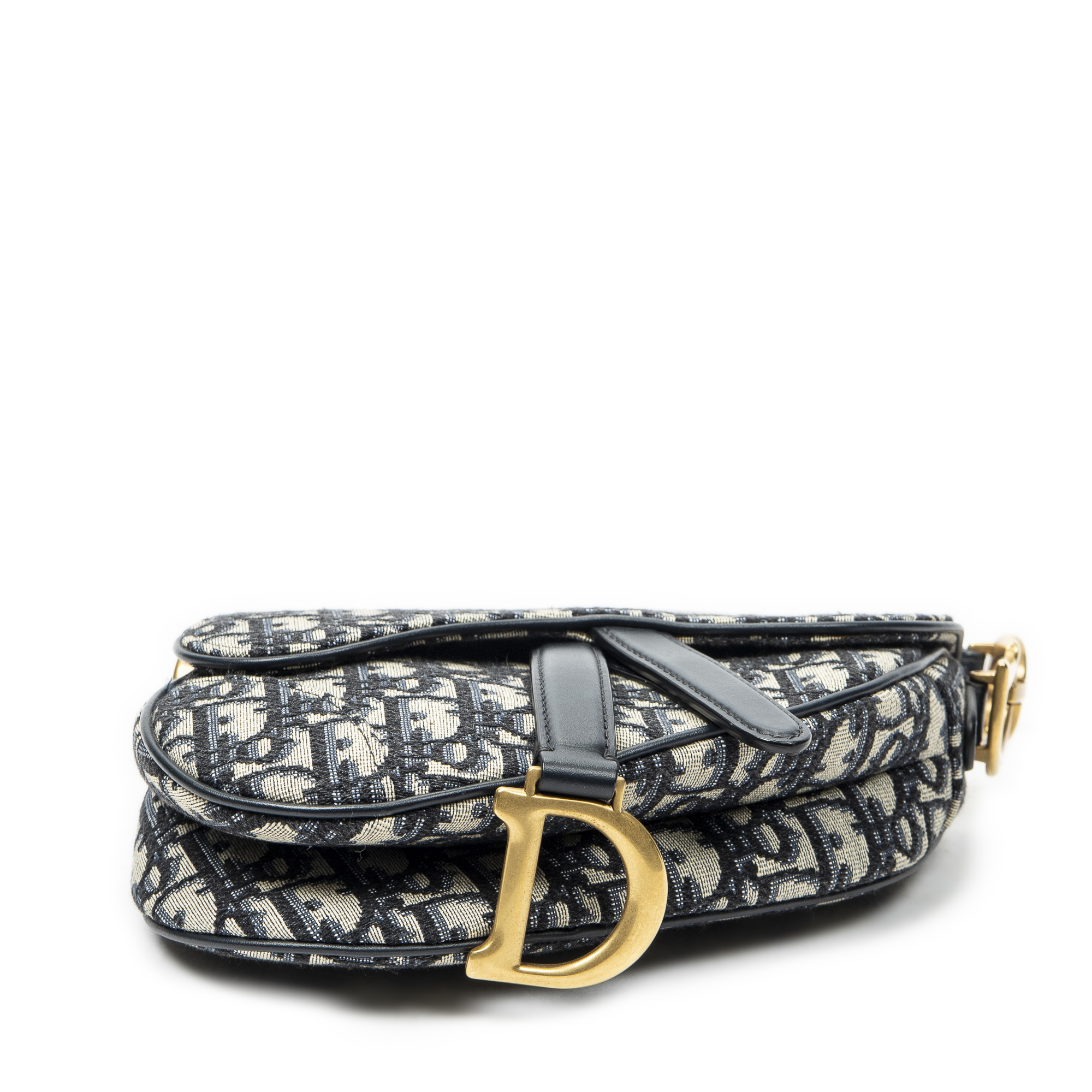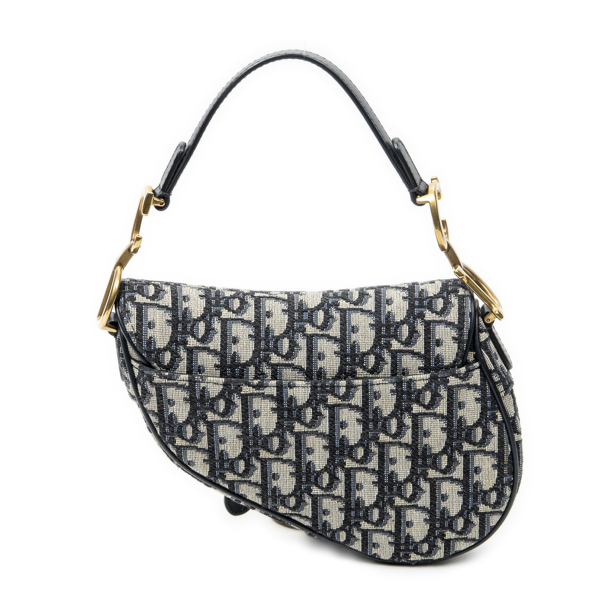 Dior Shoulder Bag Mini Saddle Bag in Navy/Beige Oblique Jacquard Canvas and Gold hardware. The product is in Excellent Condition (A).